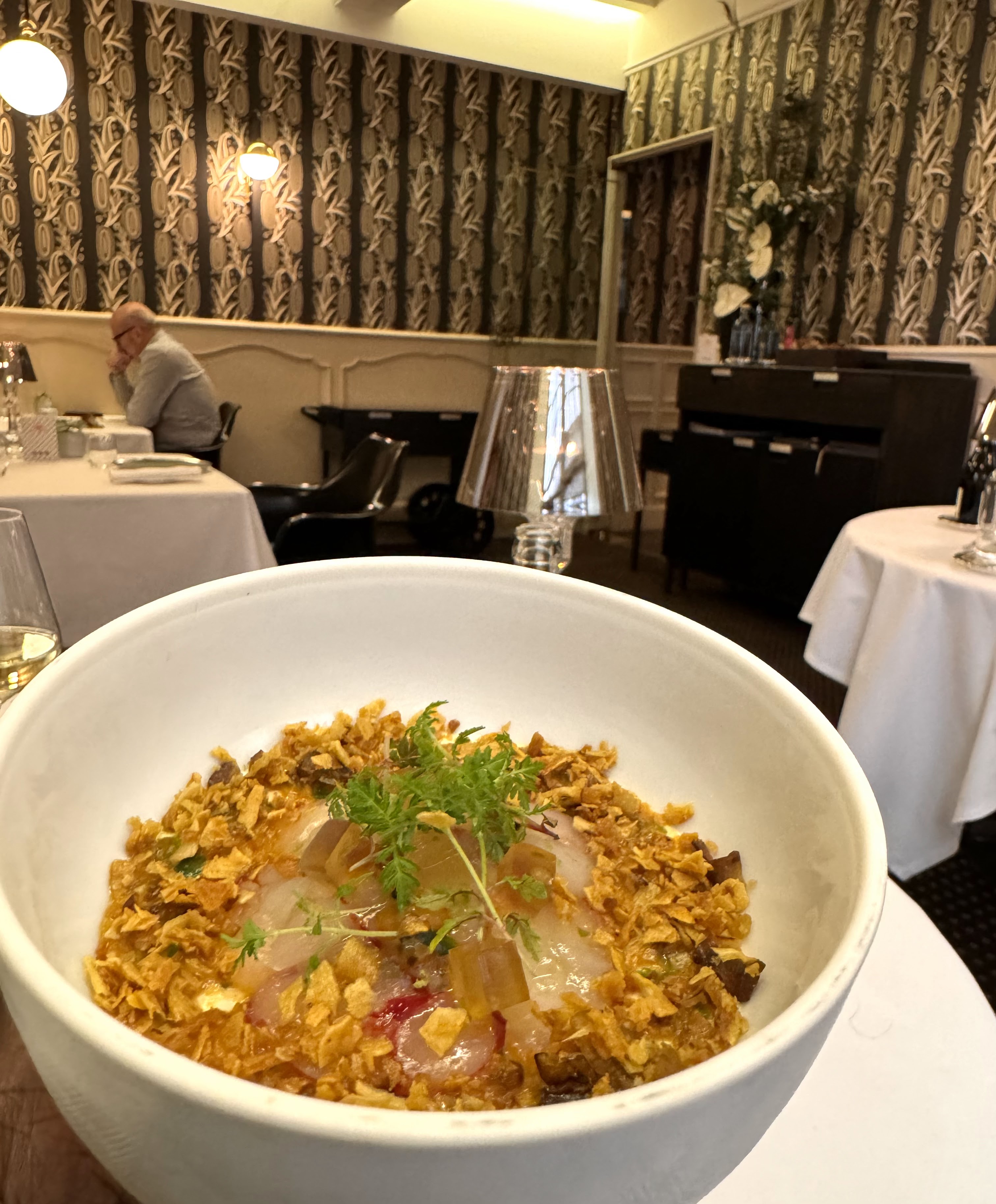 Nous avons mangé ici récemment et c'est véritablement un hommage à la cuisine française classique. La nourriture était merveilleuse, impeccablement présentée et le service de première classe. Nous avons eu le Menu Classique qui était déjà assez copieux donc pas sûr que nous aurions réussi le menu dégustation ! Il semble un peu critique de dire que la nourriture n'était pas trop excitante dans le sens où elle est tellement classique que ce que vous commandez est ce que vous obtenez - mais vraiment savoureuse et jolie. C’est bien sûr cher.