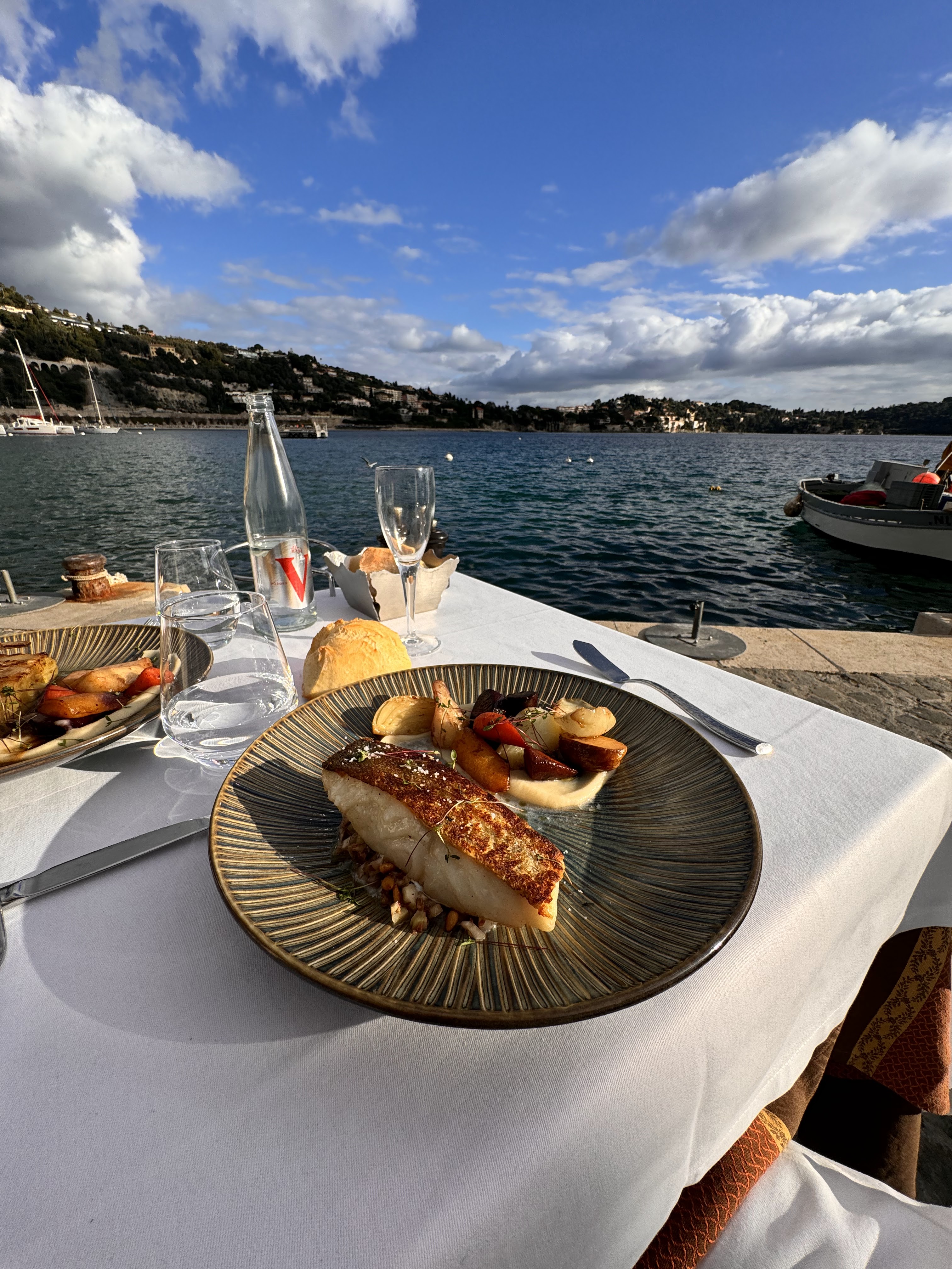Nous avons pris un beau repas ici dans un cadre très sympa sur le port de Villefranche. Le service était parfait. Personnel très attentionné et sympathique. Nous avons partagé un plat principal de Turbot avec pommes de terre et légumes, accompagné de sauces. C'était absolument délicieux et le poisson était parfaitement cuit. Belle sélection de vins aussi. Cet endroit est assez cher mais vaut vraiment le coup. Je recommande fortement.