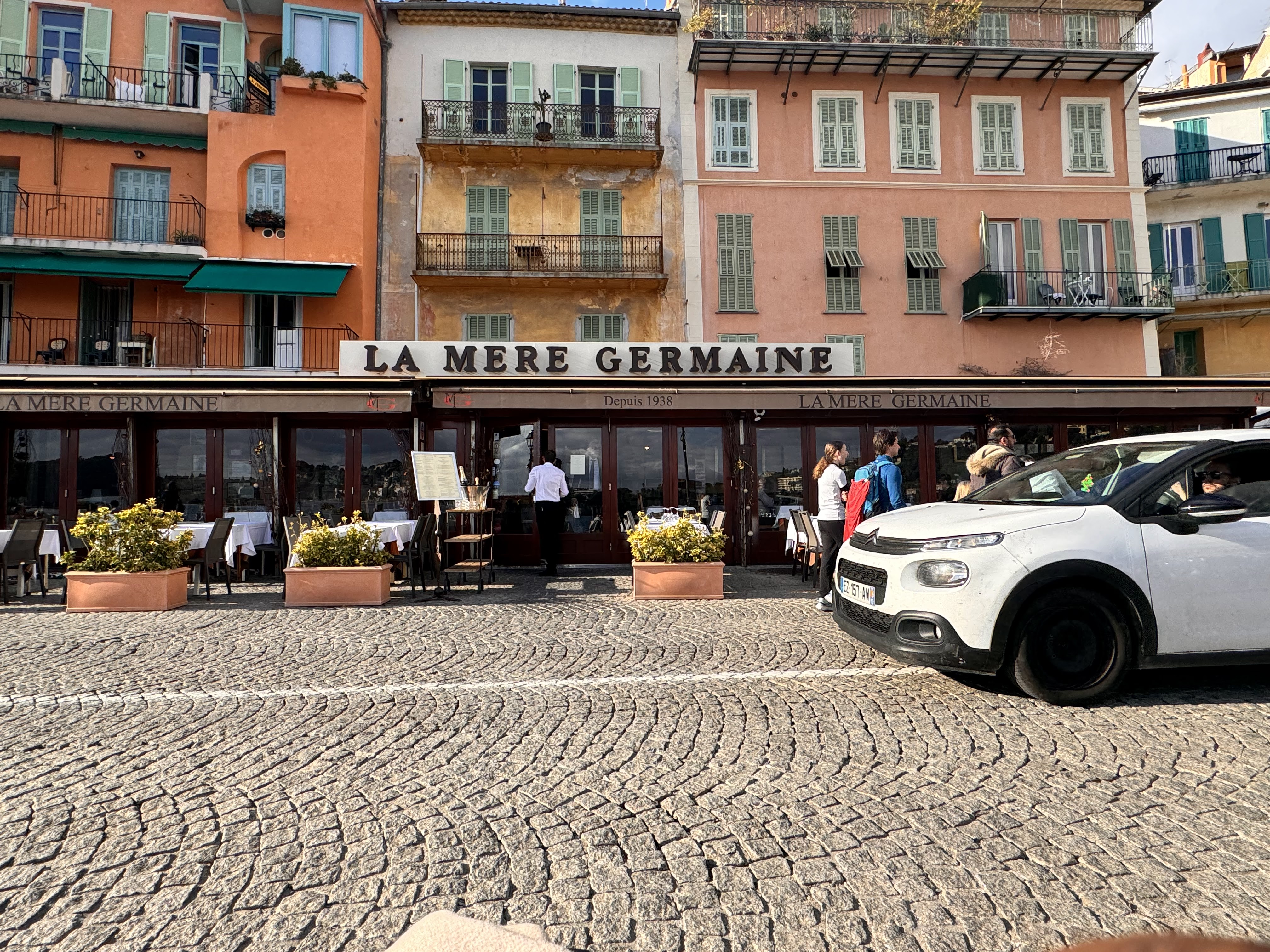 La mère Germaine sur le port de Villefranche-sur-Mer jouit d’avoir été la table de Jean Cocteau . Les guides touristiques sont dithyrambiques quand il s’agit de parler de ce restaurant. Dans la vraie vie , on se retrouve le long de la route et le nez dans une carte totalement hors de prix . 190 euros la bouillabaisse pour 2 . La spécialité du lieu!! Nous avons donc opté pour le menu à 56 euros ( oui il y en a un !) . Soupe de poissons , curry de petites gambas, fondant chocolat . Rien de palpitant vraiment : la soupe de poisson étant la base de la bouillabaisse ça donne une idée du plat final et nous en avons mangé des bien meilleures pas très loin . Mais compliqué de donner une note culinaire globale tant nous avions conscience d’être les meubles pauvres de la soirée ! Peut être que le homard était bien cuit 😂. Je n’ai pas fait de photos des plats . Pas de sujet . Une note positive pour le service . Une armée sympathique:) En résumé , si vous avez encore un petit peu de papilles et de raison, évitez l’endroit . Passez devant, vous aurez l’ambiance et vous n’aurez rien à regretter 😉