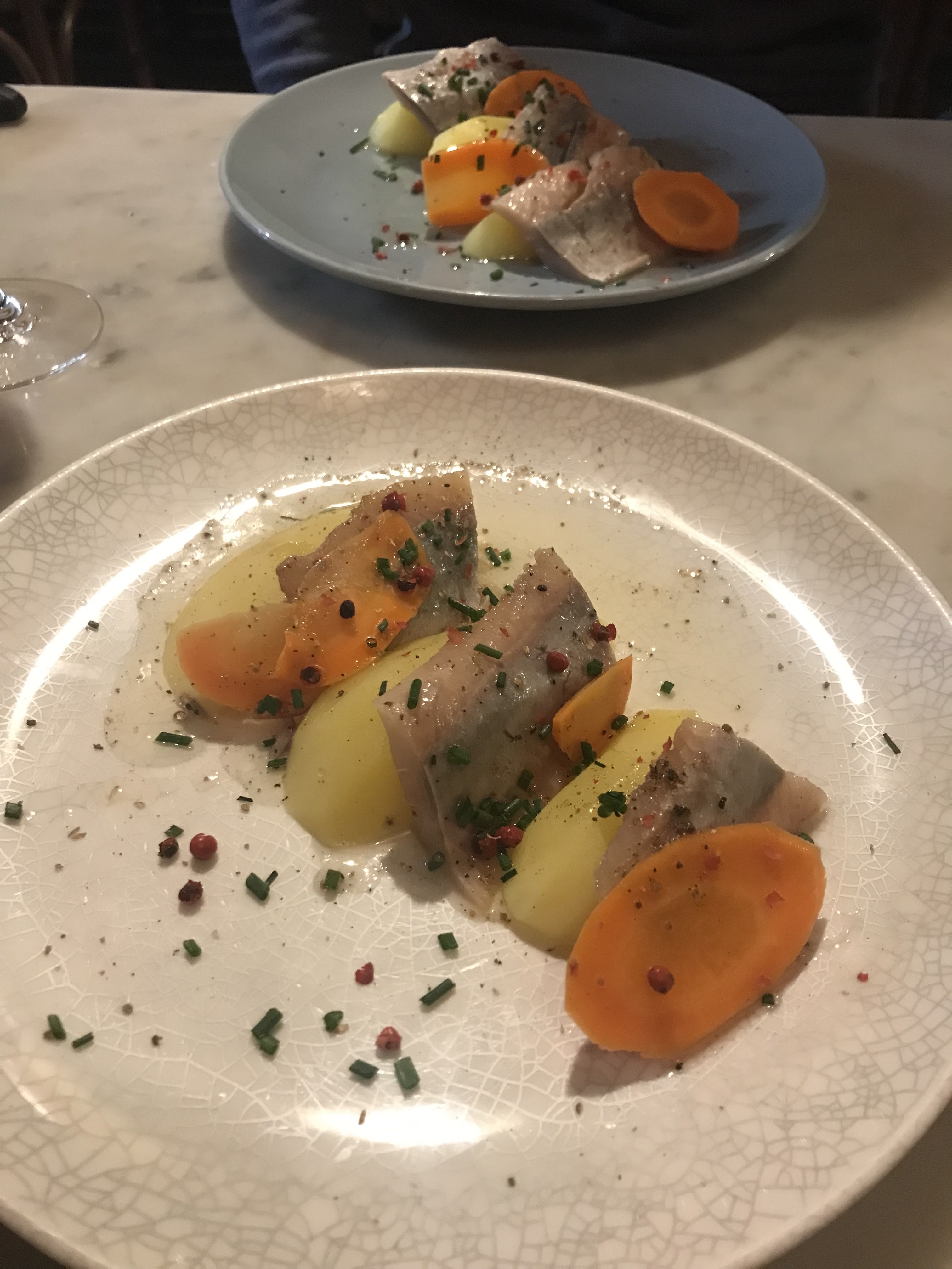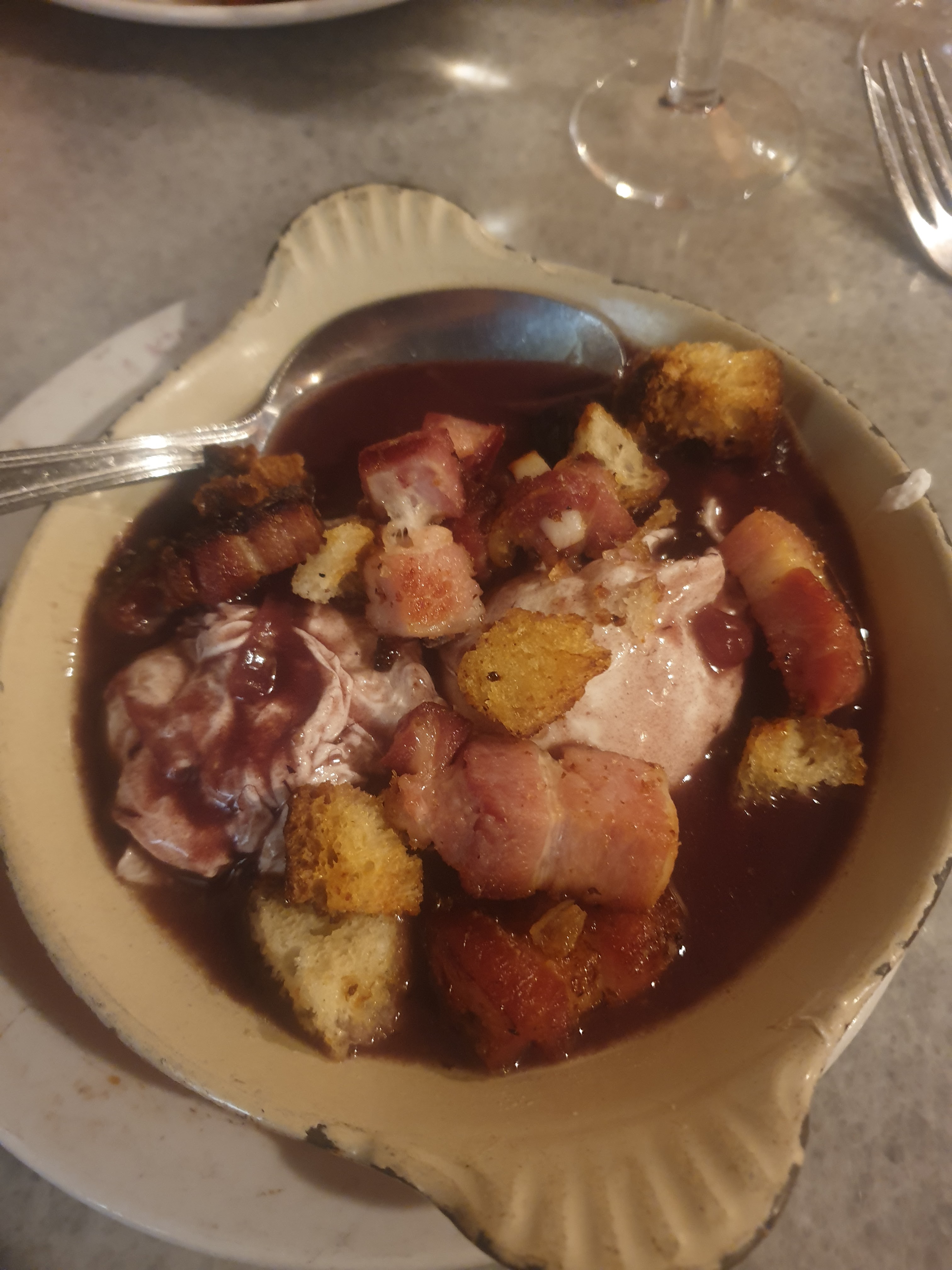 Que dire entrée oeuf meurette ( je crois ) j'ai jamais mangé une entrée aussi bonne vraiment chapeau ! Plat très bon aussi pour ma part il manque vraiment sur le dessert dommage la touche finale c'est le seul petit point négatif et sinon bravo en cuisine !!!