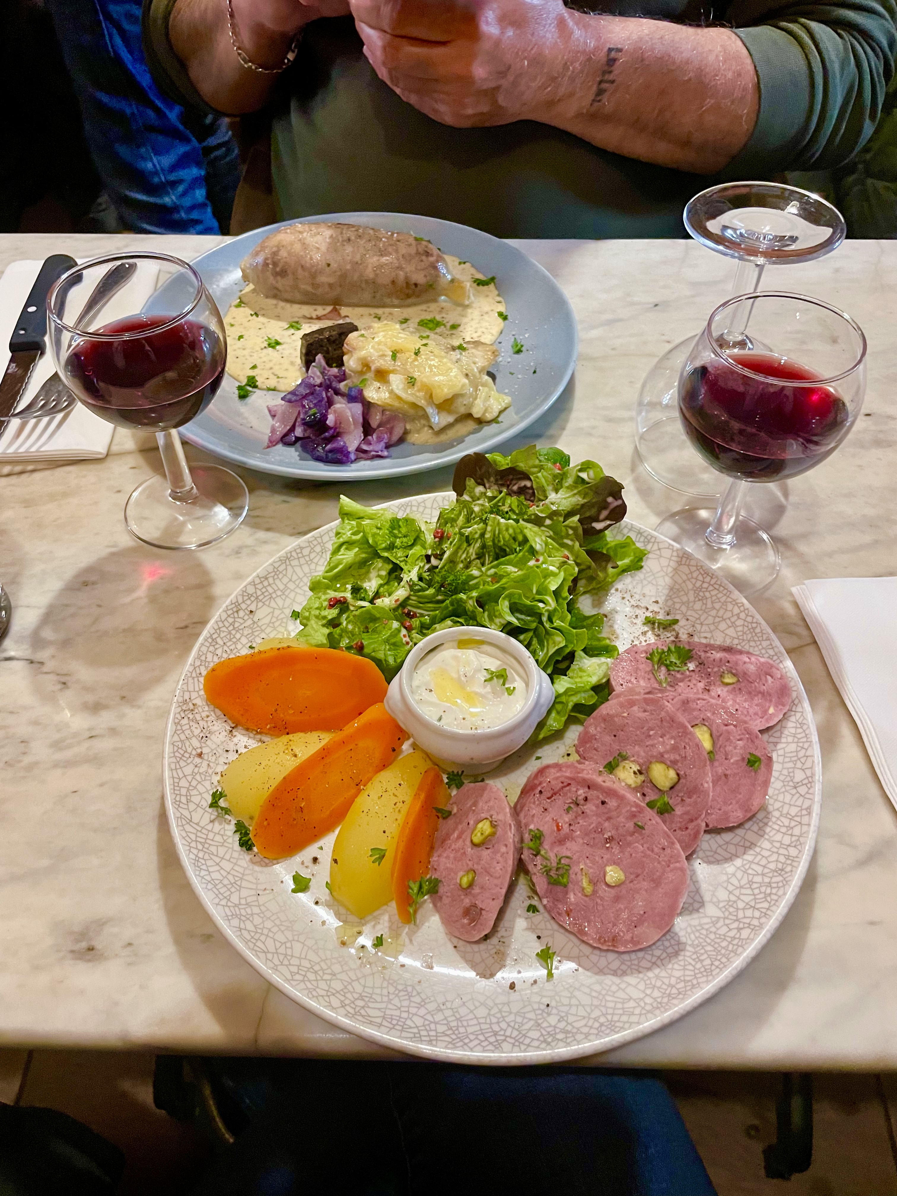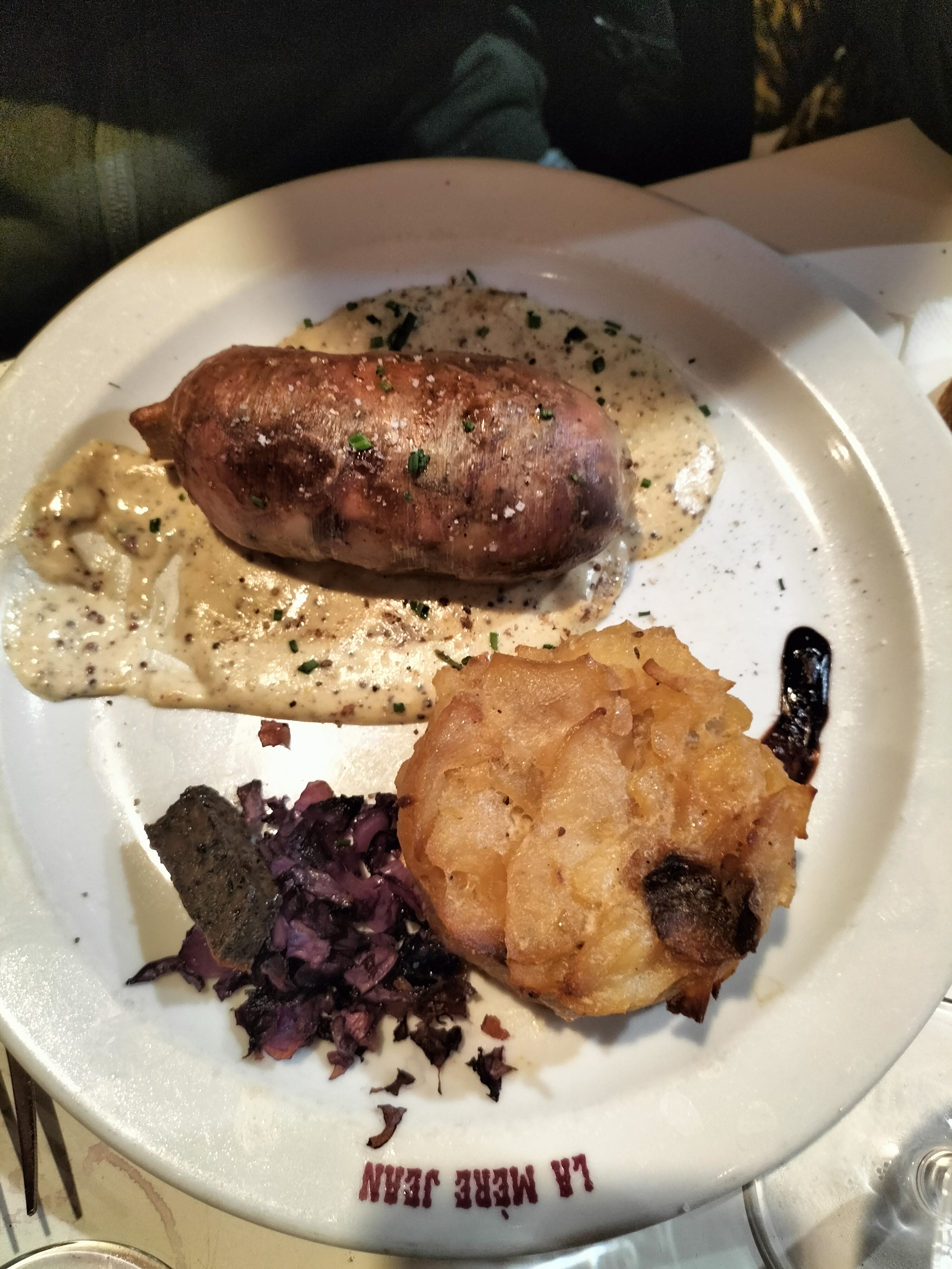 Nous avons mangé en terrasse, pensée a réserver pour manger à l'intérieur. La saucisse chaude est excellente, les tripes dont je suis pas fan et bien sont délicieuses, ainsi que le boudin noir. Je vous le recommande vivement. La patronne est très sympathique, comme les serveuses...