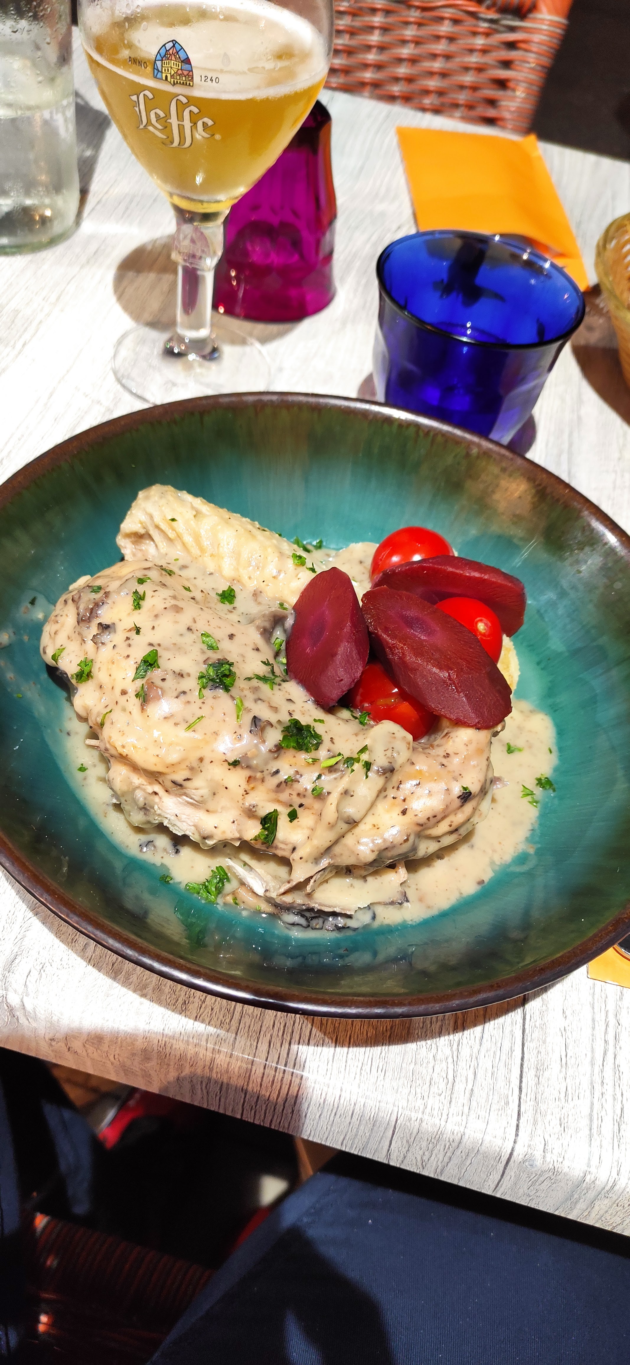 Jour de marché à Louhans. Menu du marché : 24 € terrine campagnarde : très bonne Boeuf bourguignon pour mon ami : Bon Poulet de Bresse à la crème, frites pour moi (surplus3€) : c'est là que ça se corse : pas de frites , juste un peu de purée, poulet bon, mais pas de sauce à la crème, une vulgaire sauce, faite avec du beurre et de la farine, à laquelle on avait ajouté du bouillon et peut-être un peu de crème. le surplus ne se justifie pas Poulet à crème ne se fait qu'avec de la crème, et de Bresse si possible , on est dans la région. Dessert : tarte au cassis: très bonne.