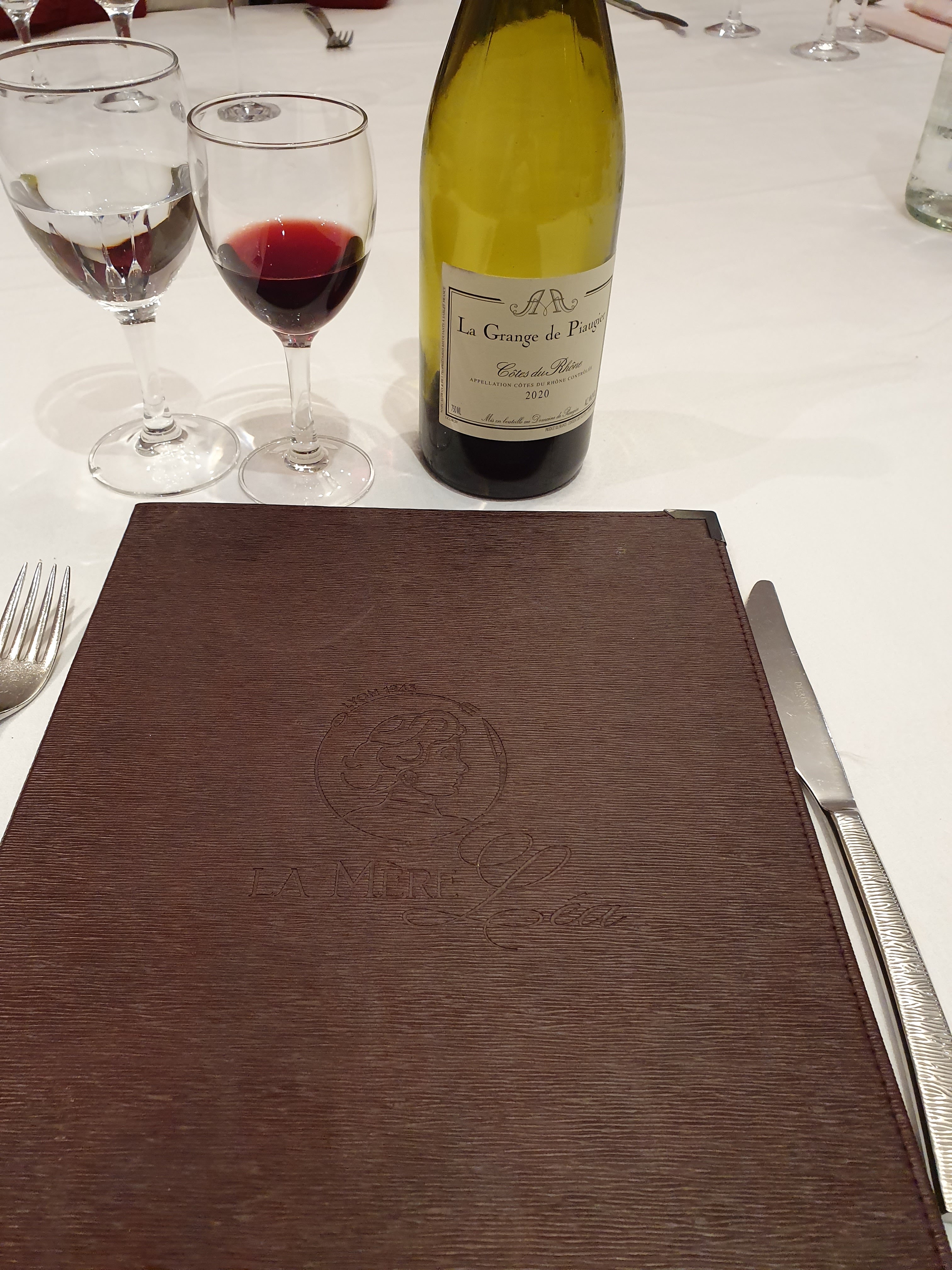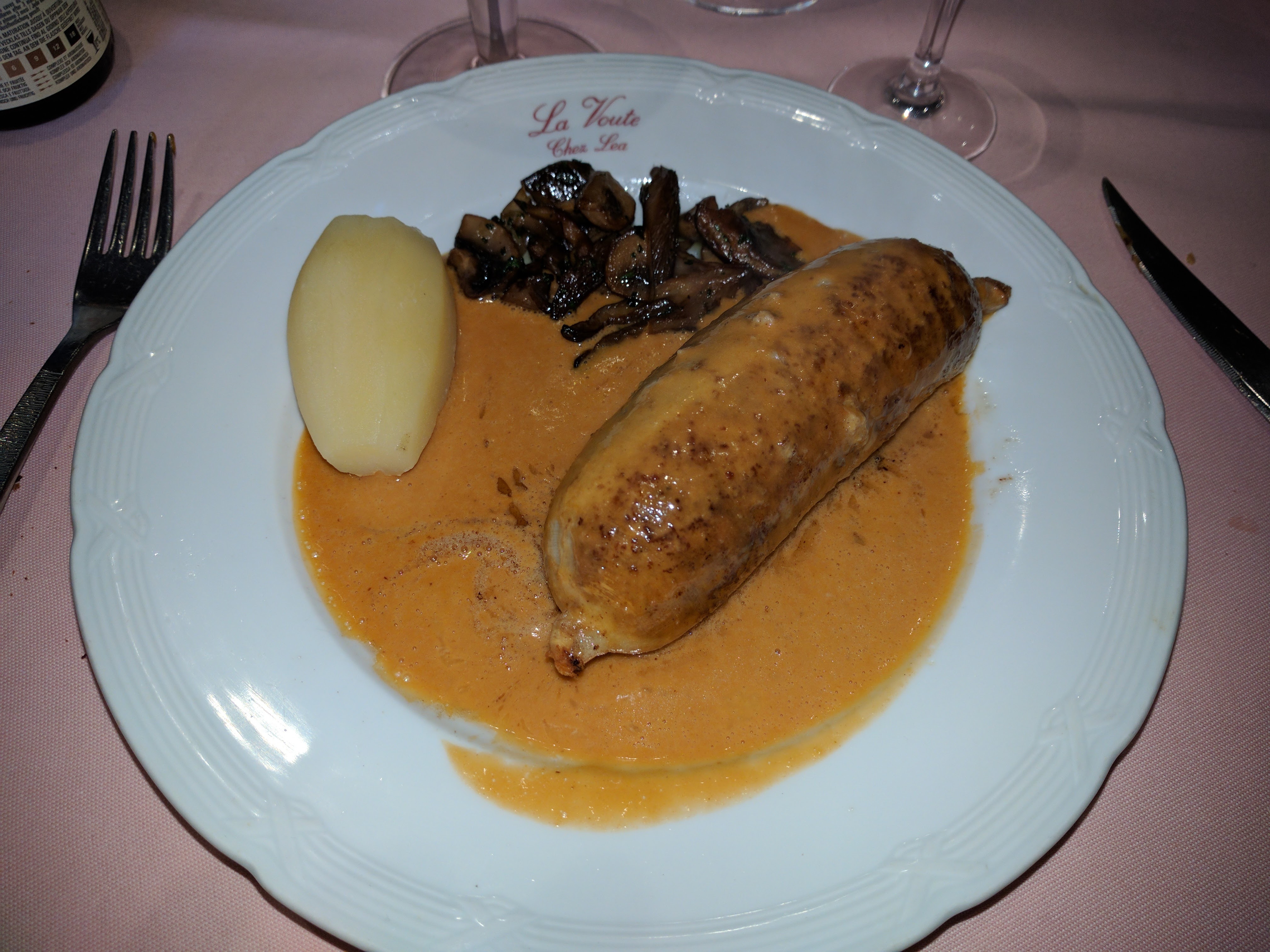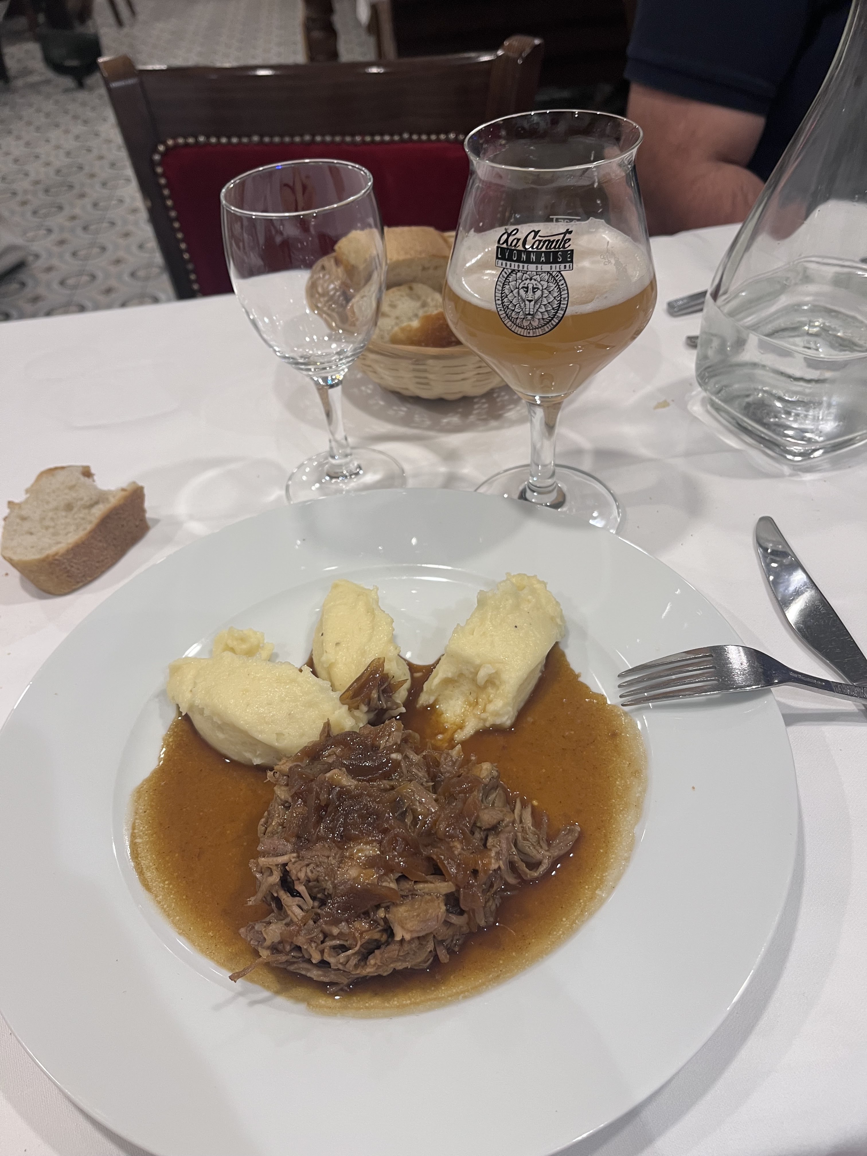 C’est un vrai bouchon qui a le label « bouchon lyonnais ». La serveuse était vraiment très gentille et avait pris en compte que j’étais enceinte et que tout devait donc être bien cuit. Je n’ai pas pu prendre de menu, mais à la Carte, la quenelle est un must et en dessert les œufs à la neige en praline!