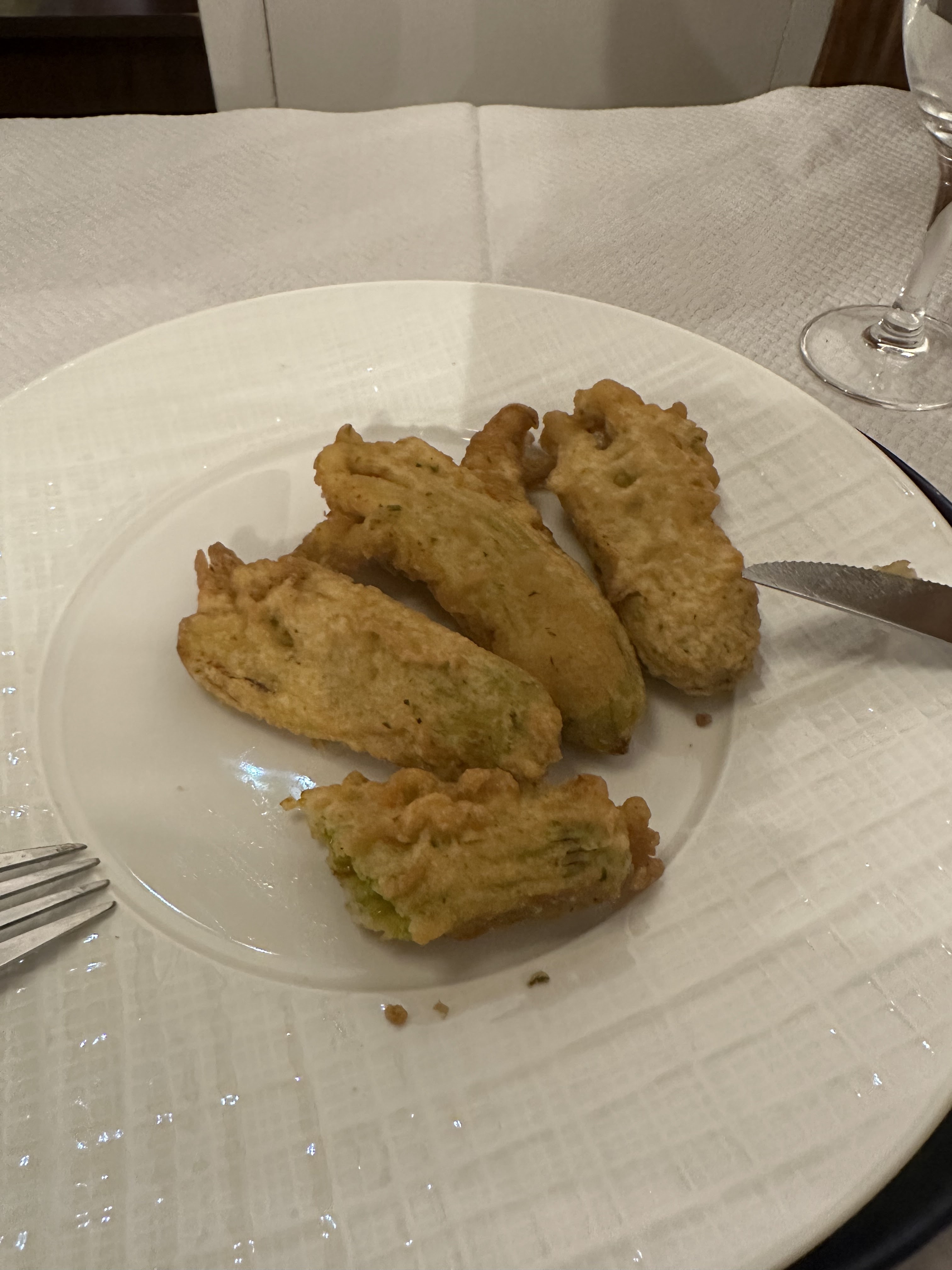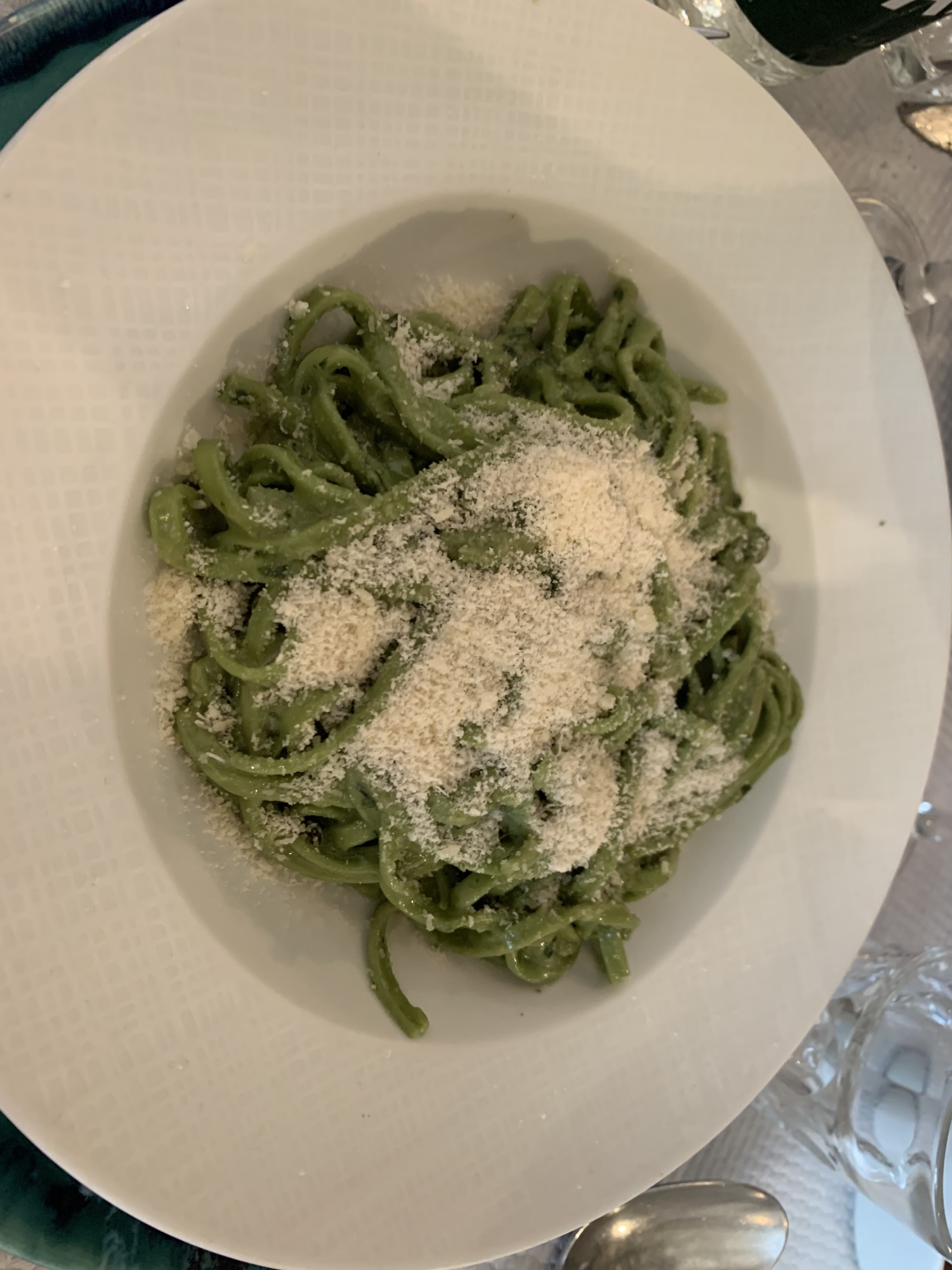 La nourriture : Nous avons commencé avec les fleurs de courgettes et une salade tiède de ricotta ou de fromage de chèvre (je ne me souviens plus quel fromage a été utilisé). Les fleurs nous ont époustouflés à quel point elles étaient bonnes - elles ont mis un bol de sel marin à saupoudrer sur les fleurs à votre goût. La salade était également très bonne. Ensuite, il y avait un plat de bœuf pour moi et les Linguini verts de base pour ma copine ! Le mien était bon, mais le Linguini - oh mec. Pas lourd en sauces, pas chargé de beurre, en fait il s'agissait peut-être d'un peu d'huile d'olive.