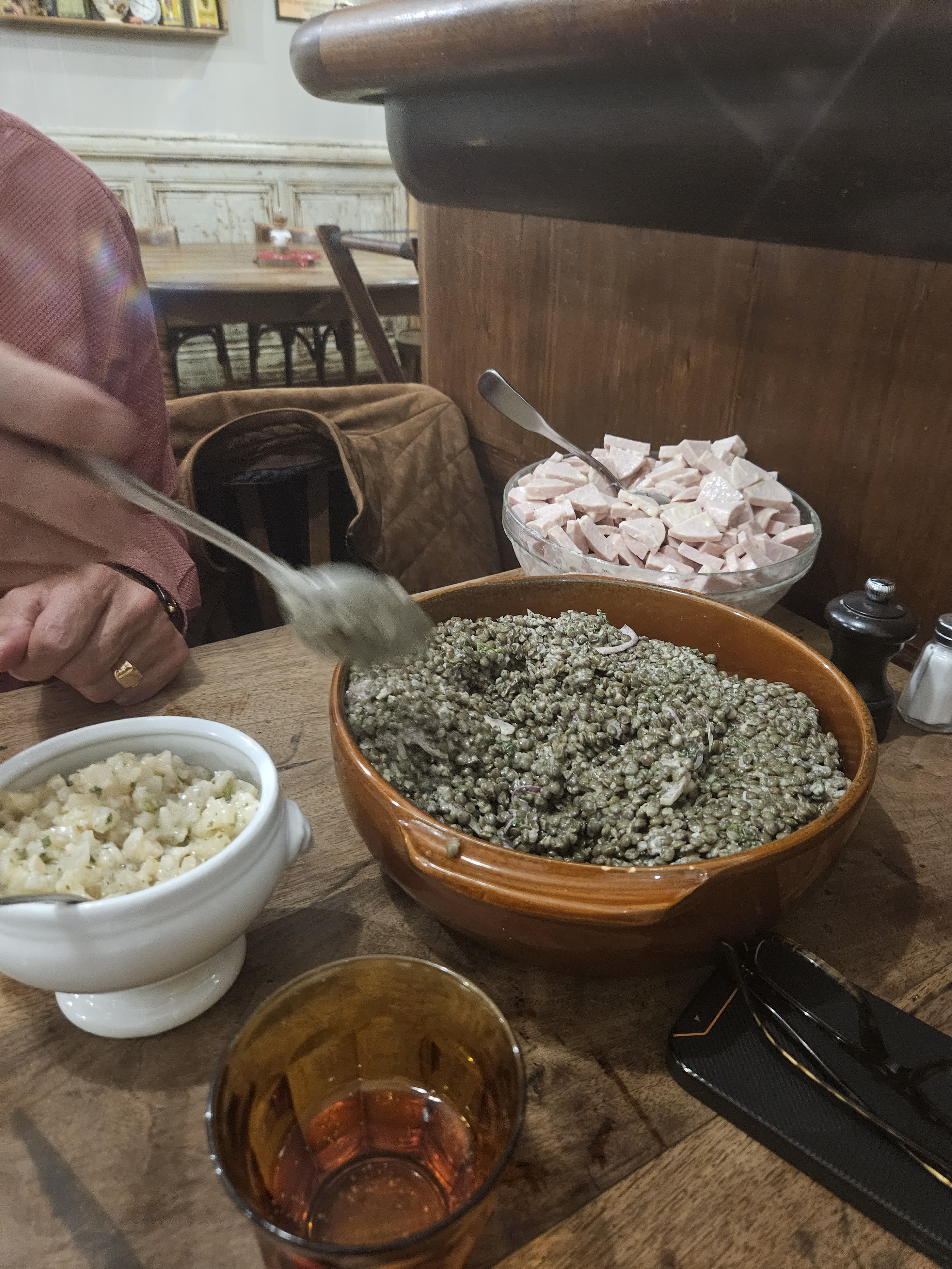 J'ai toujours adoré le concept des bouchons lyonnais...mais le dernier repas à la Meunière a failli m'en dégoûter. Je n'entendais même pas mon conjoint ni le serveur car une bande de personnes alcoolisées a cru bon de ne pas respecter les personnes autour d'elles. Je ne vais pas au restaurant pour entendre des grossièretés ni pour entendre les pratiques sexuelles de ces jeunes adultes qui ont cru bon les partager avec tous les clients. La patronne n'a pas souhaité intervenir... Ah si elle m'a indiqué que c'était ça le concept bouchon lyonnais !!! Non Madame ce n'est pas ça et heureusement !!! Mais bon eux...ils allaient consommer de l'alcool et c'était une table plus importante. Je remercie le serveur, un jeune homme adorable et plein d'empathie, souriant et agréable. Nous avons pu déjeuner dans un autre bouchon le lendemain et whaou merci pour leur accueil, la sublime ambiance et leurs sourires!!!!! Nous avons déjeuné avec des personnes que nous ne connaissions pas et échangé tout le temps d'un repas et c'est ça un bouchon lyonnais !!!! C'était génial et un très beau moment de partage.