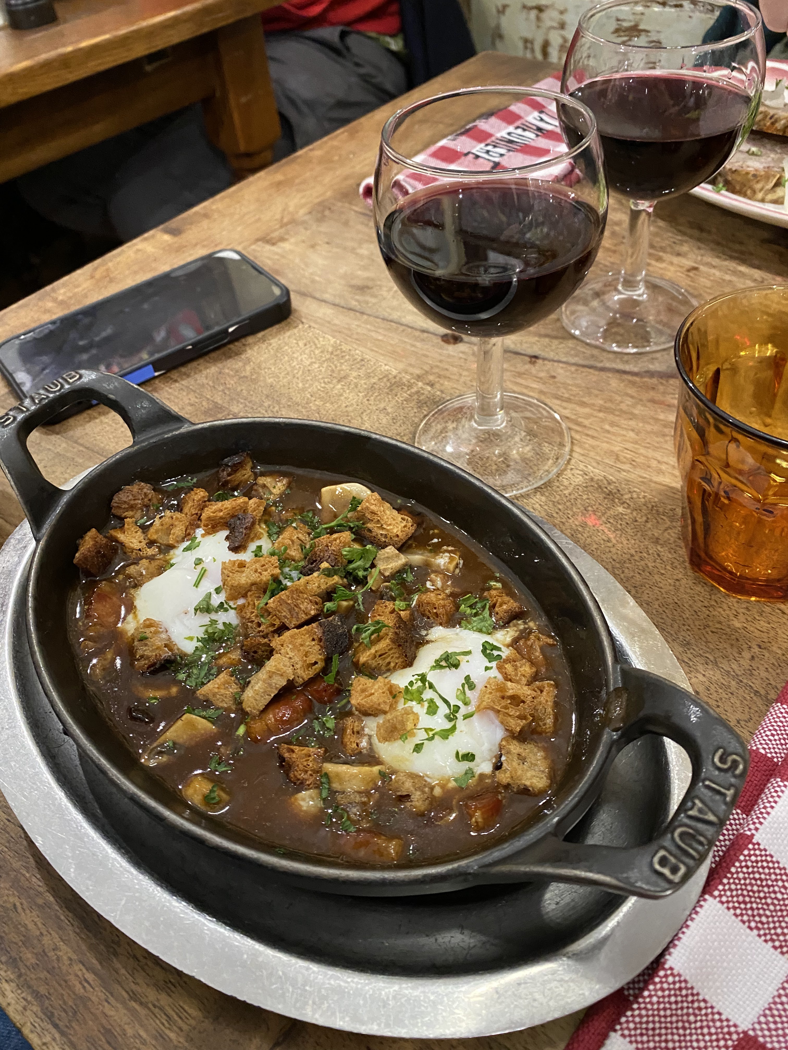 Expérience culinaire bonne. Les plats sont copieux (et très chauds). Les œufs en meurette étaient très bons, la bavette d'aloyau tendre en revanche un peu déçue du dessert. Le fondant avec son cœur caramel servi froid m'a déçue, il aurait été meilleur tiède. Expérience au niveau du service moyenne. Serveuse qui s’énerve auprès de clients, certes arrivés en retard, mais il faut savoir garder son calme. Serveur qui se moque...