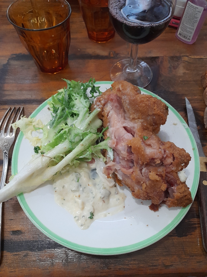 Excellent Bouchon près de Cordeles. Donc typiquement français. Vous devez réserver et vous pouvez le faire facilement en ligne. Le pot de vin rouge Morgon était bien meilleur que la nuit précédente. Le serveur était très serviable et, soucieuse de notre compréhension, elle nous a apporté un exemple de la cuisine. e. g. format de Côte de Veau (700g) - énorme ! Du bon pain et un apéritif étaient en Angleterre Pork Scratchings Expresso décaféiné pour finir.