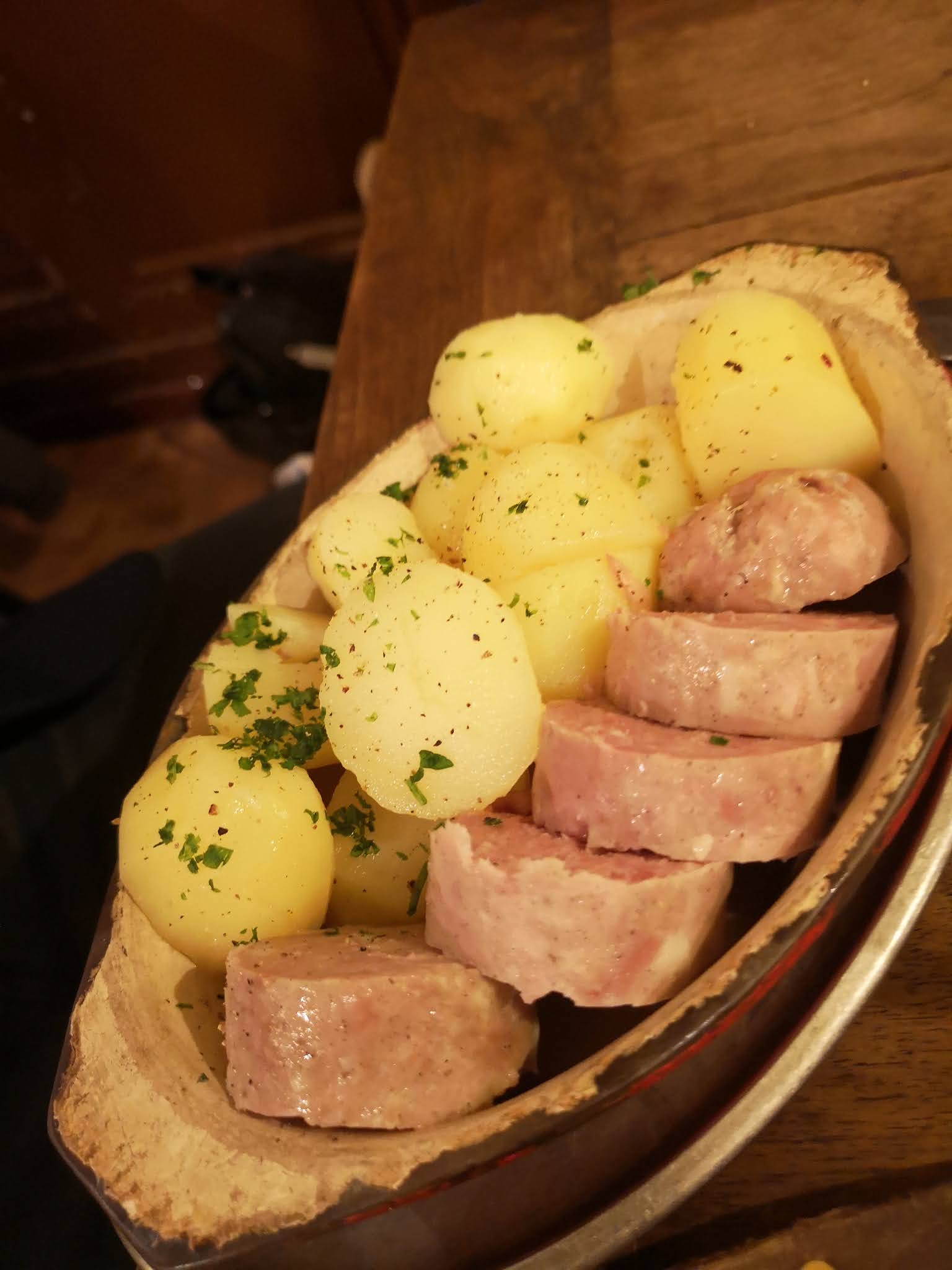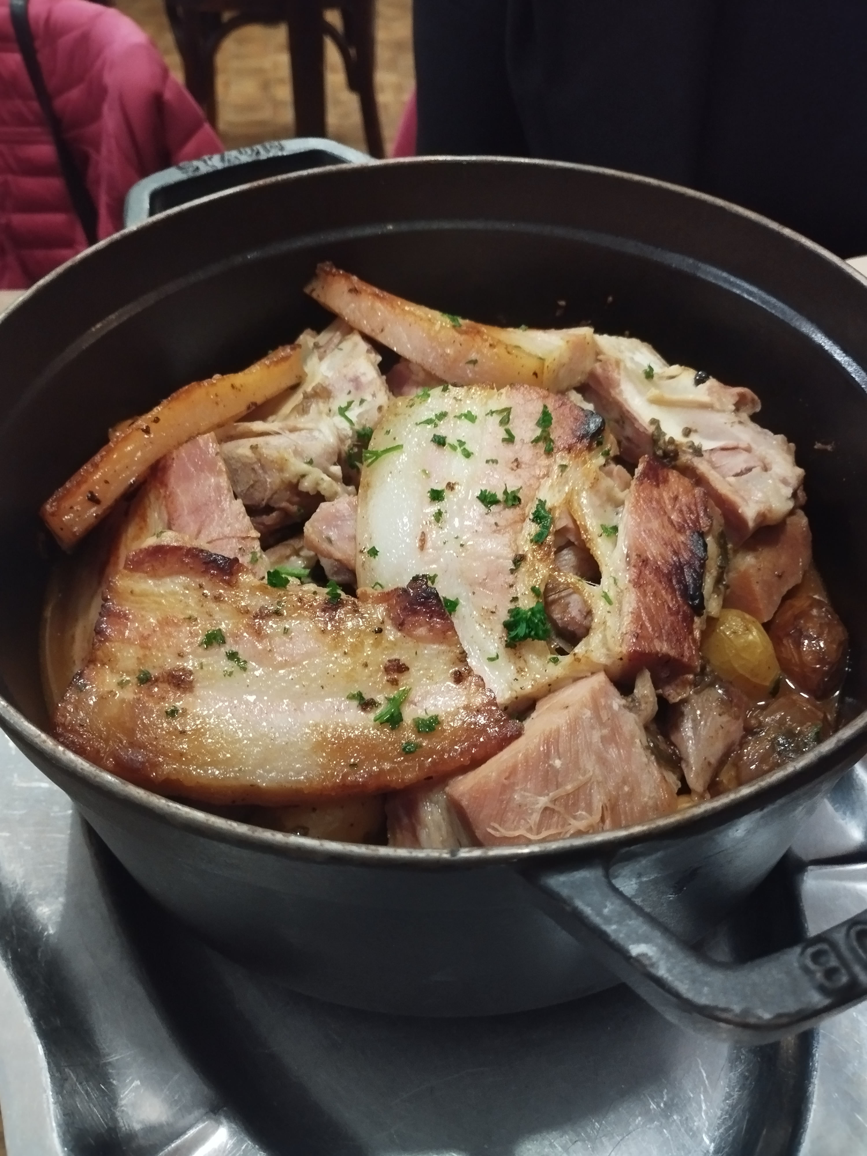 Nous avons pris un plat du jour (rôti de porc avec pommes de terre grenailles). Les pommes de terre grenailles étaient délicieuses, cuites de manière à faire ressortir leur goût. L'ambiance ce bouchon est chaleureuse, le service est impeccable. Seul bémol : le café qui avait vraiment un drôle de goût. Resto à éviter toutefois si vous êtes végétarien.ne.