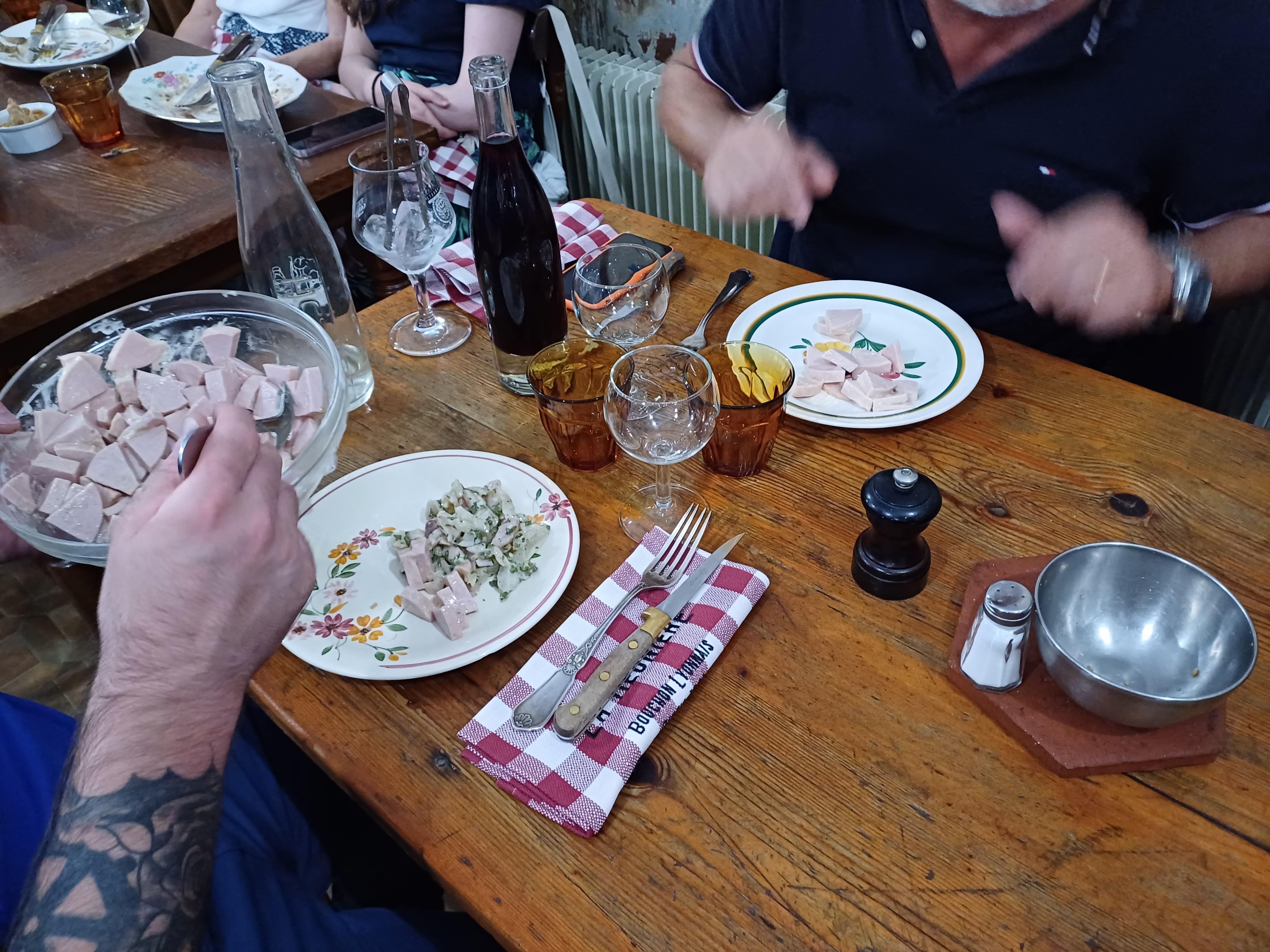 Un mâchon extraordinaire... de 9h.00 à 11h.00... rillettes de boudin, foie gras et pâté en croûte en entrée puis tablier de sapeur puis tripes à la tomate... tout simplement magnifique 👍👍