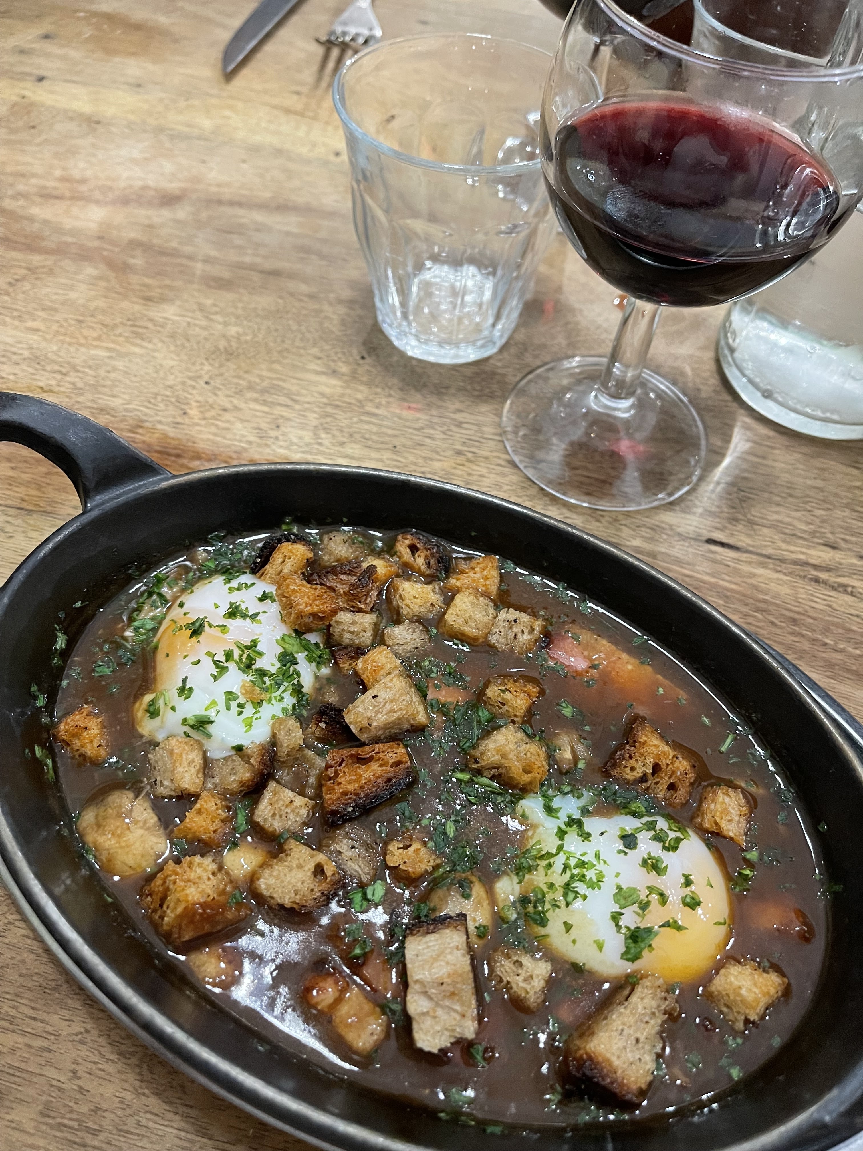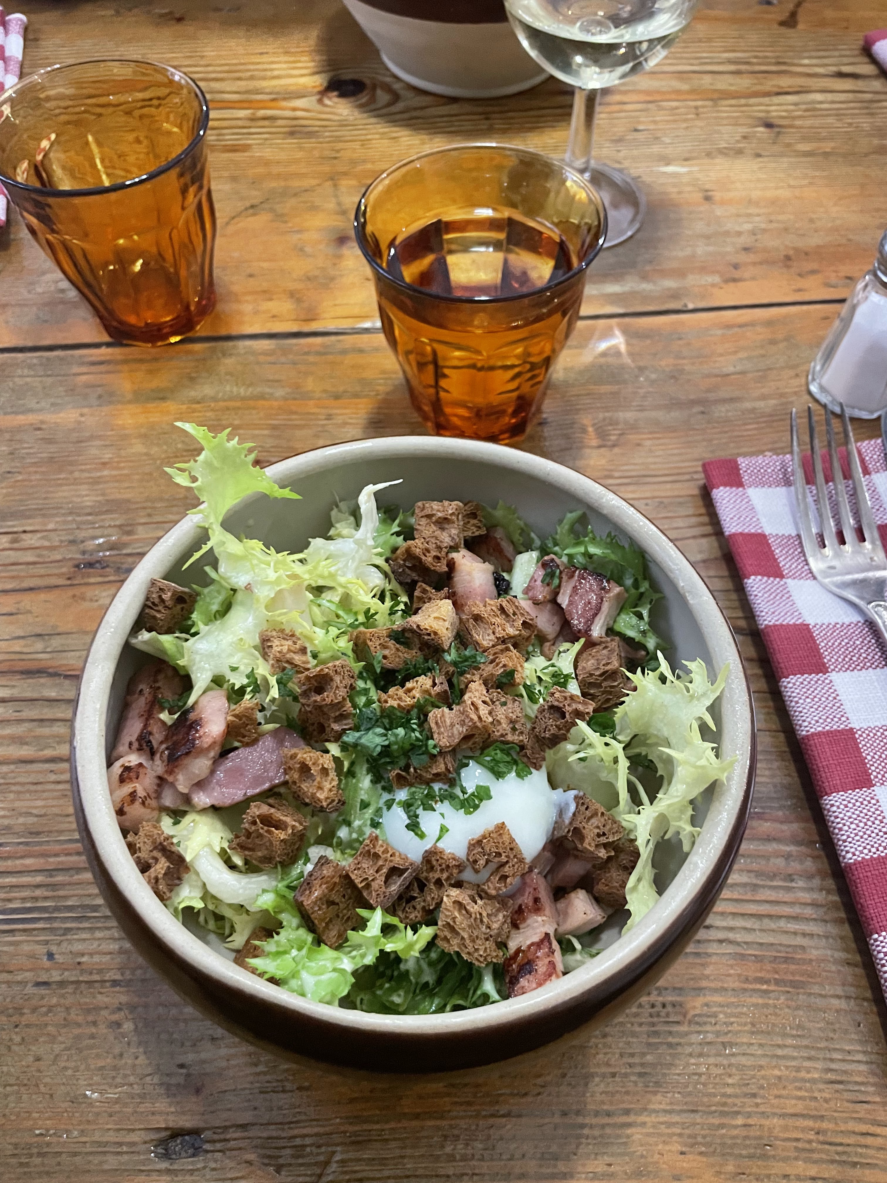 Très bon bouchon. Salade lyonnaise Rognons de veau et gratin de pâtes 1/2 st Marcellin Fondant chocolat