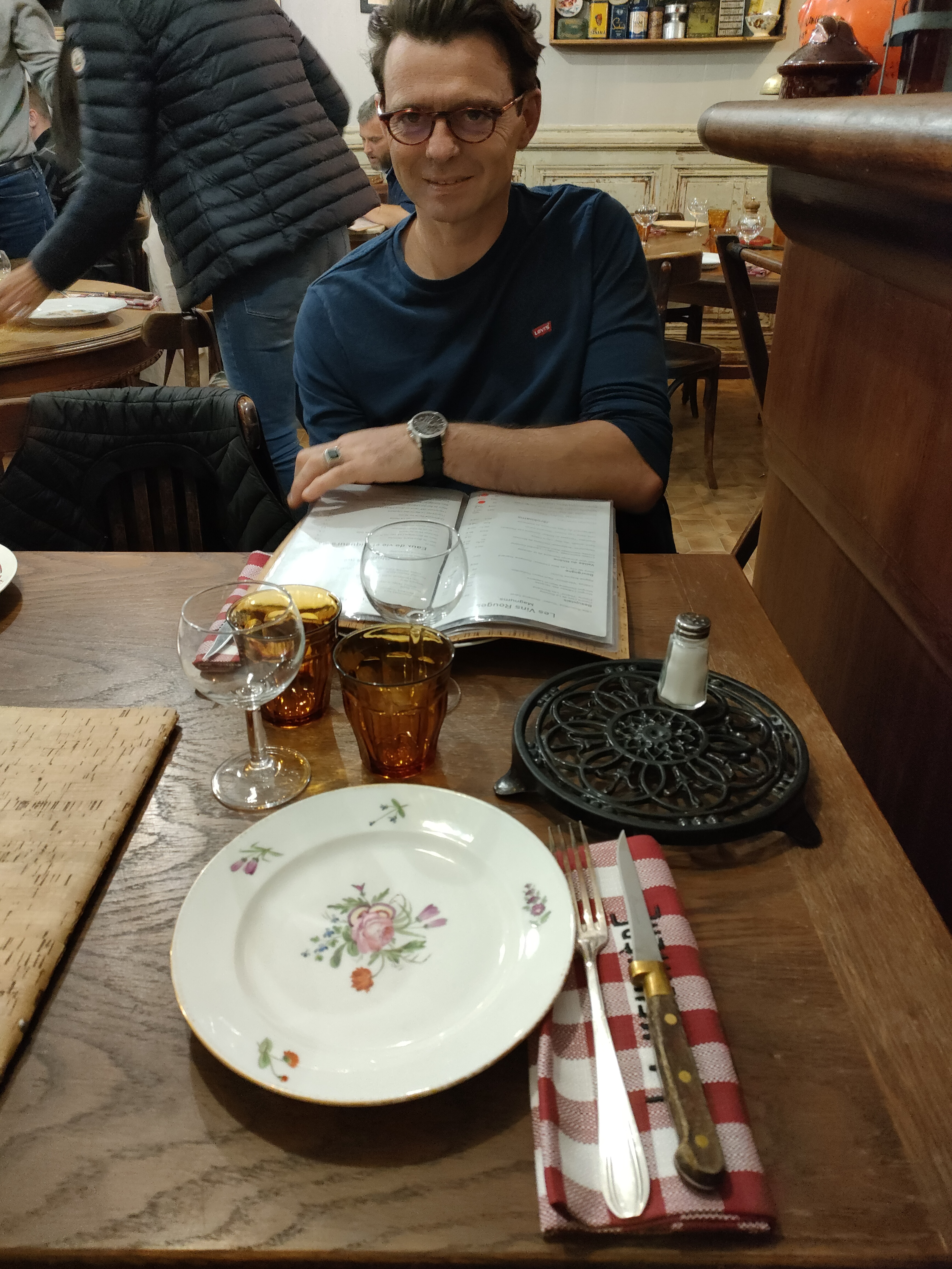 Bon c était pas mal mais sans plus… on est resté sur le menu, la patronne pas très sympa, heureusement le serveur a rattrapé l’ambiance, grande table en fond de salle bof, on a bien mangé, les rognons étaient très bons mais l’ensemble n’était pas à se pâmer…