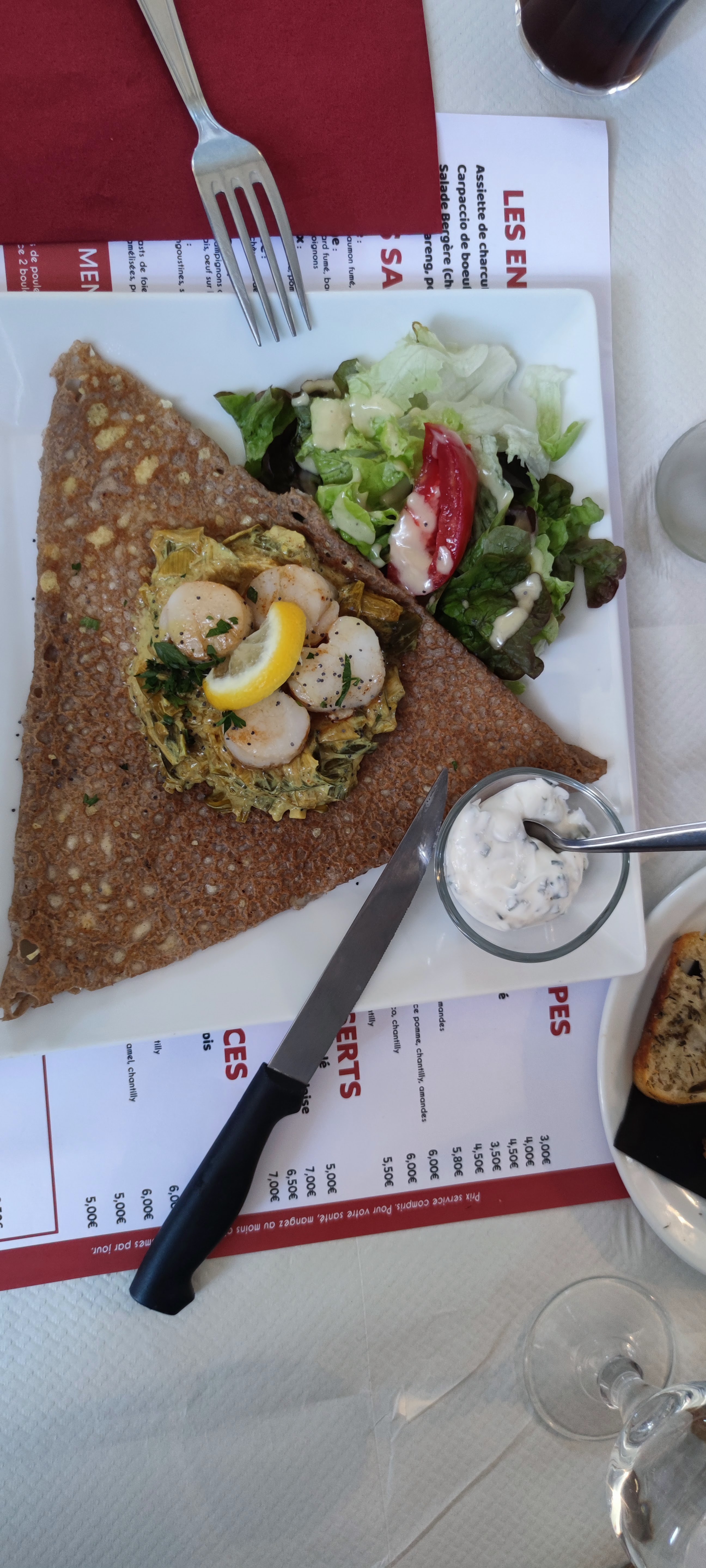 Personnel très accueillant et souriant. Dès la commande passée, il vous est apporté des toasts grillés accompagnés d'une sauce. Mon repas: Galettes noix de St Jacques sur lit de fondue de poireaux. Dame blanche. Délicieux !😋😋😋