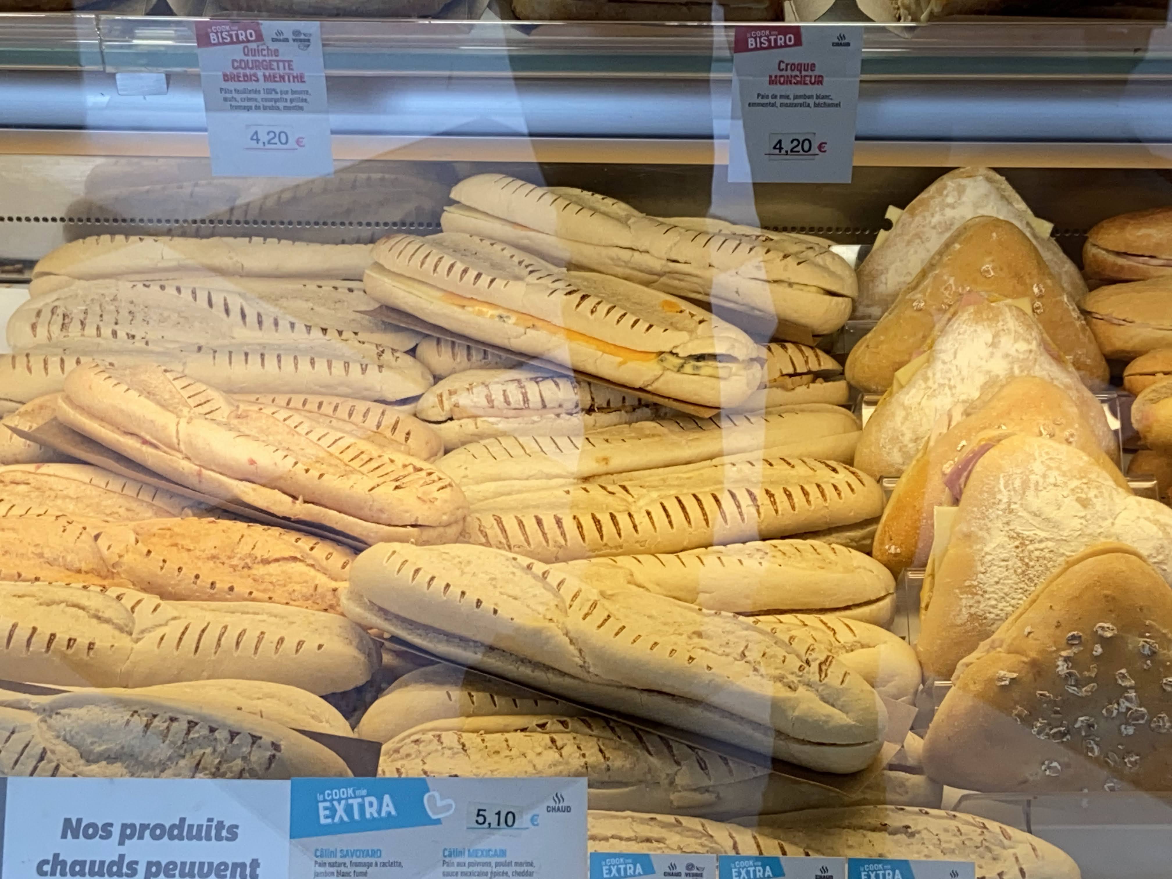 Bizarre ce qui se passe ici En fin de journée ils ouvrent les sandwichs avec les mains sans gants, dans le même temps ils se passent la lavette pour nettoyer les tables, vérifient à nouveau les sandwichs et....miracle quand vous venez acheter une baguette, ils vous servent avec une pince. Je ne vous recommande pas les sandwichs.....