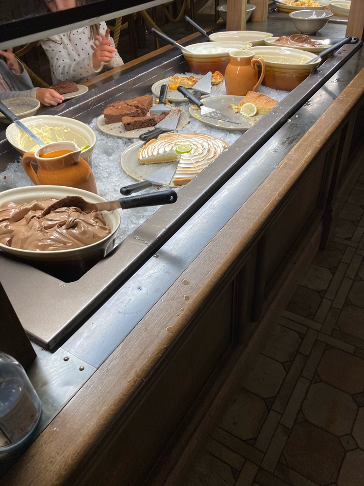 Buffet sympathique mais reste un buffet normal. Les plats manquent d' assaisonnement. La viande très dure ou morceau couper trop épais. Les desserts tartelettes au citron plus de citron après cuisson. Le vin de pays des fort en bouche. Mais la bière de saison très bonne On mange mais après je pense que nous pouvons trouver mieux dans le parc. Les serveuses très sympathiques et dynamiques félicitations à elles. Et sinon le décor était vraiment très joli. Essayer je pense un midi.