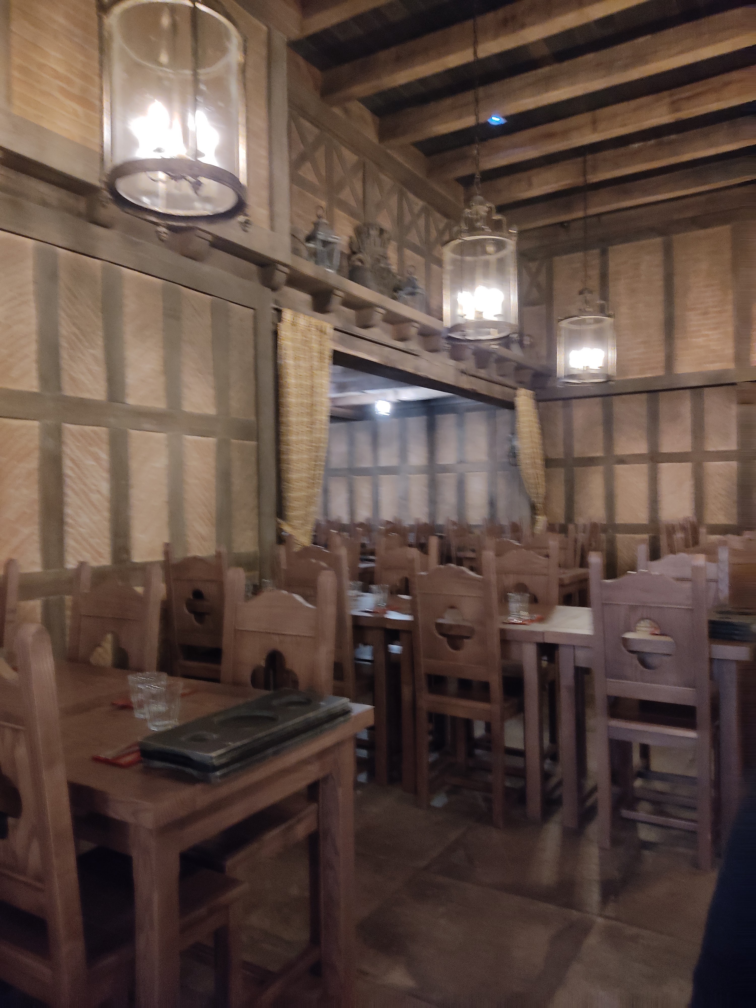 Restaurant de style moyen-âge, peu de choix de menus midi ou soir, service sympathique par de nombreux serveurs, nourriture correcte.