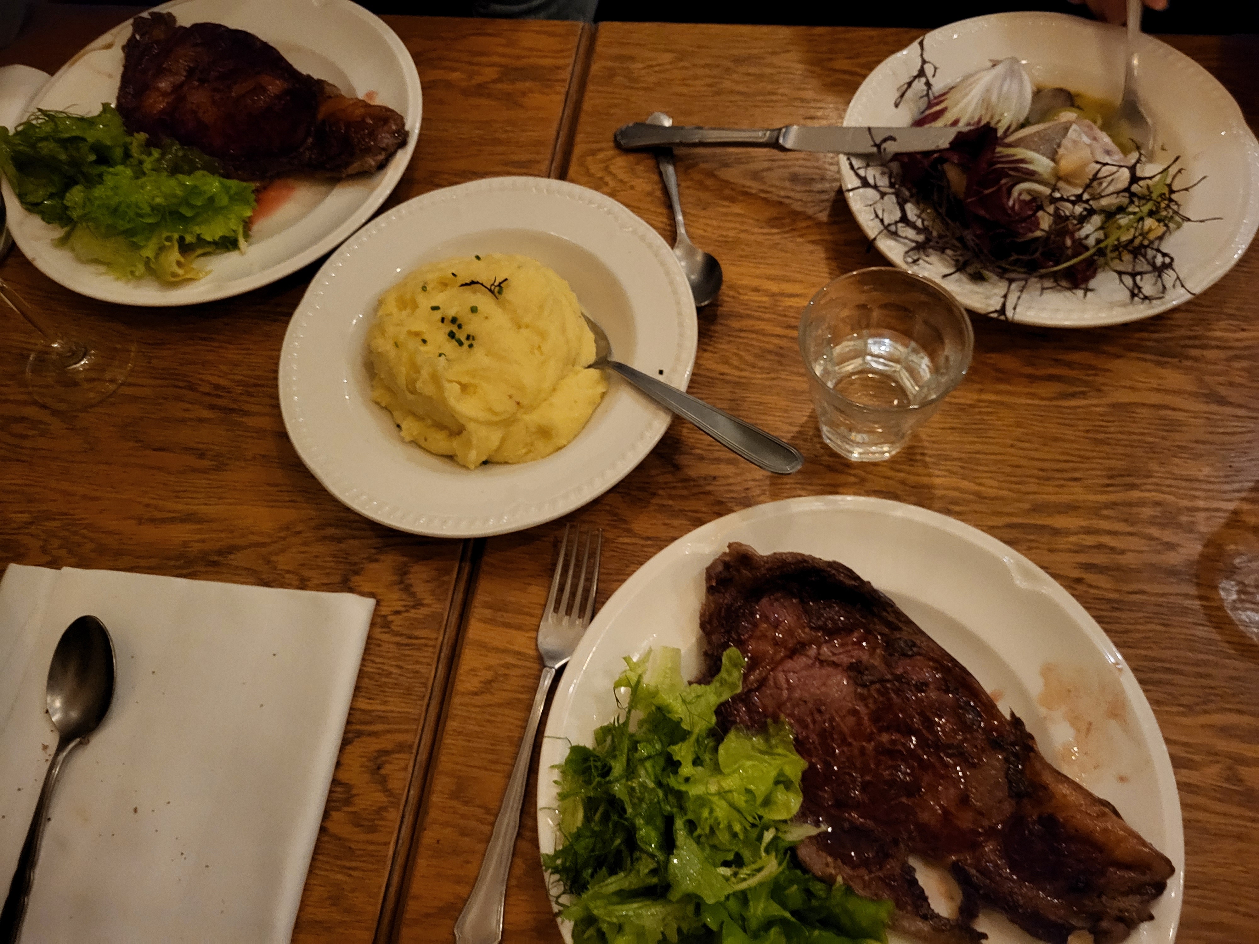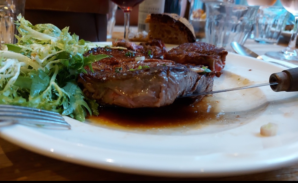Il y a quelques années, nous sommes venus manger dans cet endroit et avons décidé de l'essayer à nouveau car c'était mignon, les gens sont super sympas. La nourriture était excellente à un bon prix. Nous n'avons pas été déçus. Nous sommes arrivés juste avant huit heures un mardi soir, sans réservation et avons eu la chance d'avoir une table pour deux car l'endroit était presque complet. Une bouteille de vin rouge nous a été recommandée, ce qui était vraiment bien. La partie principale du restaurant est très petite avec une cuisine ouverte. Une pièce séparée plus grande était fermée pour la nuit. En entrée, nous avons tous deux commandé des huîtres locales qui étaient excellentes. Au menu, ils avaient une côte de bœuf pour deux à 25 EUR par personne. Quand j'ai demandé quelle était la taille du morceau de viande, le chef a répondu 1,2 kg puis, avec un grand sourire, il a pris une balance de cuisine pour confirmer. Ma femme voulait autre chose, alors j'ai fini par commander la double commande juste pour moi. La viande, la sauce, etc. étaient excellentes et cuites à la perfection. La viande était si bonne que j'ai fini par gratter ce qui restait sur l'os.