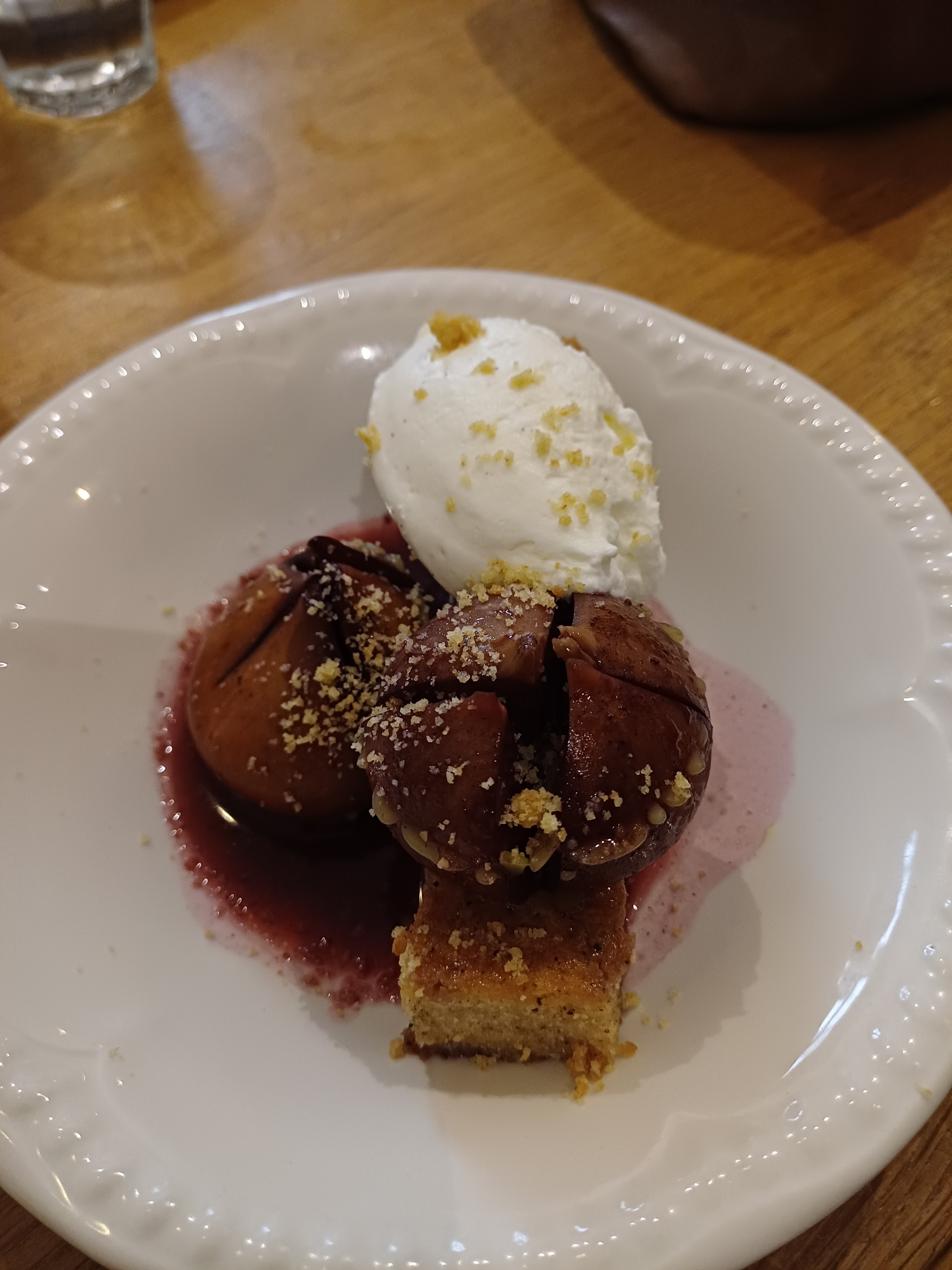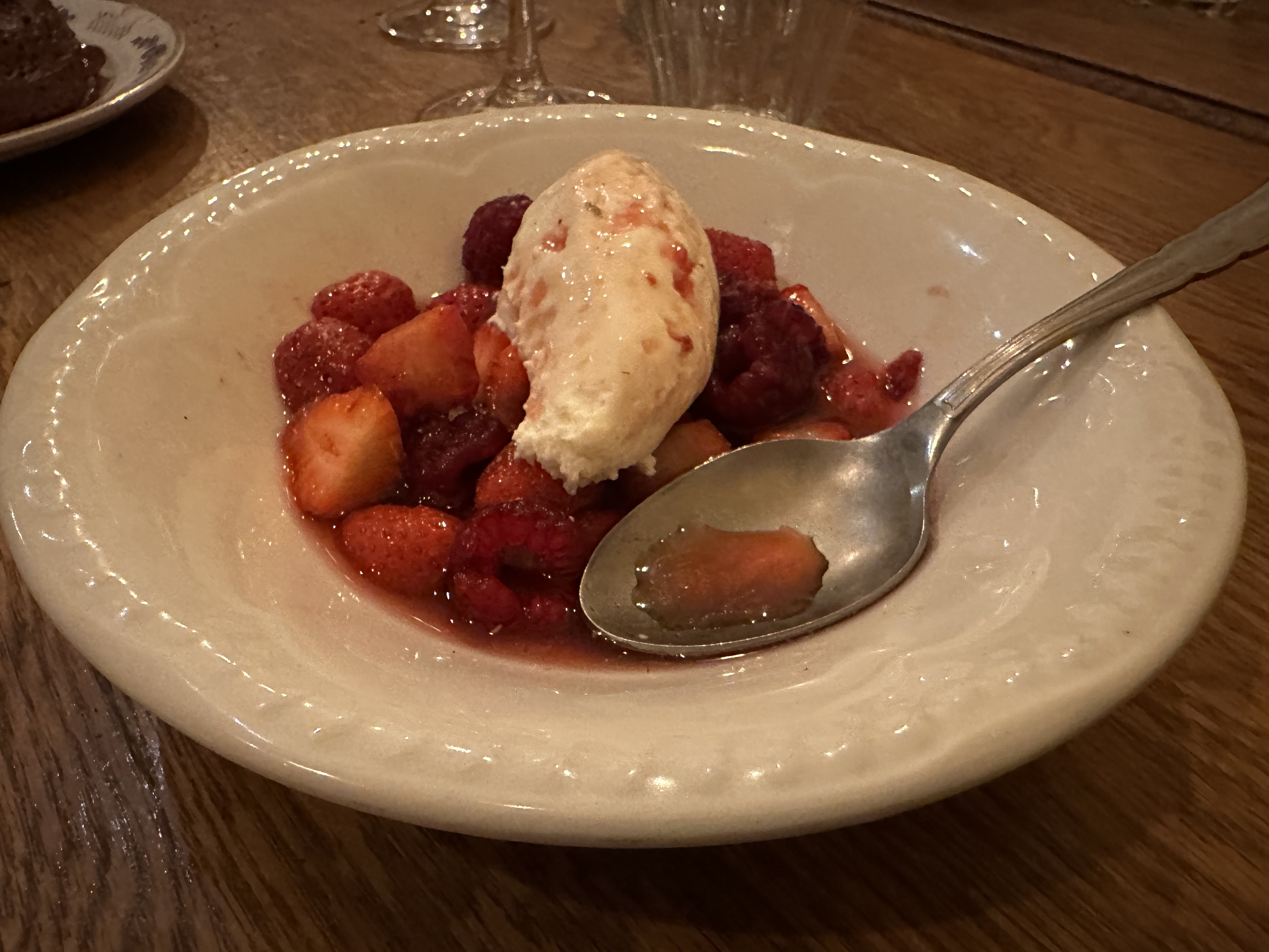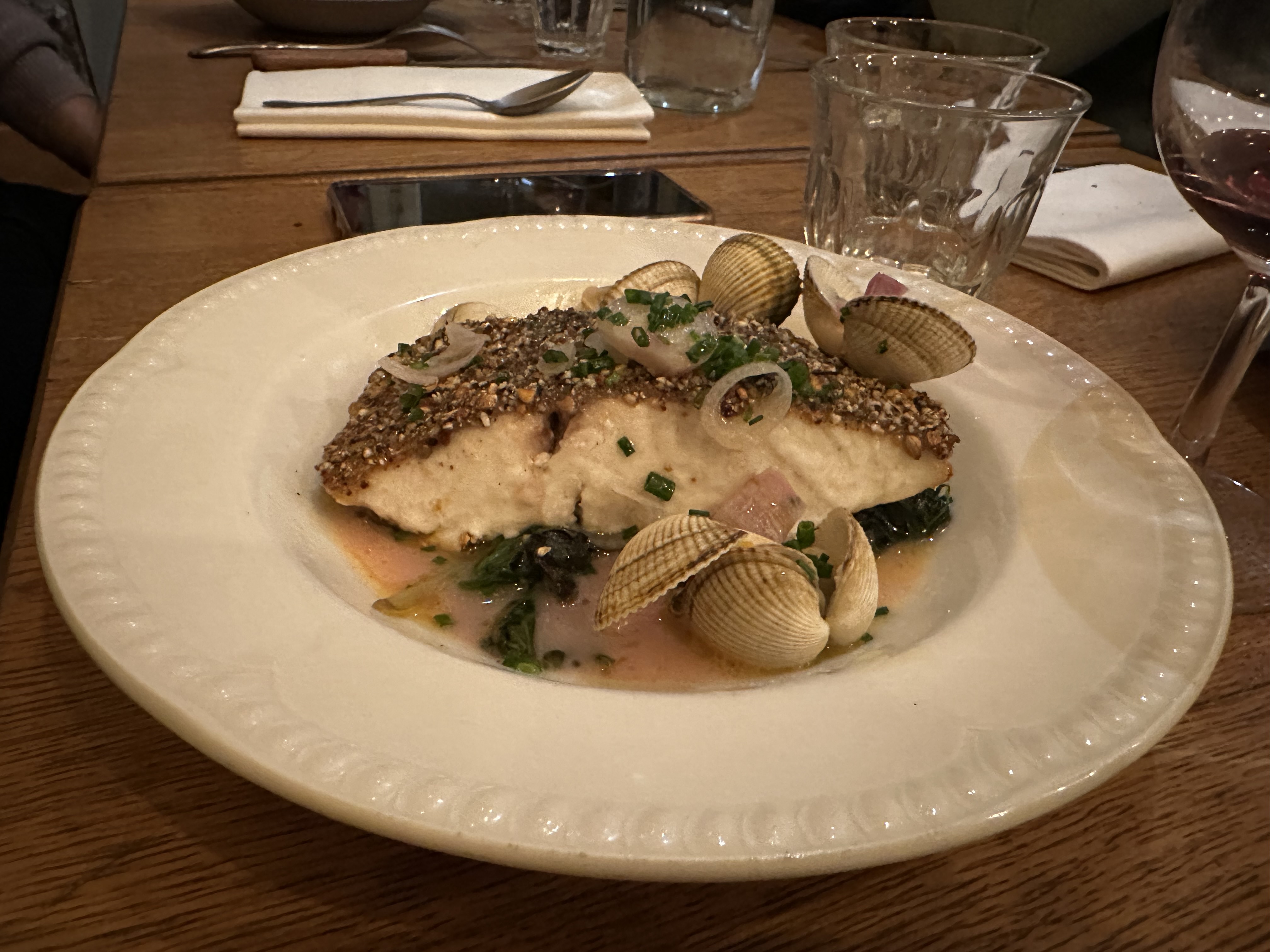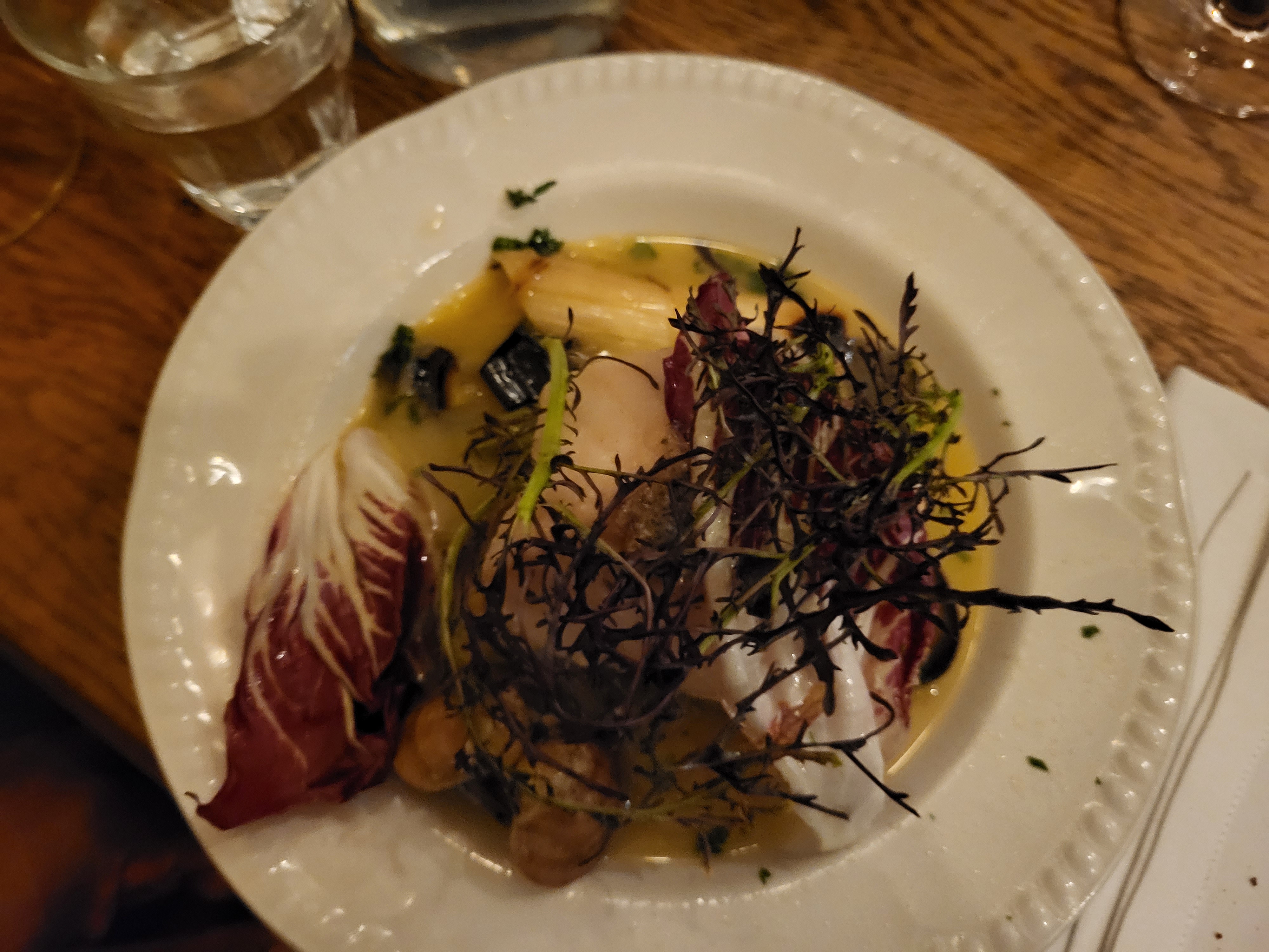 Nous sommes venus en groupe pour le taf. On a tous pris le menu à 30€ (entrée plat dessert). Le mien était composé comme suit : en entrée un tartare de veau et anguille, un veau et petits légumes, et en dessert un nuage de fraise. L’entrée bien qu’intéressante sur le papier était mal dosée. En effet il y avait trop de persil et surtout trop d’anguille fumée le veau déjà naturellement faible en goût était parfaitement absent. Le veau était nettement meilleur, même si l’accompagnement était un peu maigre. Le dessert lui n’avait que peu d’intérêt surtout hors saison pour les quelques fraises perdues parmi les framboises. Le point poissard était la sélection de vin proposé.