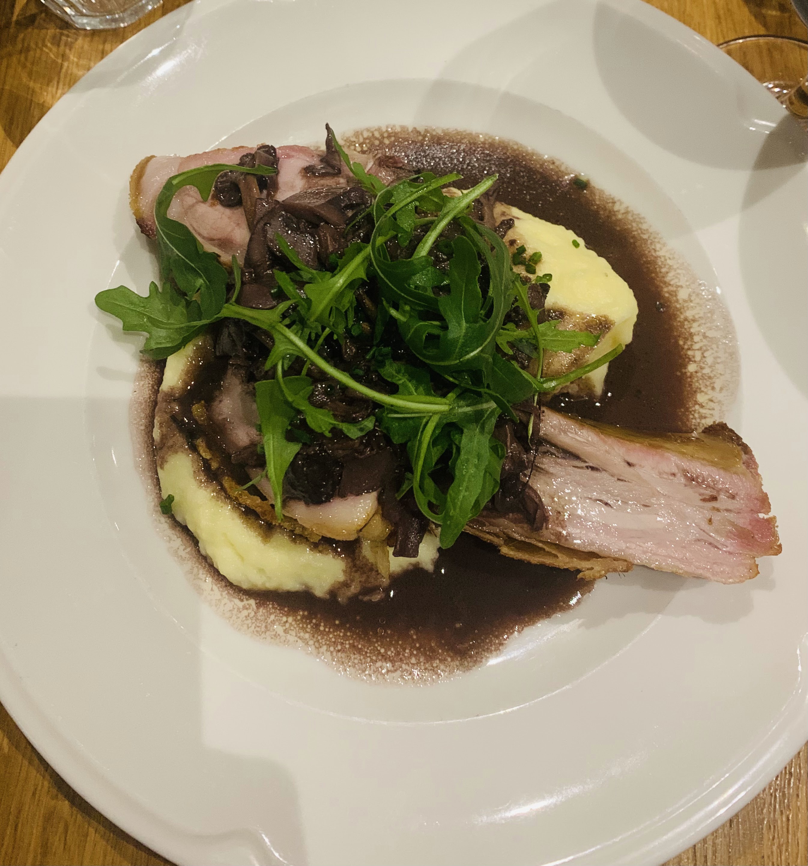 Très chouette expérience ! Bon accueil sympa. Terrine maison en entrée (très bonne) avec du super bon pain. Cochons de lait et purée (cuisson parfaite du cochon). Dessert au chocolat très réussi (la photo parle d’elle même). 53 euros par personne vin et apéro compris. On recommande !