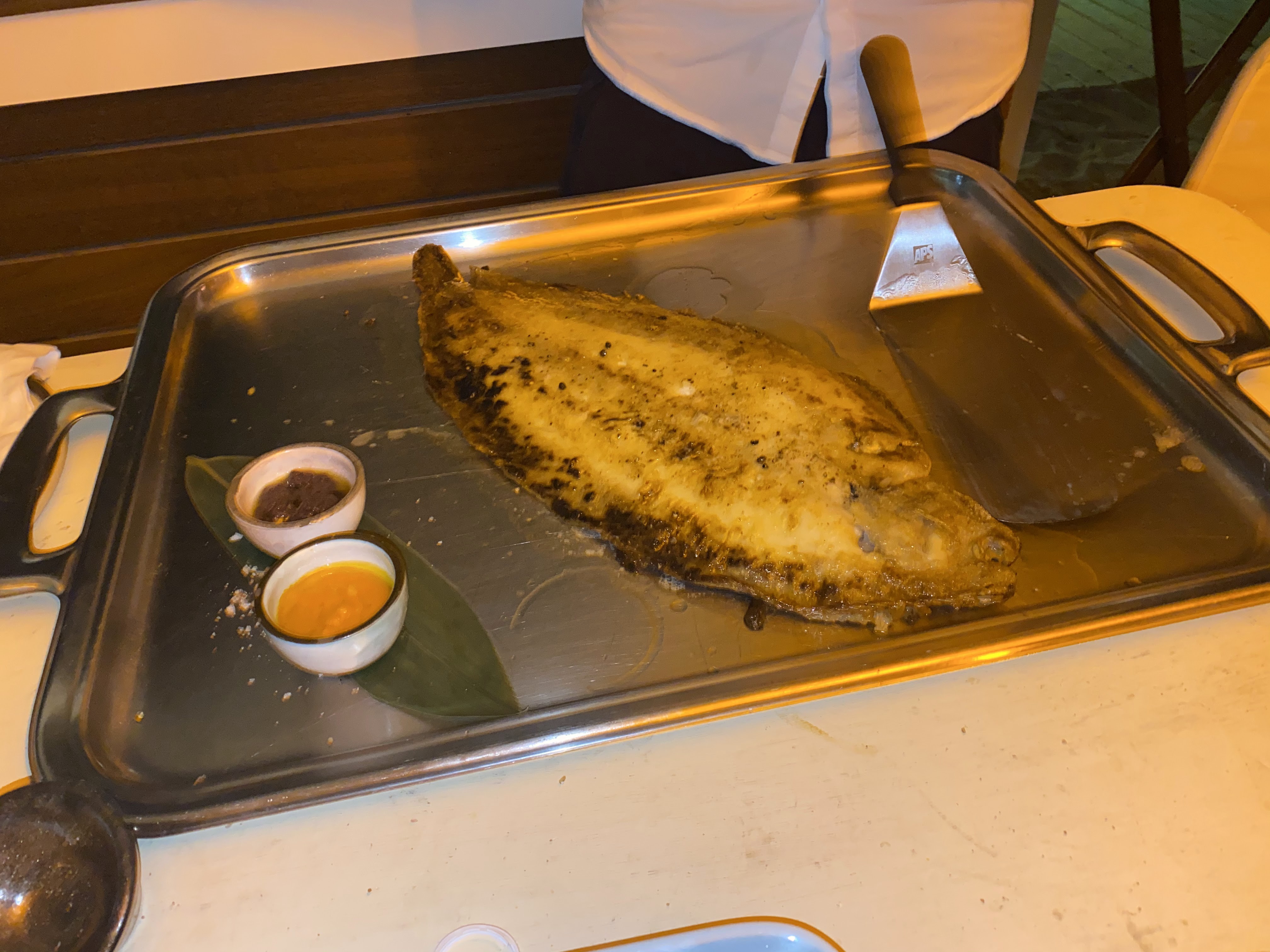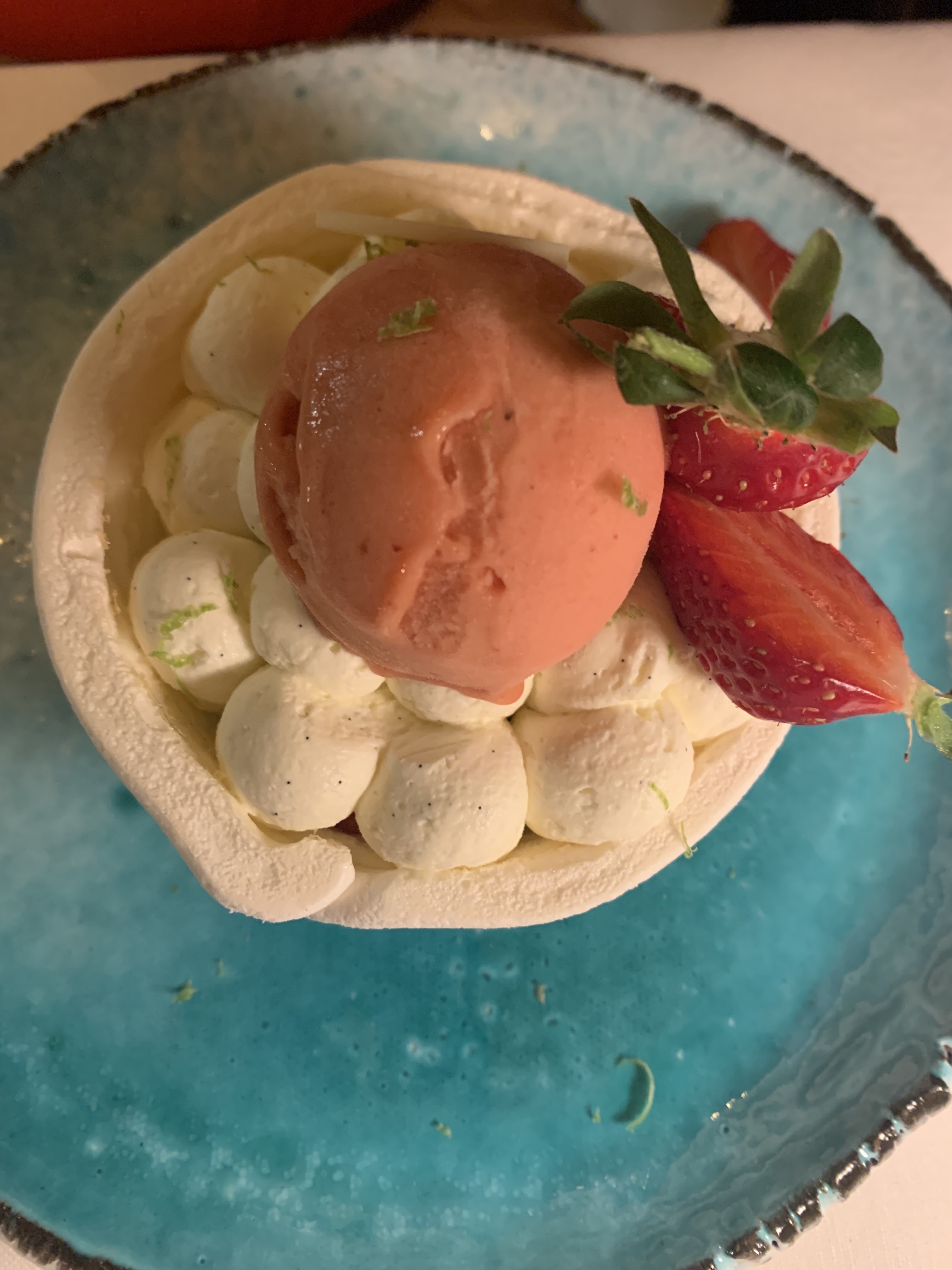 L’Automne partageait le ciel avec l’Eté pour ce déjeuner dominical. Une pinsa à la truffe et l’originale burrata accompagnée de tranches d’orange et de pistache , voyages dans le bassin méditerranéen . Une cote de veau rosée à point que nous avions choisi d’accompagner du panier de crudités et ses trois sauces. En dessert , nous avions demandé une gaufre bien dorée et l’attention qu’il y a dans le service sur cette plage est allée juste qu’à l’accomplissement de notre souhait: un peu de poudre d’or. Merci à toute l’équipe.