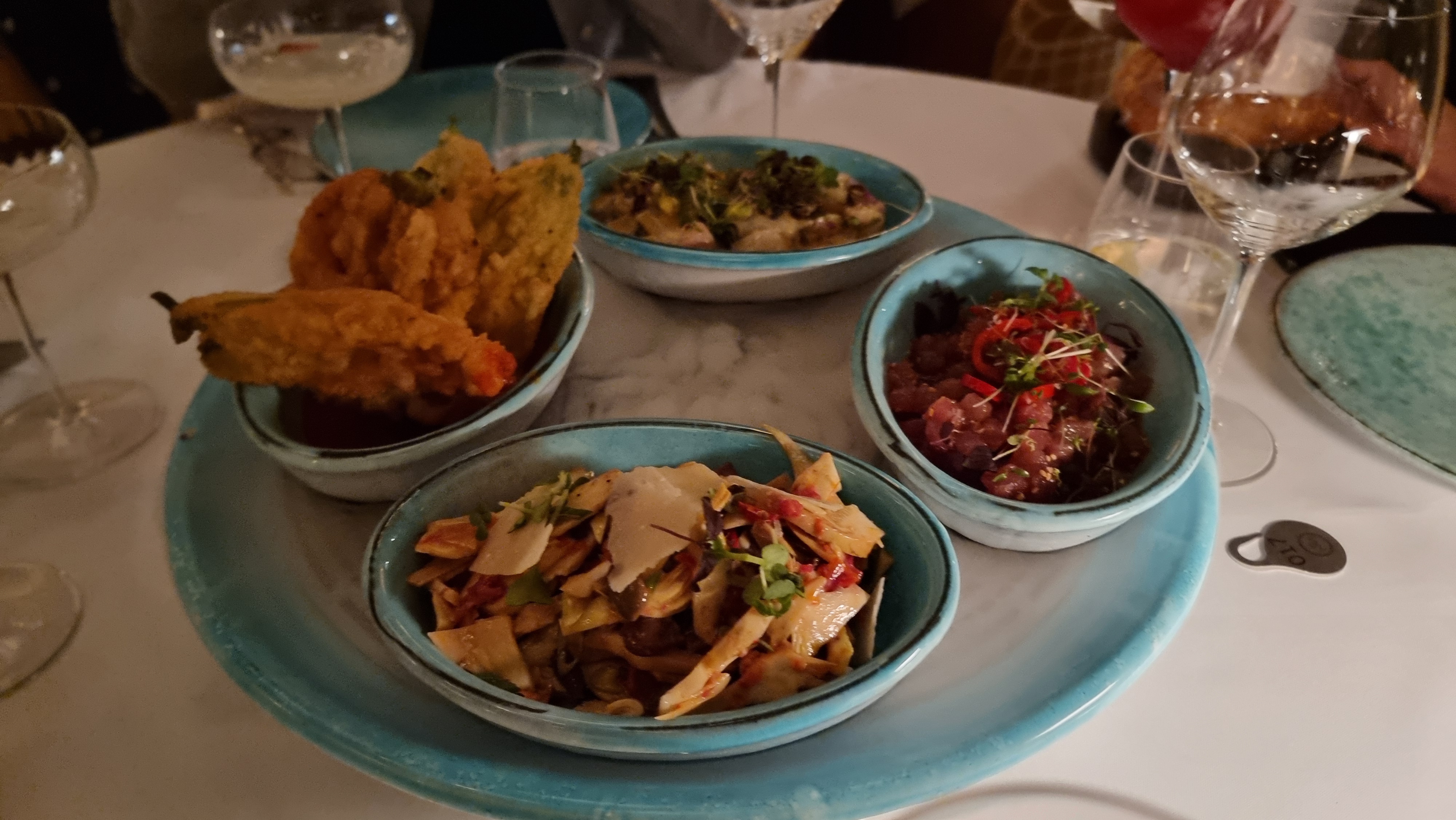 Le restaurant est assez classe et se trouve dans une impasse assez vivante . Il pleuvait mais la terrasse était bien protégée de la pluie . La décoration est chic et les clients aussi . Les serveurs sont sympas et le service était rapide et soigné . On a pris en entrée du caviar d’aubergine en entrée, un ceviche, des gnocchis à la truffe et des légumes . On a pris trois bières et un verre de vin rouge . Voilà c’était plutôt bon . Mais l’addition était excessive pour ce qu’on a mangé . 120 € pour tout ça …
