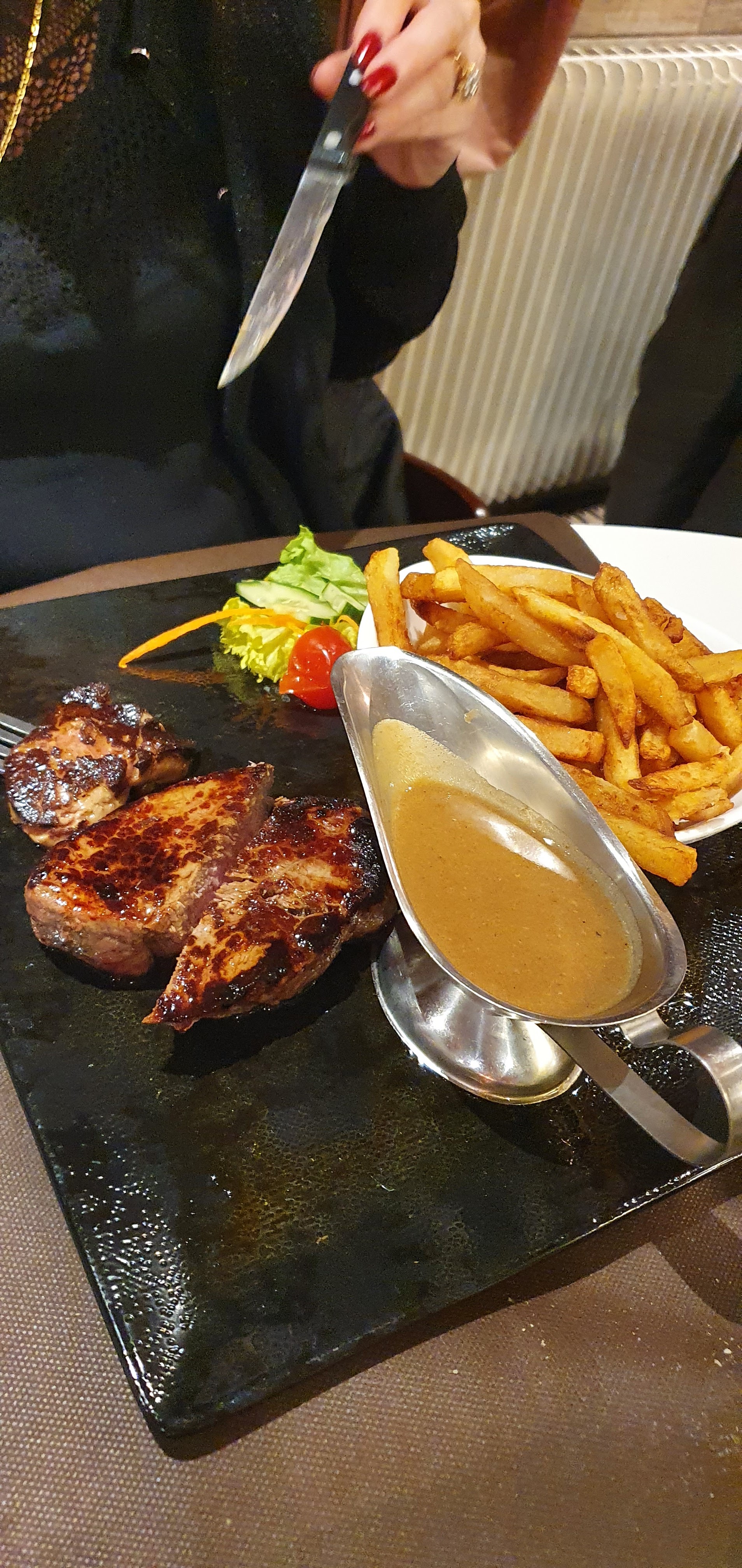 Qualité présente, viande tendre, frite maison, gratin pomme de terre/patates douces délicieux. Service très aimable. Rien à redire.
