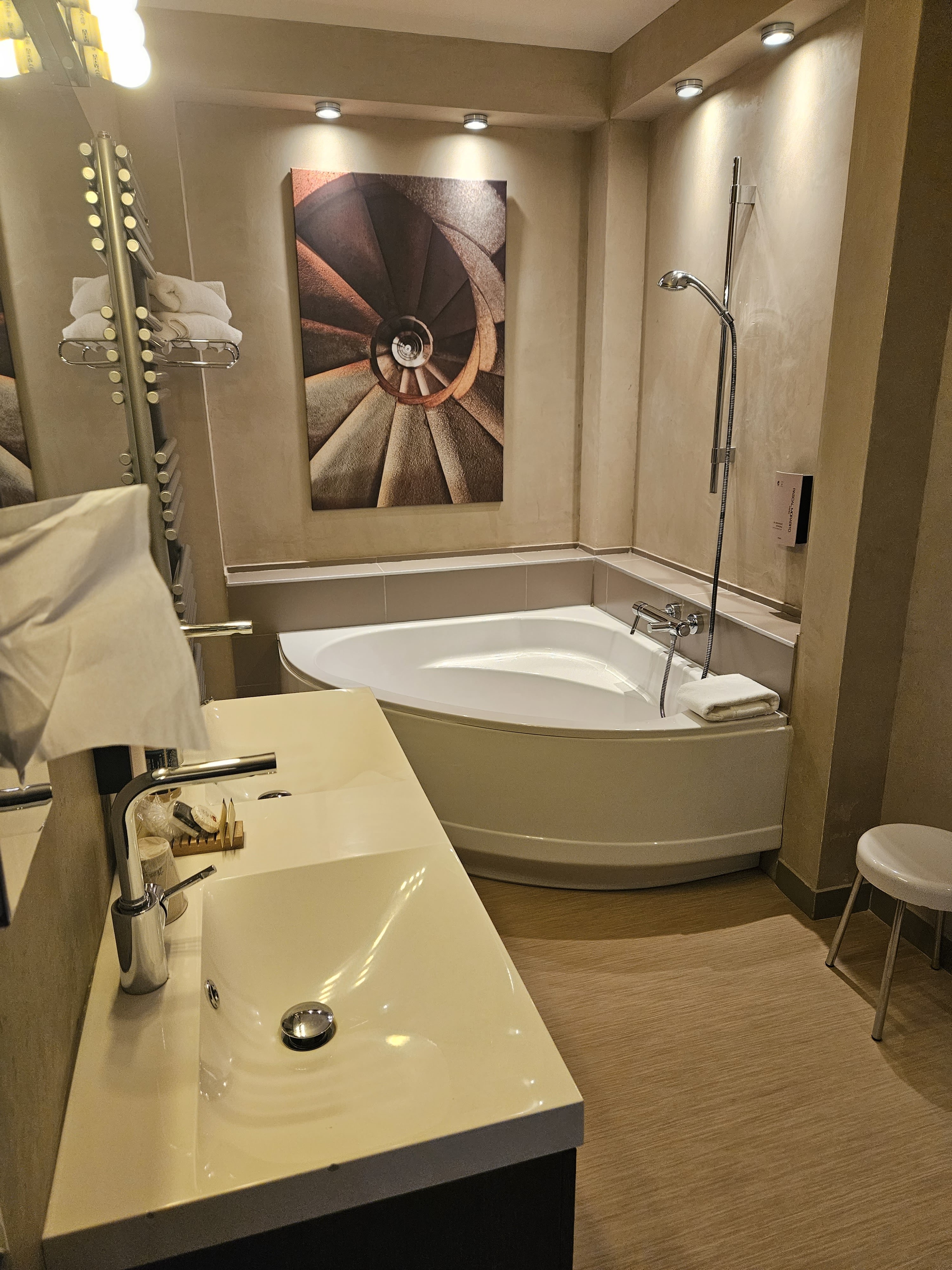 très agréable séjour de 5 nuitées: chambre spacieuse avec grand bain petit balcon et air conditionné, personnel très accueillant et sympathique . repas gastronomique de qualité supérieure, très bons conseils pour le choix du vin, hotel de grand standing dans lequel on se sent très bien. endroit calme et reposant.