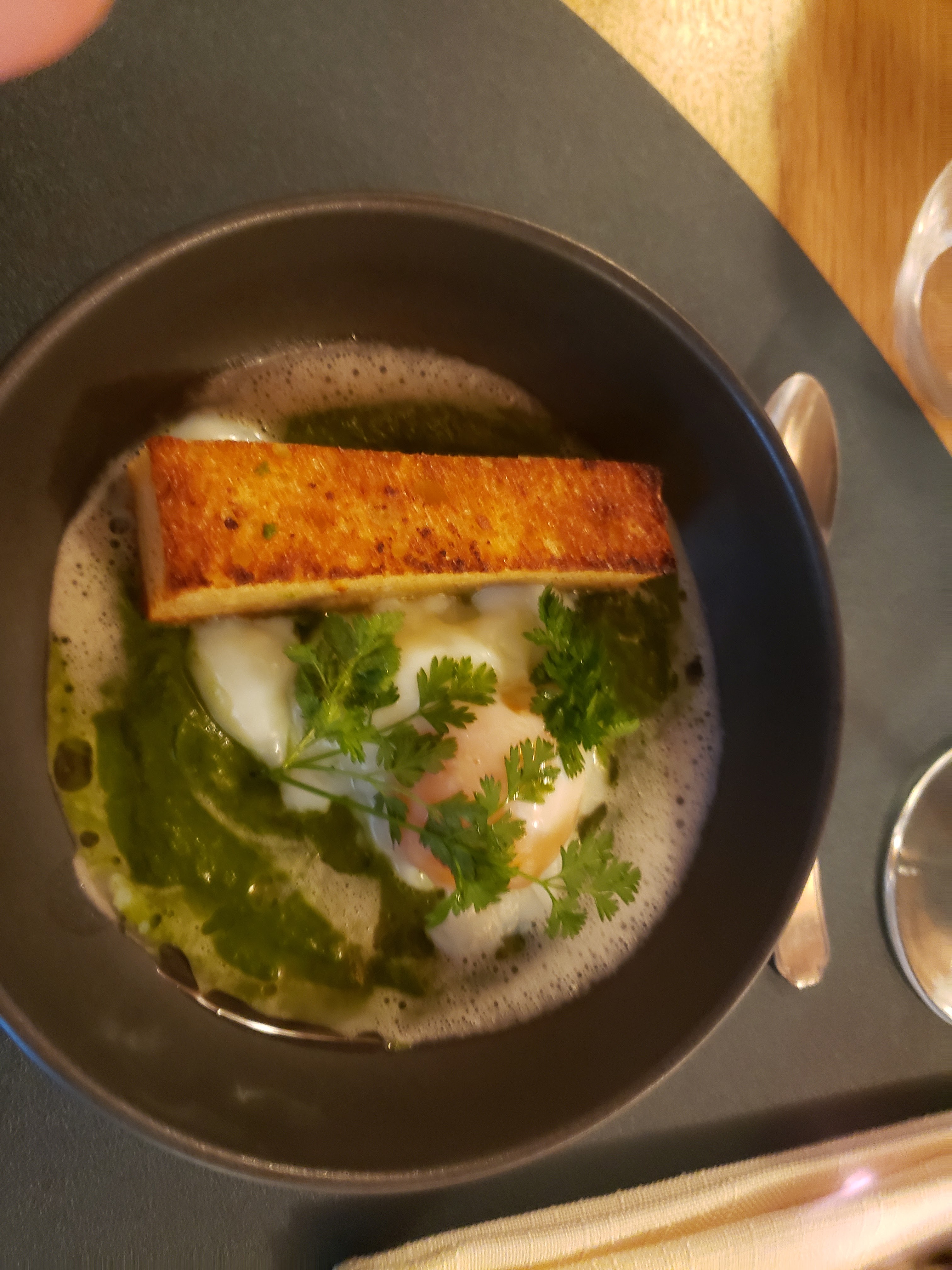 Découverte de ce restaurant au cadre plutôt chouette. Le concept est sympa et l’écologie est important super point. On a passé un bon moment cependant pour un menu unique moi qui mange de tout et vraiment varié … l’agneau en plat était pour le coup trop fort , c’est une viande particulière qui pour le coup en menu unique n’est pas franchement adaptée. Ensuite les légumes à peine cuit c’était croquant peut être trop et on était pas les seuls à le dire. La table d’à côté a dit la même chose. On a pas voulu pendre le fromage car déçus du plat donc dessert et là pareil déçus aussi. C’était une expérience à vivre mais peut être que le menu serait bien avec deux choix entrée plat dessert car sinon amuse bouche / entrée très bien. On reste mitigé alors que le local est au rdv ainsi que le cadre.