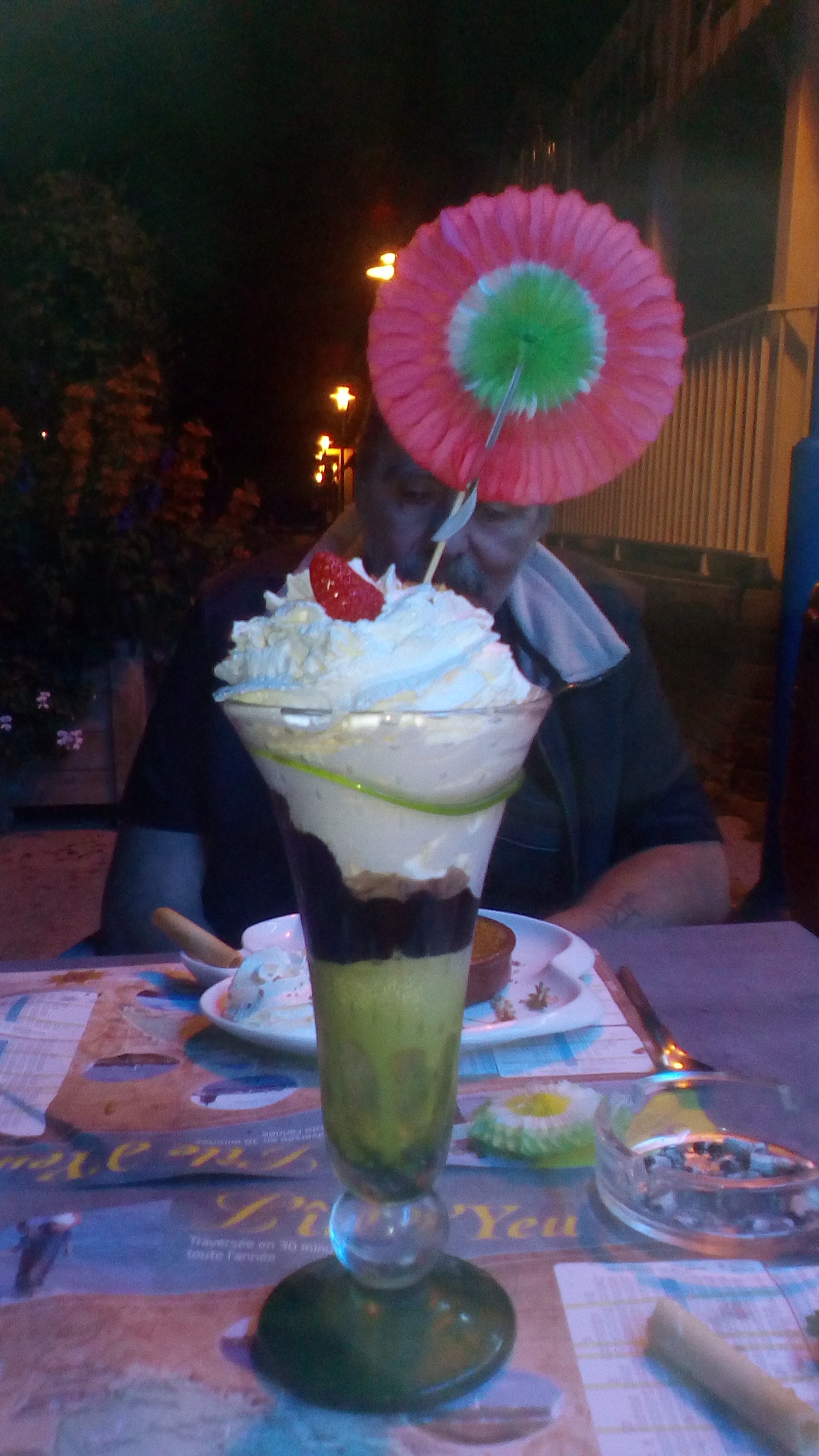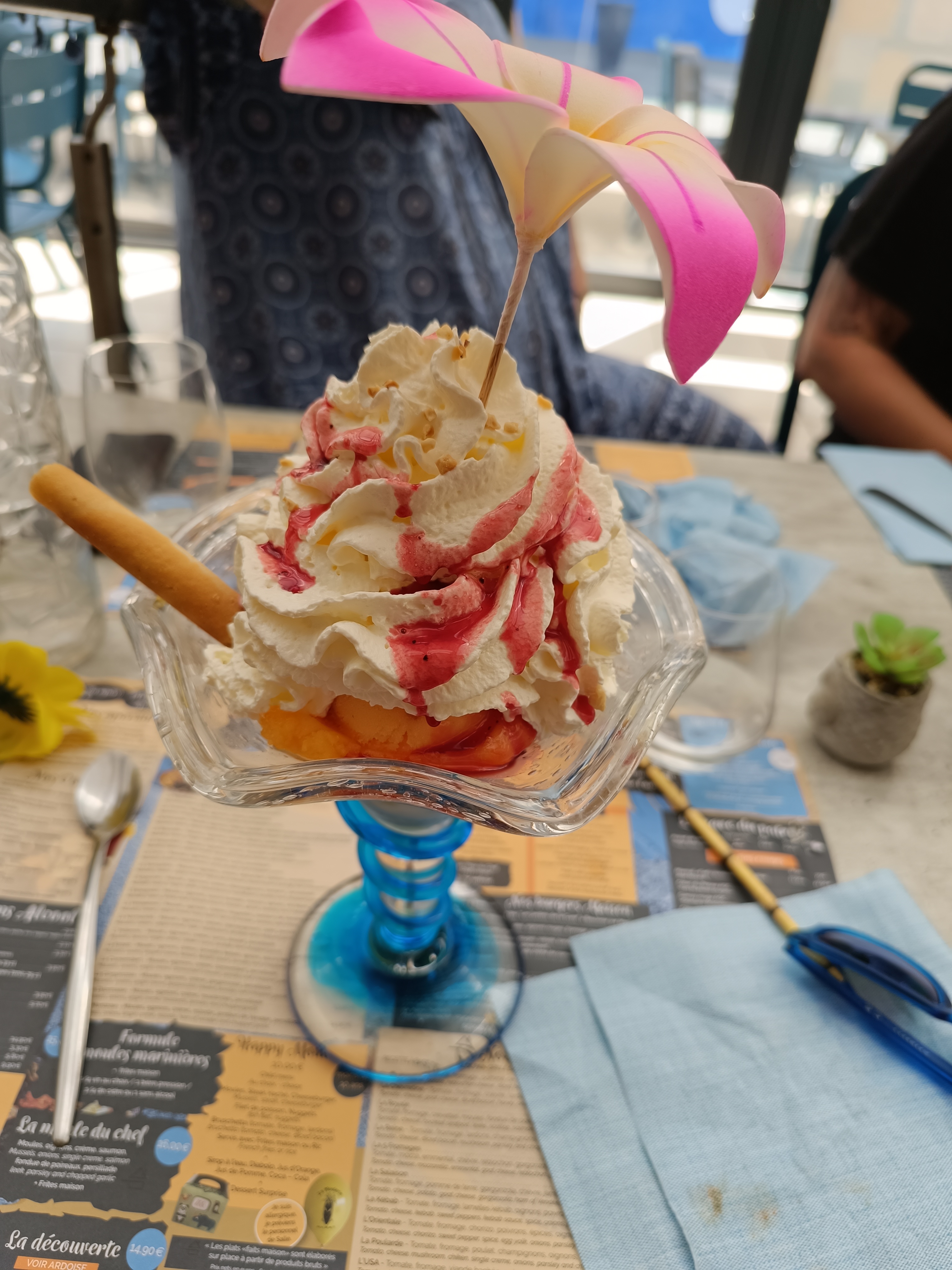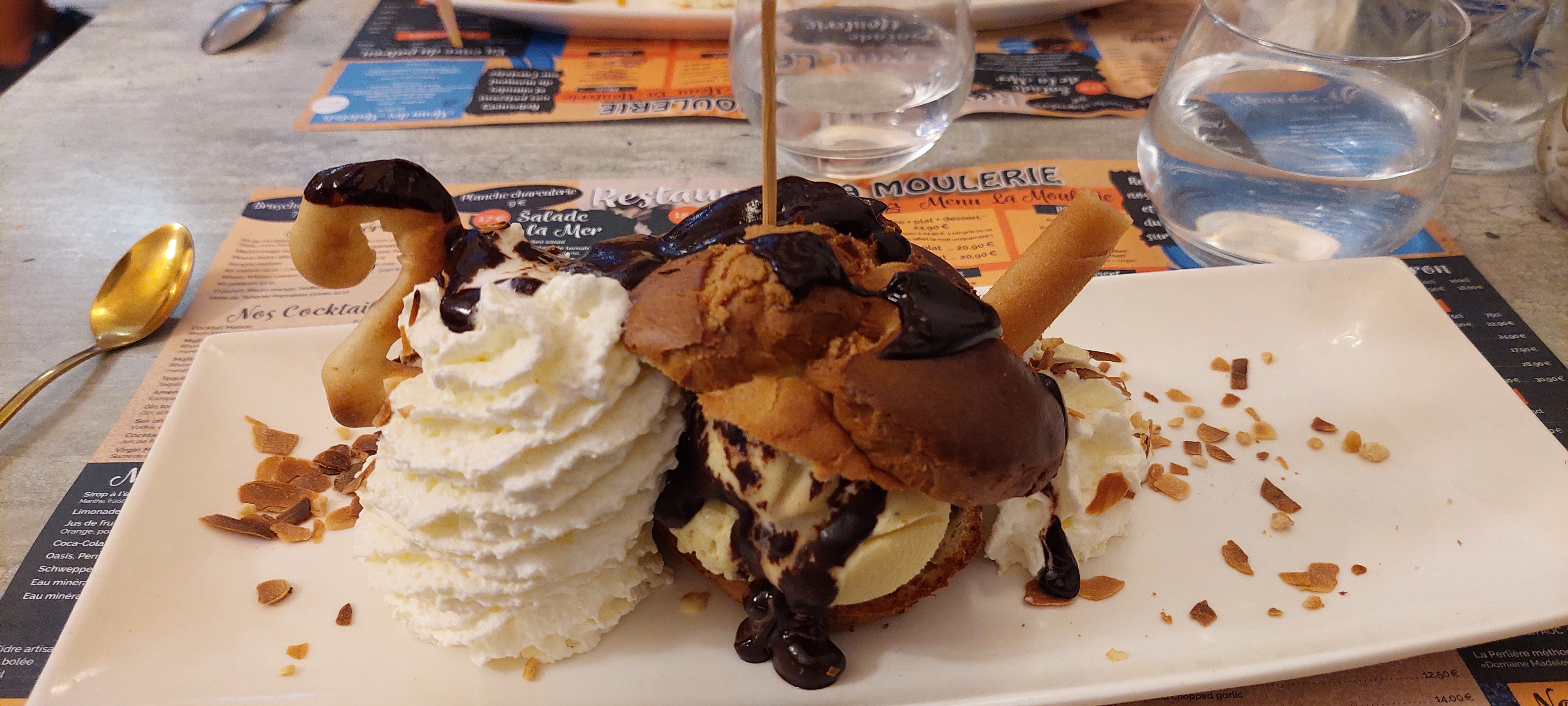 Après un accueil glacial, nous avons découvert un service peu rapide et efficace, des moules petites aux goûts très variés (franchement pas bonne à fade jusqu'à bonne rarement) et attention aux crabes, des frites maisons molles (même le petit les a trouvées bizarre) qui arrivent 5 minutes après les moules, pas de rince doigts (il nous a fallu les demander à plusieurs reprises). La carte des desserts est une de celles fournies aux restaurateurs par des industriels. On reconnaît la mise en page et le choix : 7 desserts standards (la crème brûlé, le fameux moelleux chocolat...) et des coupes glacées. La bonne surprise est que ces dernières sont chargées et copieuses pour qui aime la chantilly. Malgré cela nous n'y reviendrons pas.