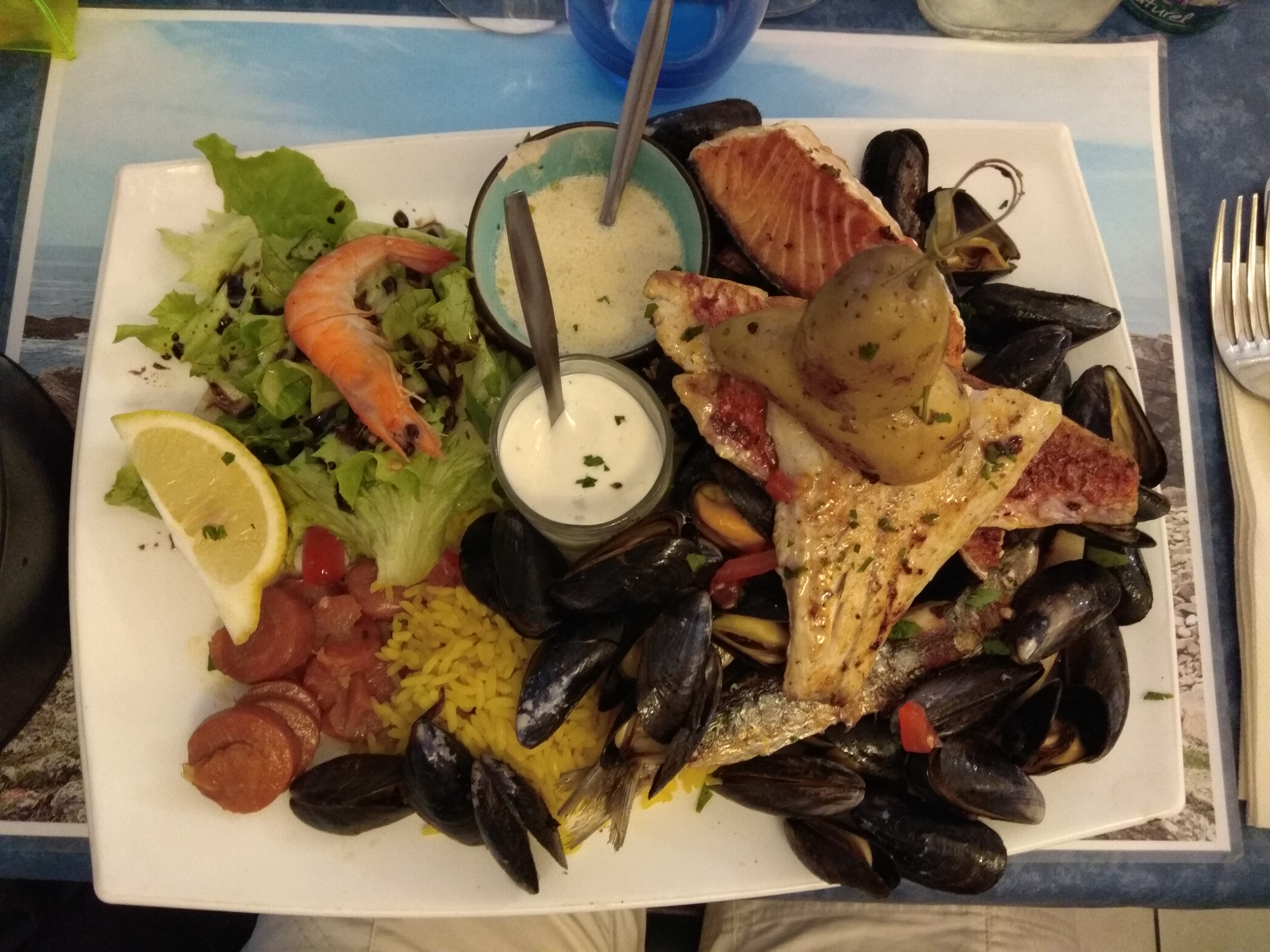 Bon accueil. Moules très bonnes. Le bar entier accompagné d'une bonne sauce avec riz et carrottes. Je recommande. Service rapide. Dessert très bien. Bon rapport qualité prix.