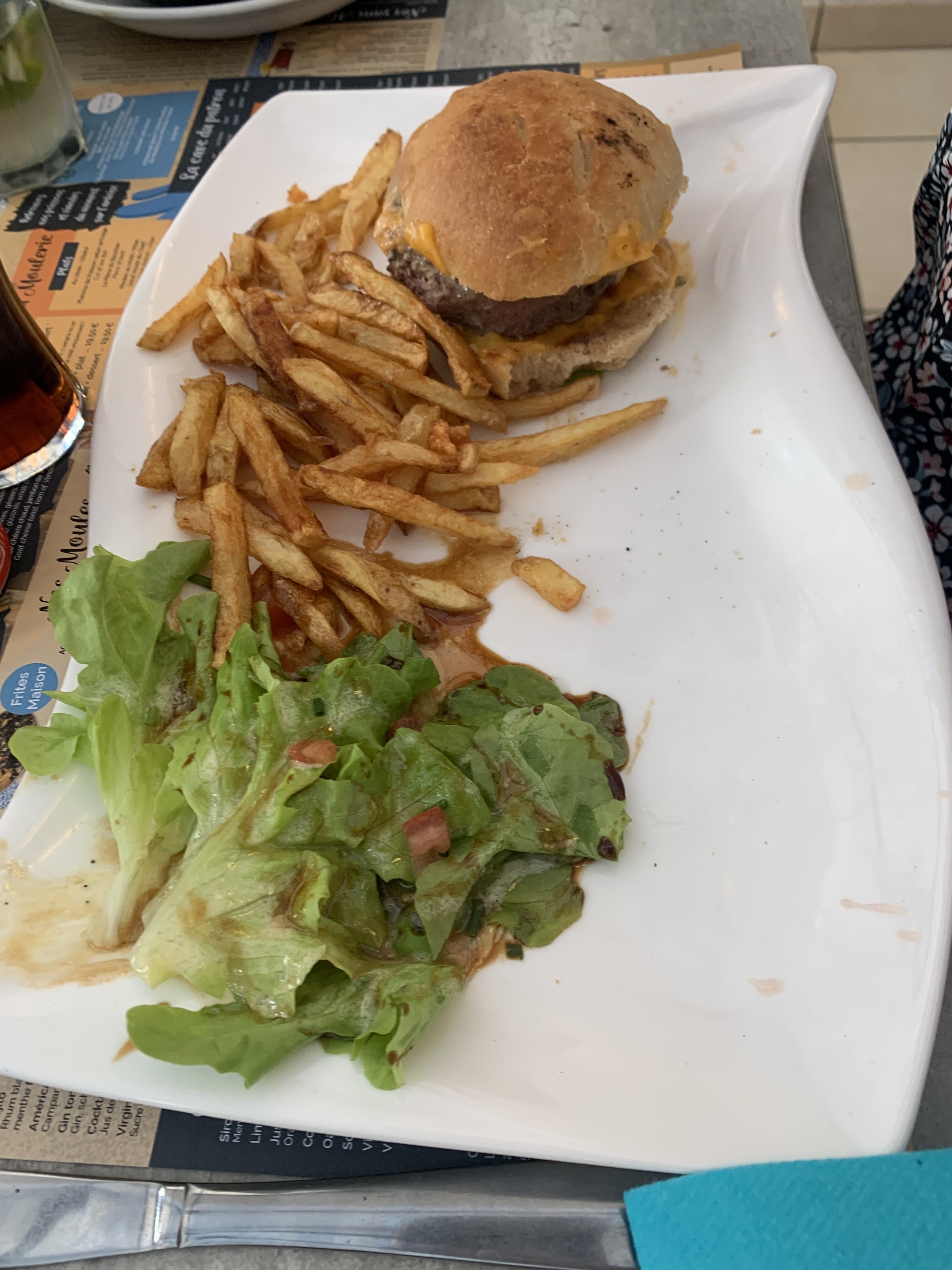 Moules délicieuses dans une bonne quantité et la version vendéenne : avec jambon et mogettes du pays m'ont régalée. Le burger choisi par mon époux avec pain, galette de pommes de terre et steak haché maison un peu lourd mais savoureux.