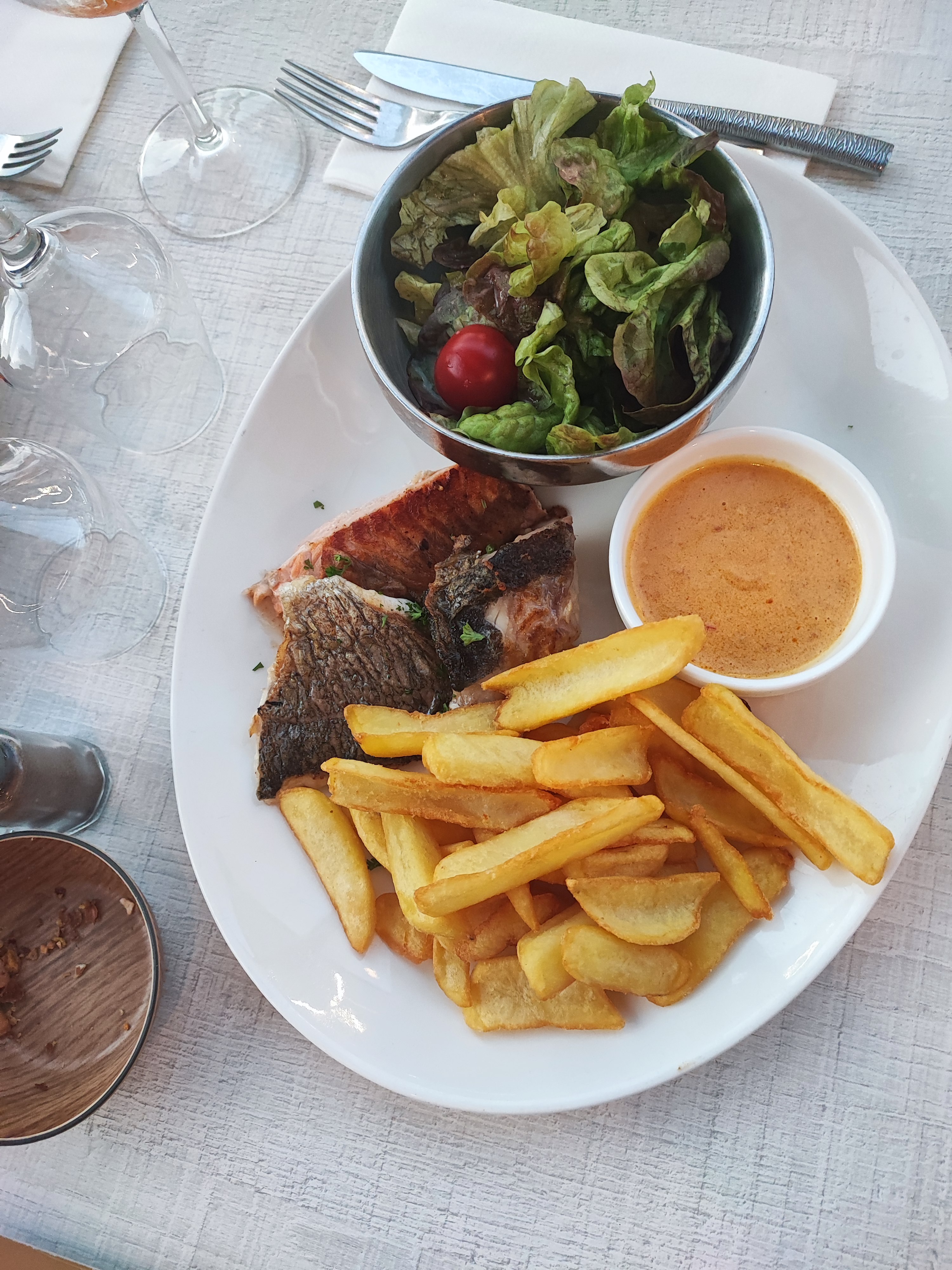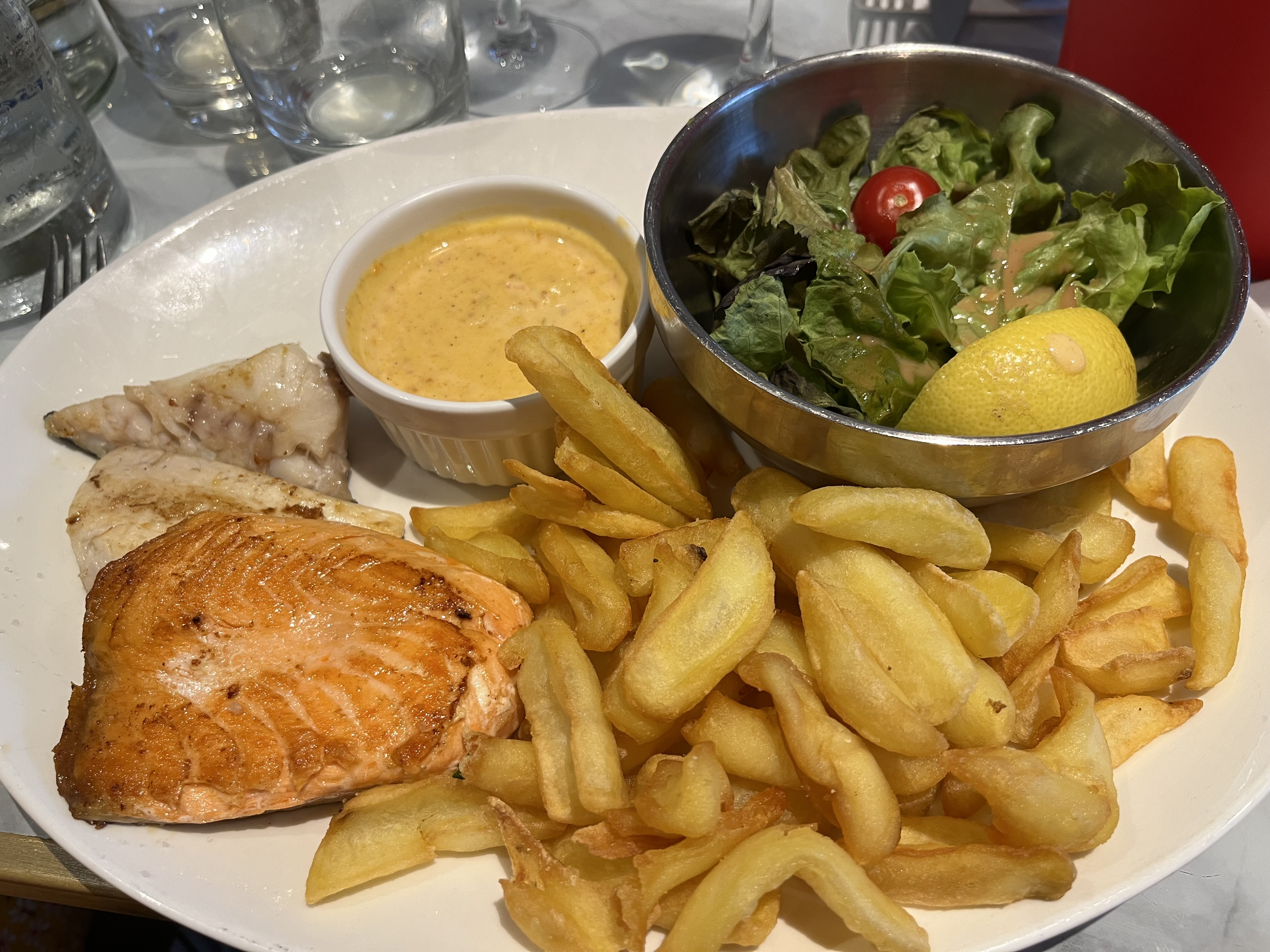 Soyons constructifs goûté moules différentes sauces et saumon avec purée maison rien à redire la cuisine est très bonne. Côté service malheureusement c'est la cata pas d'eau pas de pain on en demande on sent qu'on ennui et un micro bout de pain par personne venant d'un magasin genre aldi pour un restaurant c'est limite il faut manger vite très vite il faut que ça brasse mais le pire est l'apéritif servi avec de la sauce à moule sur le verre et les sceaux pour les coquilles de moules posés sur la table plein de sauce dégueulasse pour une facture proche des100€ pour 2 adultes et 2 enfants très déçu dommage car la cuisine est vraiment bonne mais service tout est à revoir. Pour les même prix des restaurant juste à côté vous offre un bien meilleur service.