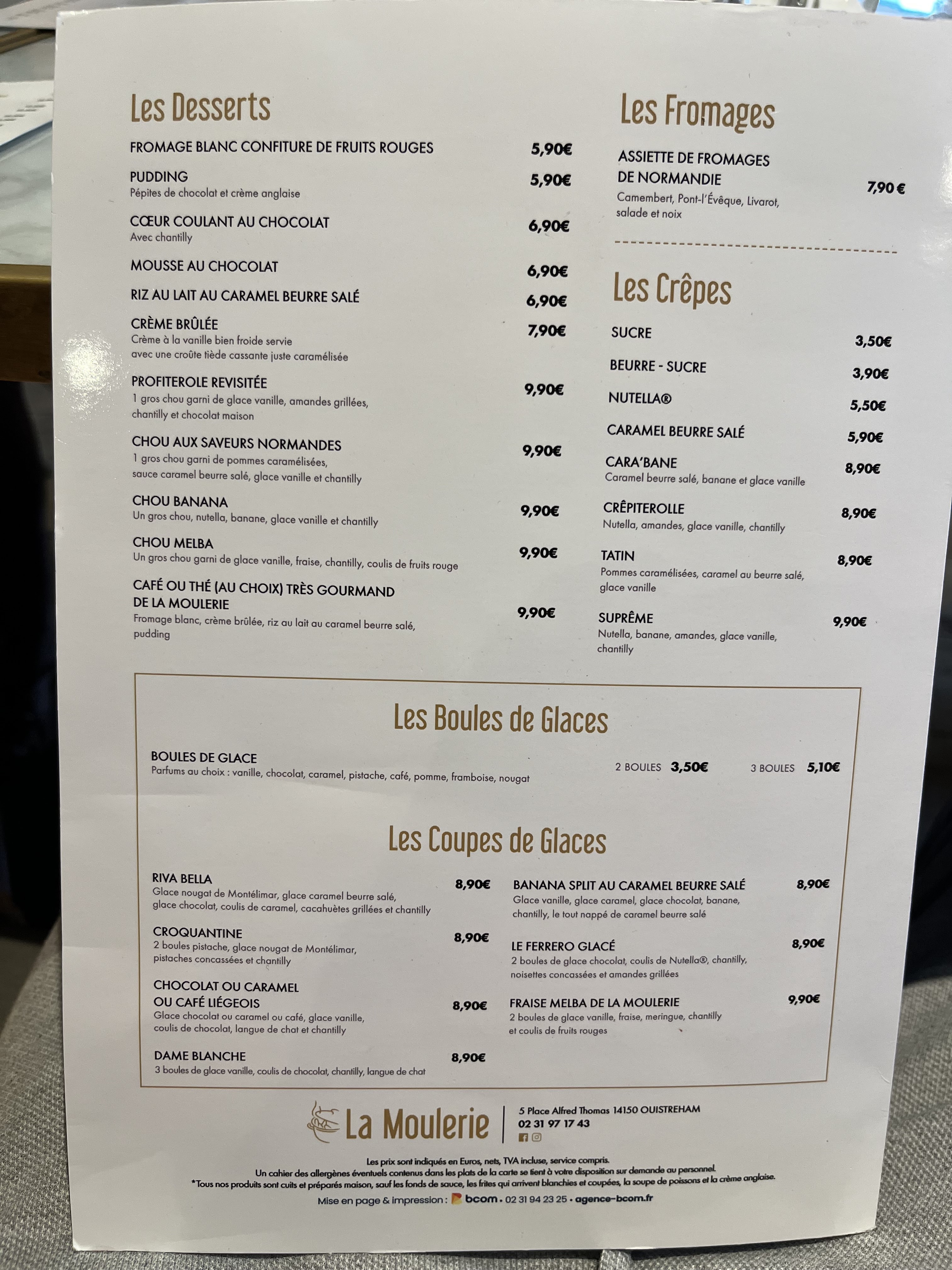 Moules au Camembert très bonnes, on y mange relativement bien. Décoration raffinée à l’intérieur. Ambiance un peu bruyante vu le monde. Dessert un peu cher: 3 boules de glaces 8€90, c’est un peu excessif…