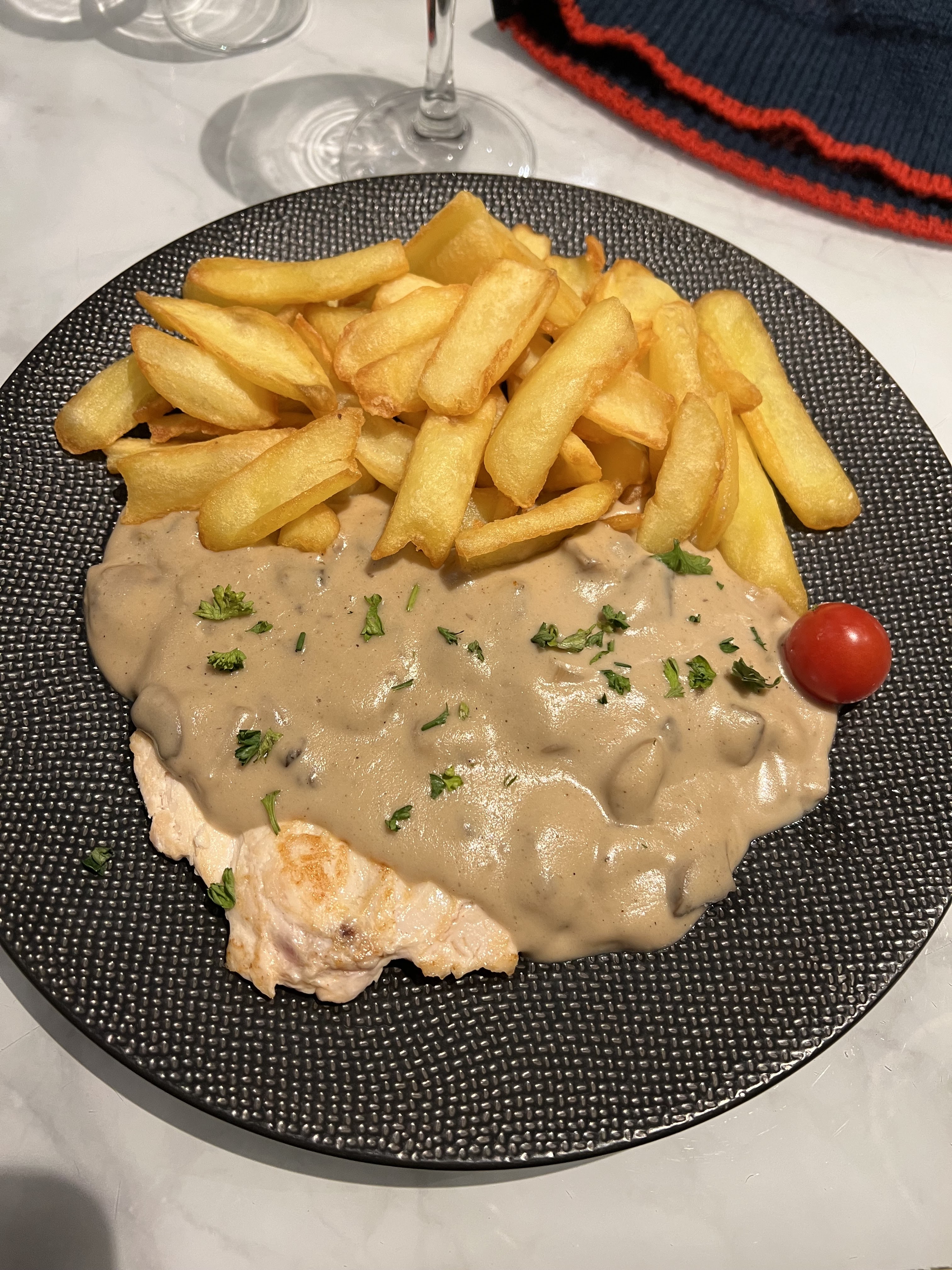 Cuisine pas top!! Dorade trop cuite, sans goût, escalope normande idem (avec champignons boîte ou surgelés) galette complète toute sèche.. Sans intérêt!!