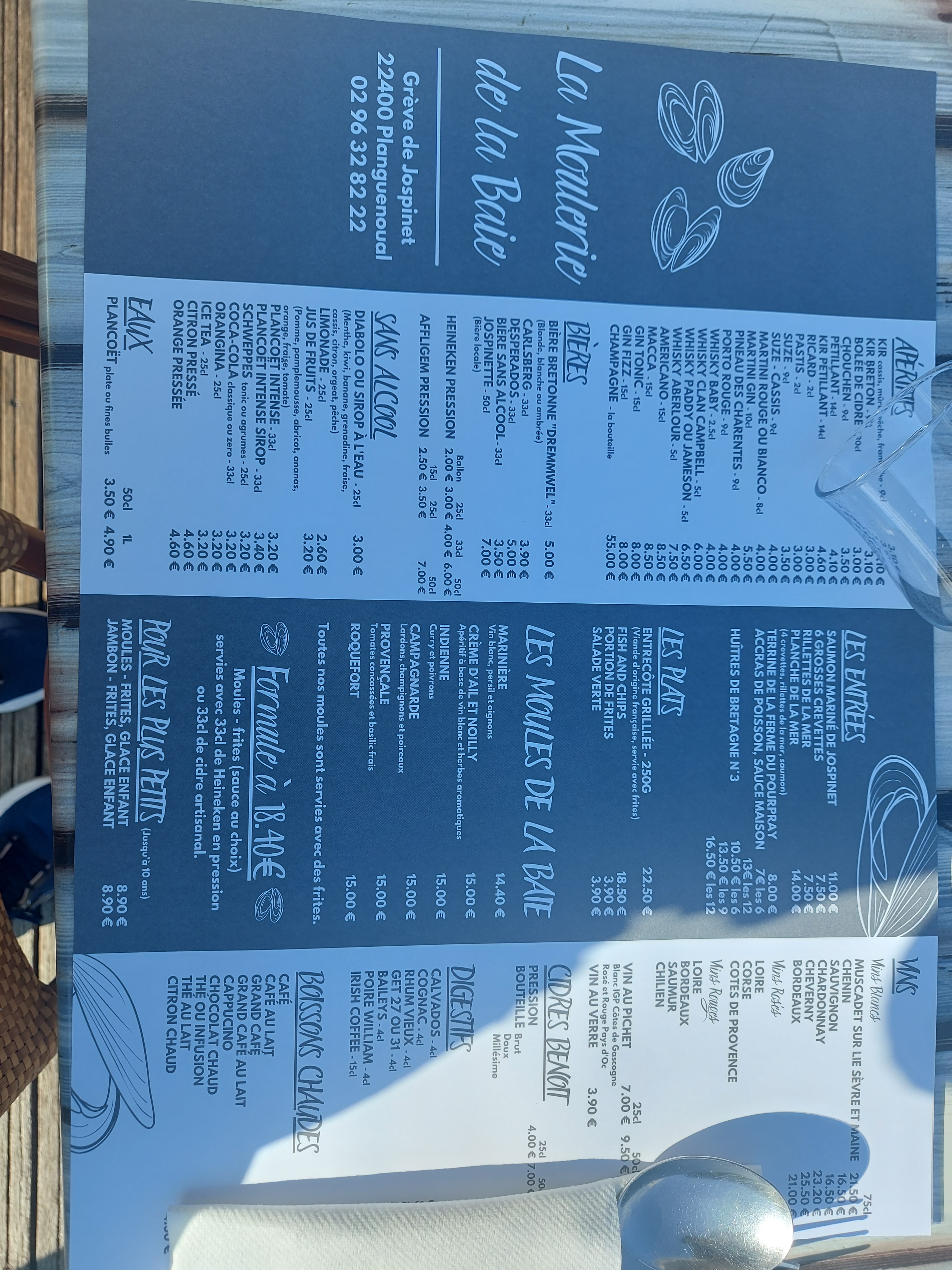 Nous sommes venus pour fêter un anniversaire. Nous avons très bien été accueillis le personnel est agréable et serviable. Le cadre est super beau en plus face à la mer. Les moules viennent directement de la plage. Très bon rapport qualité/prix Moi qui n’aime pas les moules j’ai pu quand même manger de la viande et ça c’est super !! Merci de penser à tout le monde Et les desserts alala c’est tellement bon On reviendra ça c’est sûr Je vous recommande a 2000%
