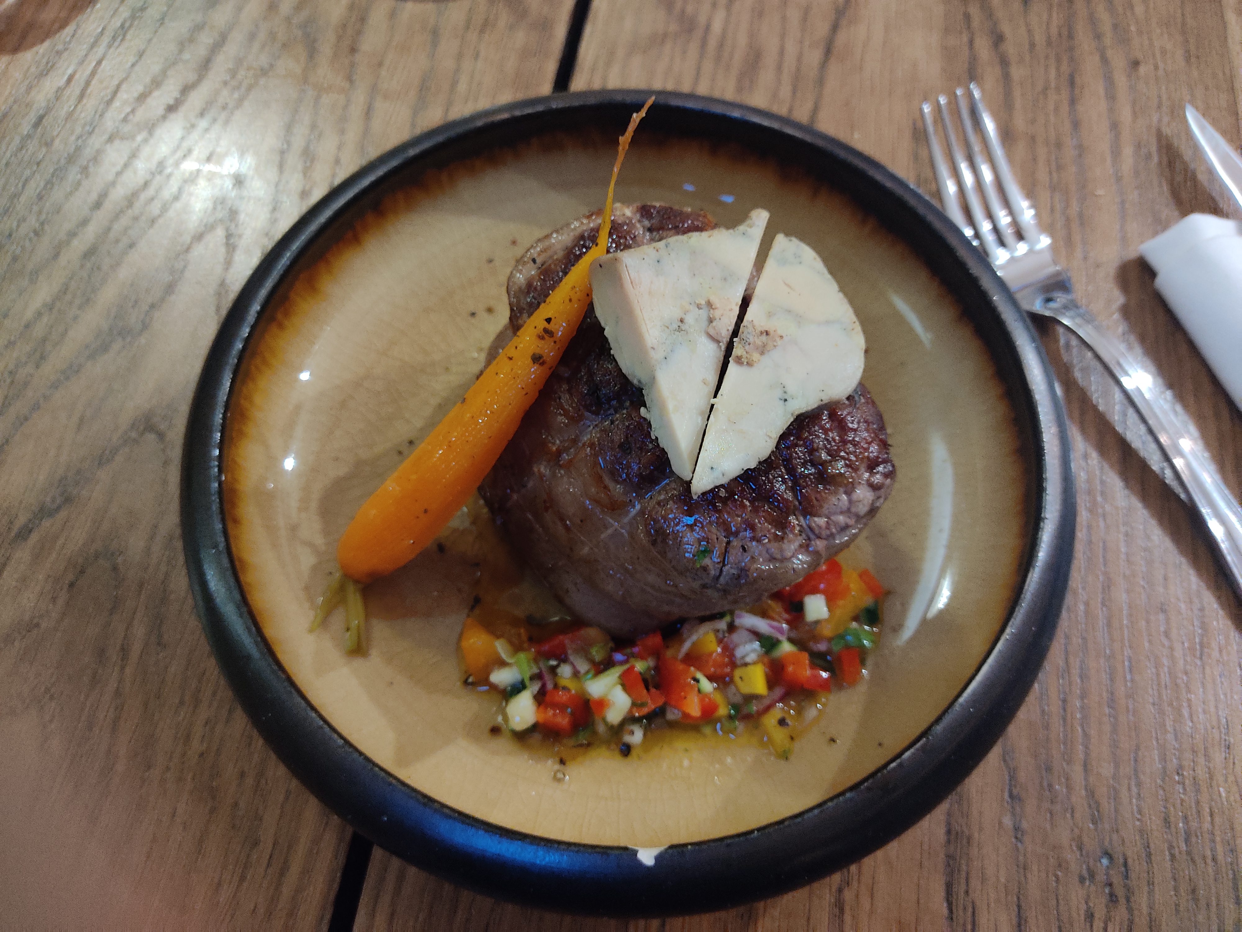Site extérieur très agréable. Intérieur très stylé. Carte variée. Une petite sauce pourrai maintenir une température sur cet epais et goûtu filet de boeuf, à mon avis.