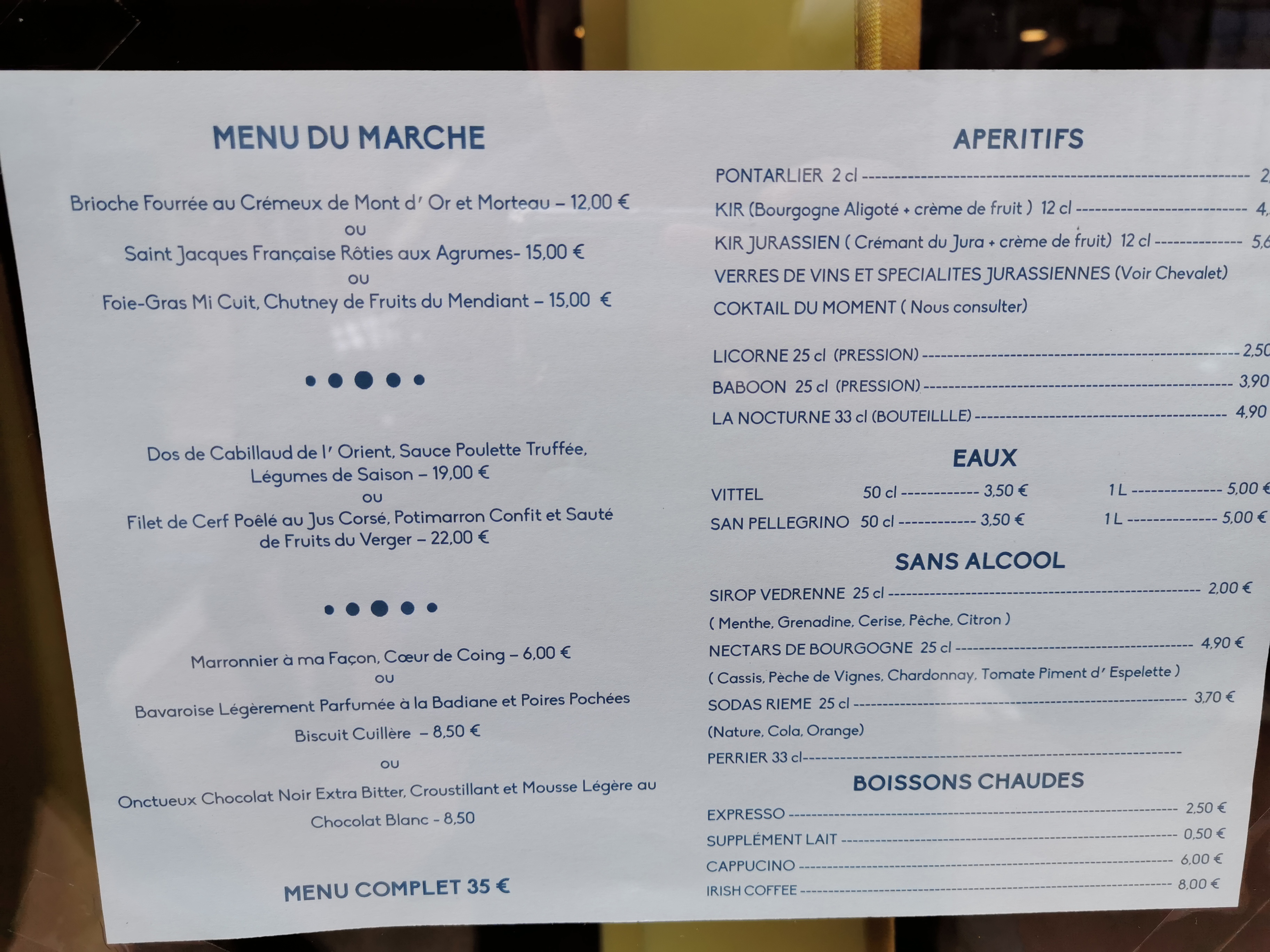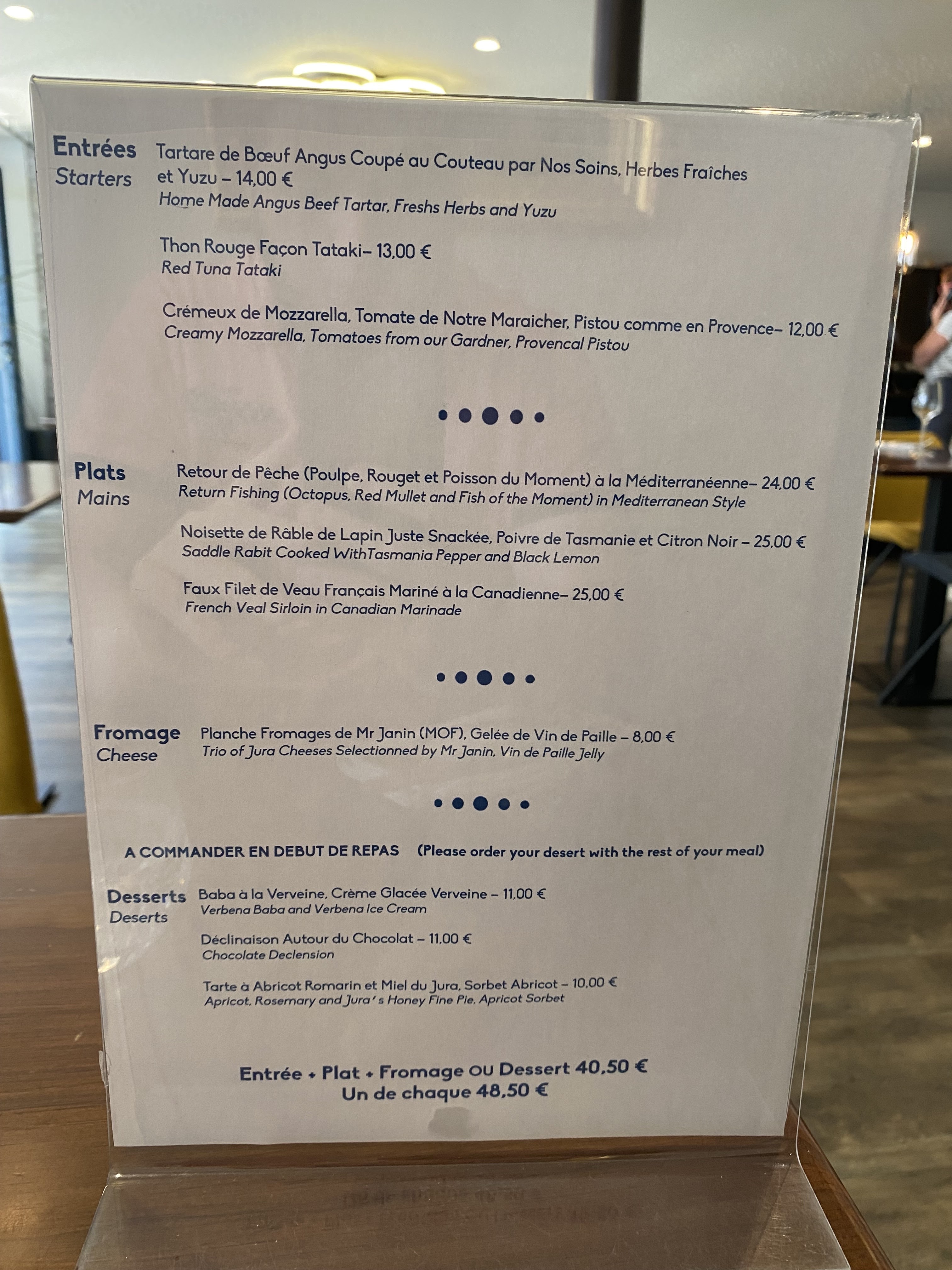 menu du jour super . dommage que nous n'habitions pas la région car nous serions revenus decouvrir les menus gastronomiques. service impeccable et très agréable. Allez y sans problème.