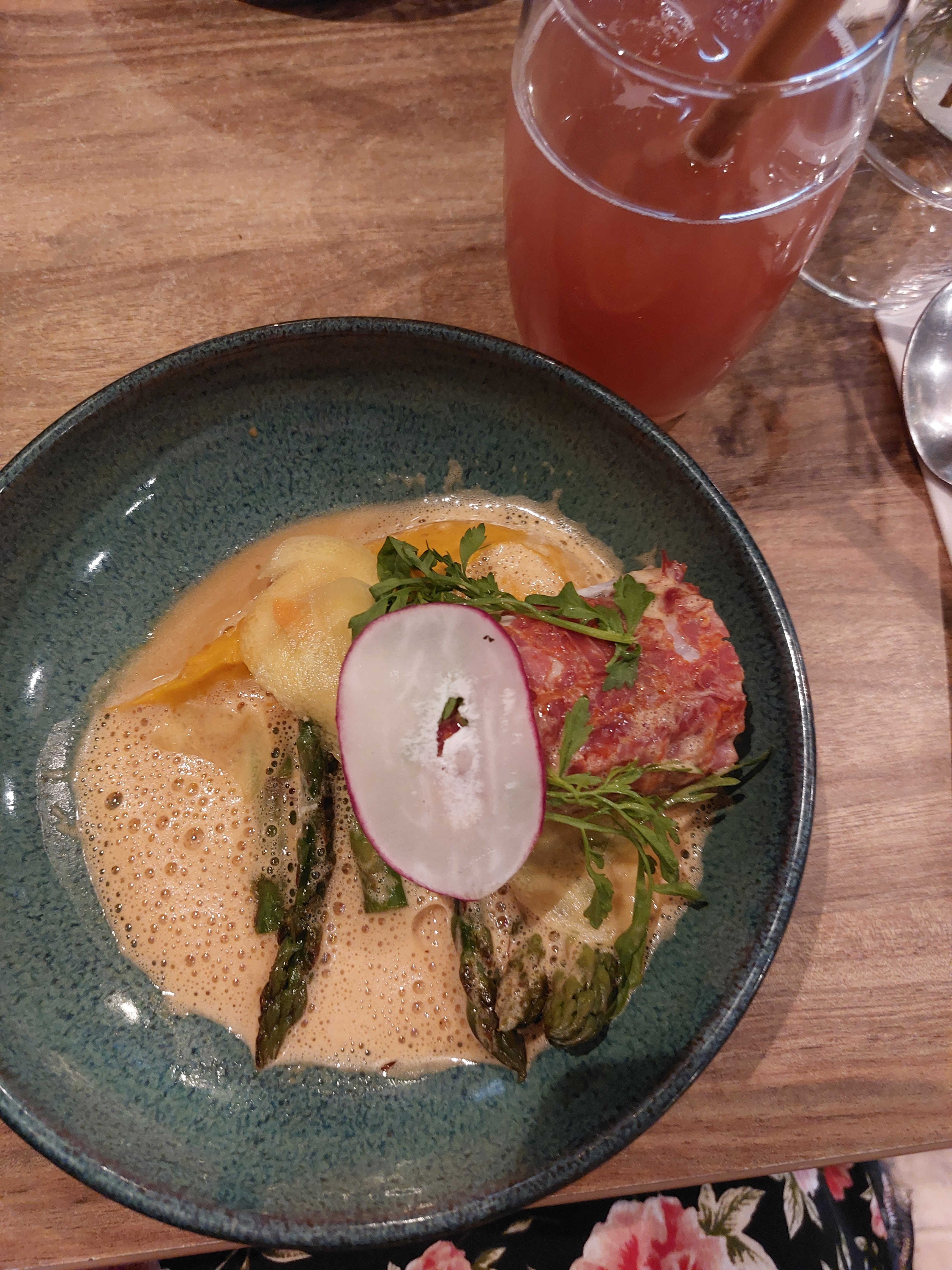 Une excellente adresse avec des produits de saison et de qualité et qui ont du goût. Belle assiette, juste ce qu'il faut, quelques cocktails à un prix très raisonnable. Bon rapport qualité/prix, il est impératif de réserver. La petite salle en bas est très agréable, plus intimiste et moins bruyante et joliment décorée, on s'y sent bien, je recommande. Nous étions assis sur une banquette en rotin un peu basse par rapport à la table, nous avons demandé s'il était possible d'avoir des coussins et on nous les a gentiment apportés, c'était cool. Service impeccable et très agréable, toute l'équipe d'ailleurs. Un grand bravo au chef, une première expérience pour nous quatre, nous y reviendrons assurément.