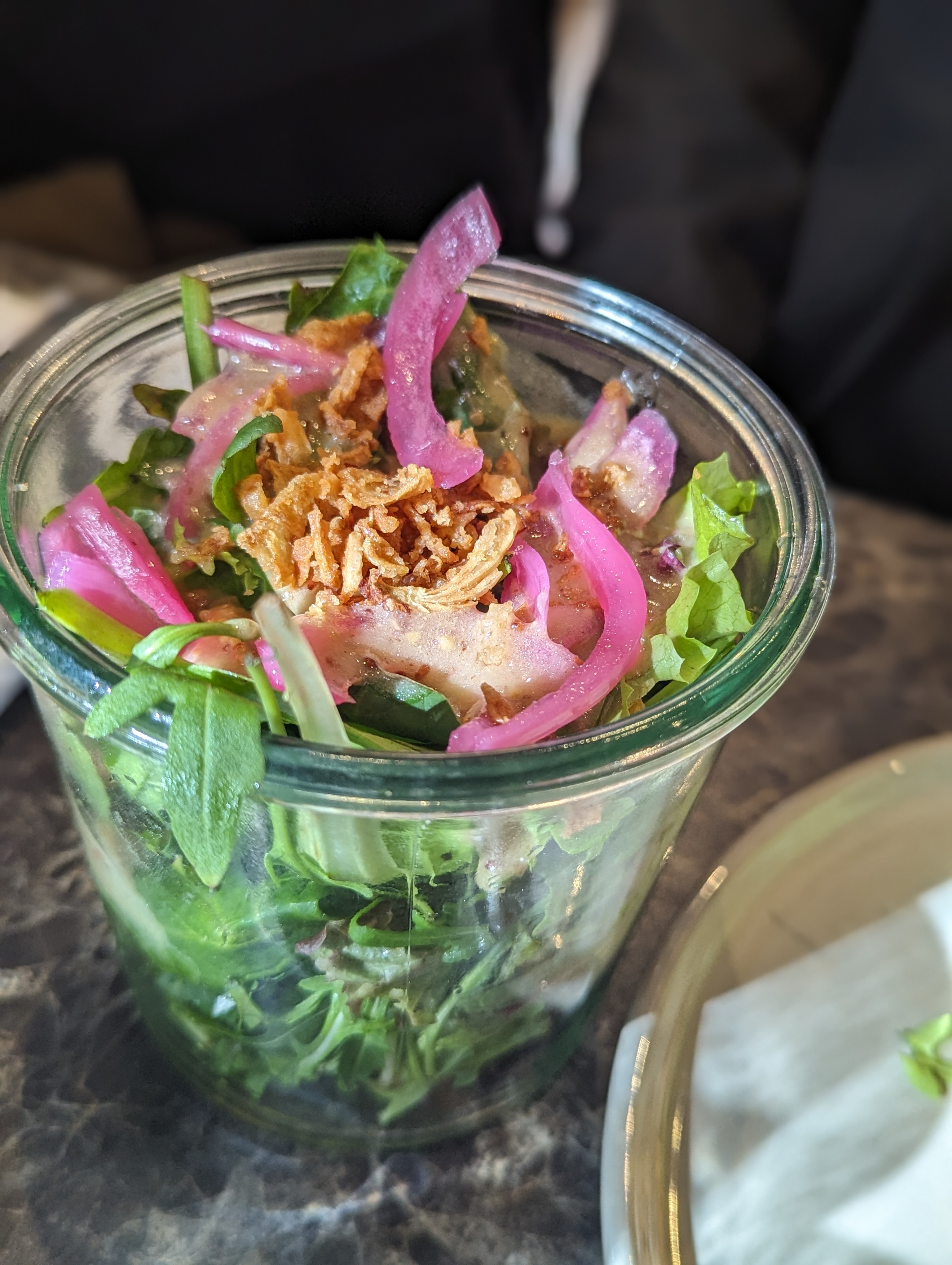 Les plats sont servis de façon originale...dans un petit bocal. C'était délicieux. Nous avons découvert le menu de Noël : La lotte, comme le chapon ou le risotto d'épeautre étaient excellents L'ambiance est chaleureuse et cool. Nous avons été servis rapidement.