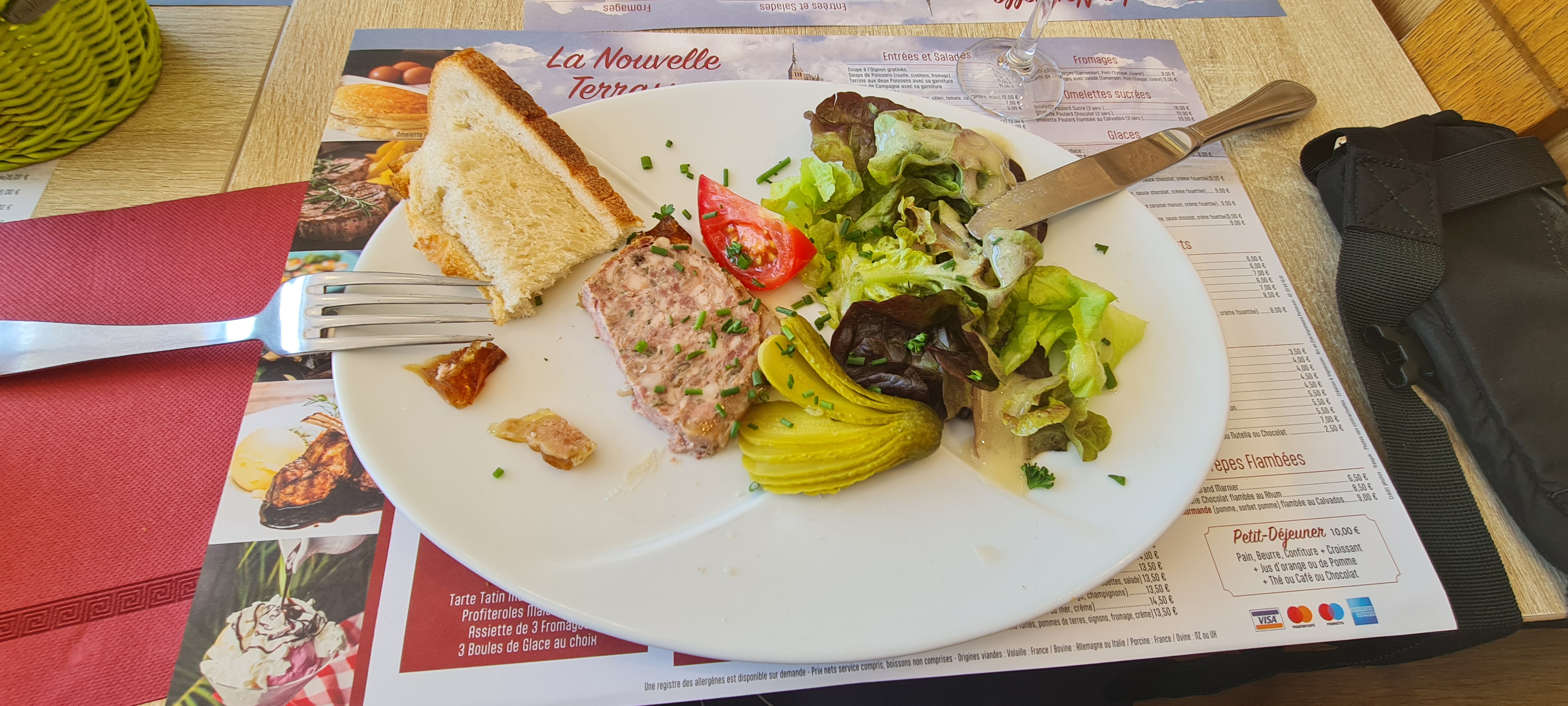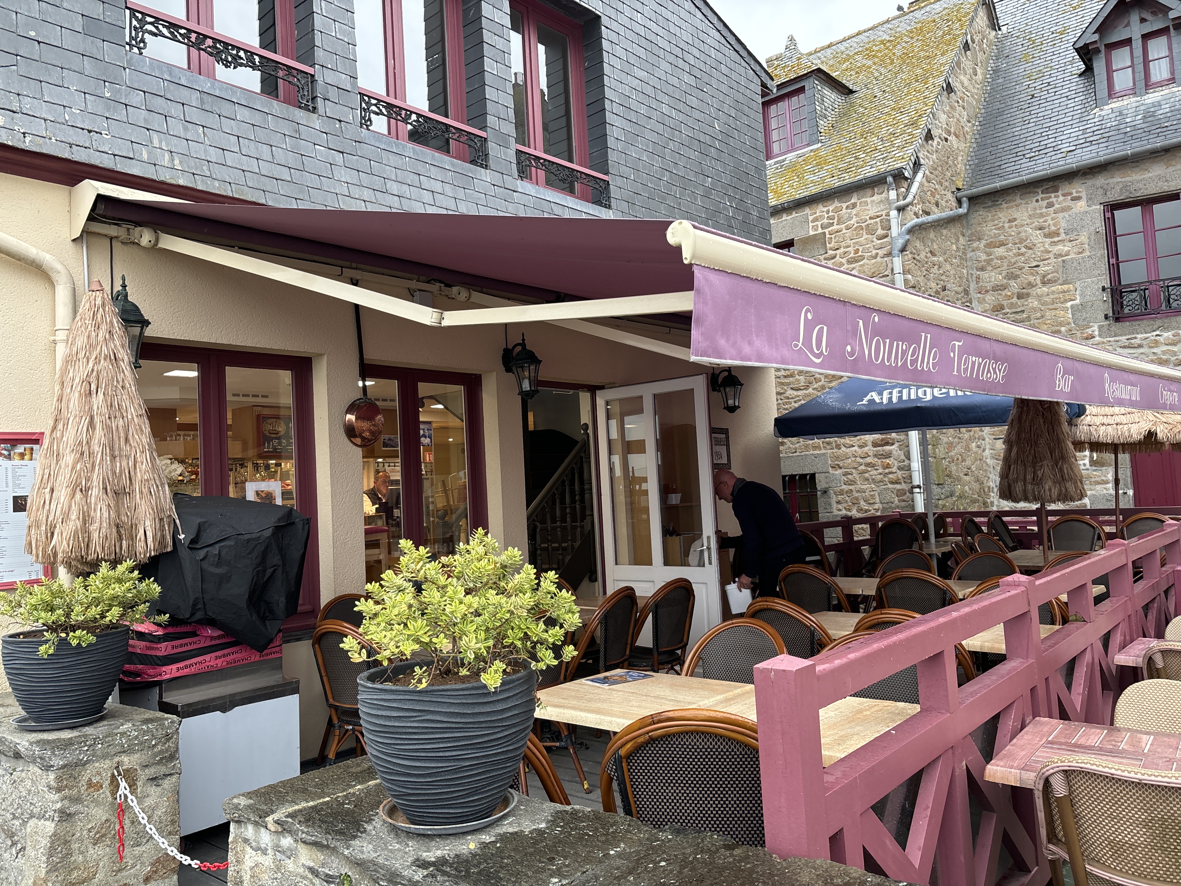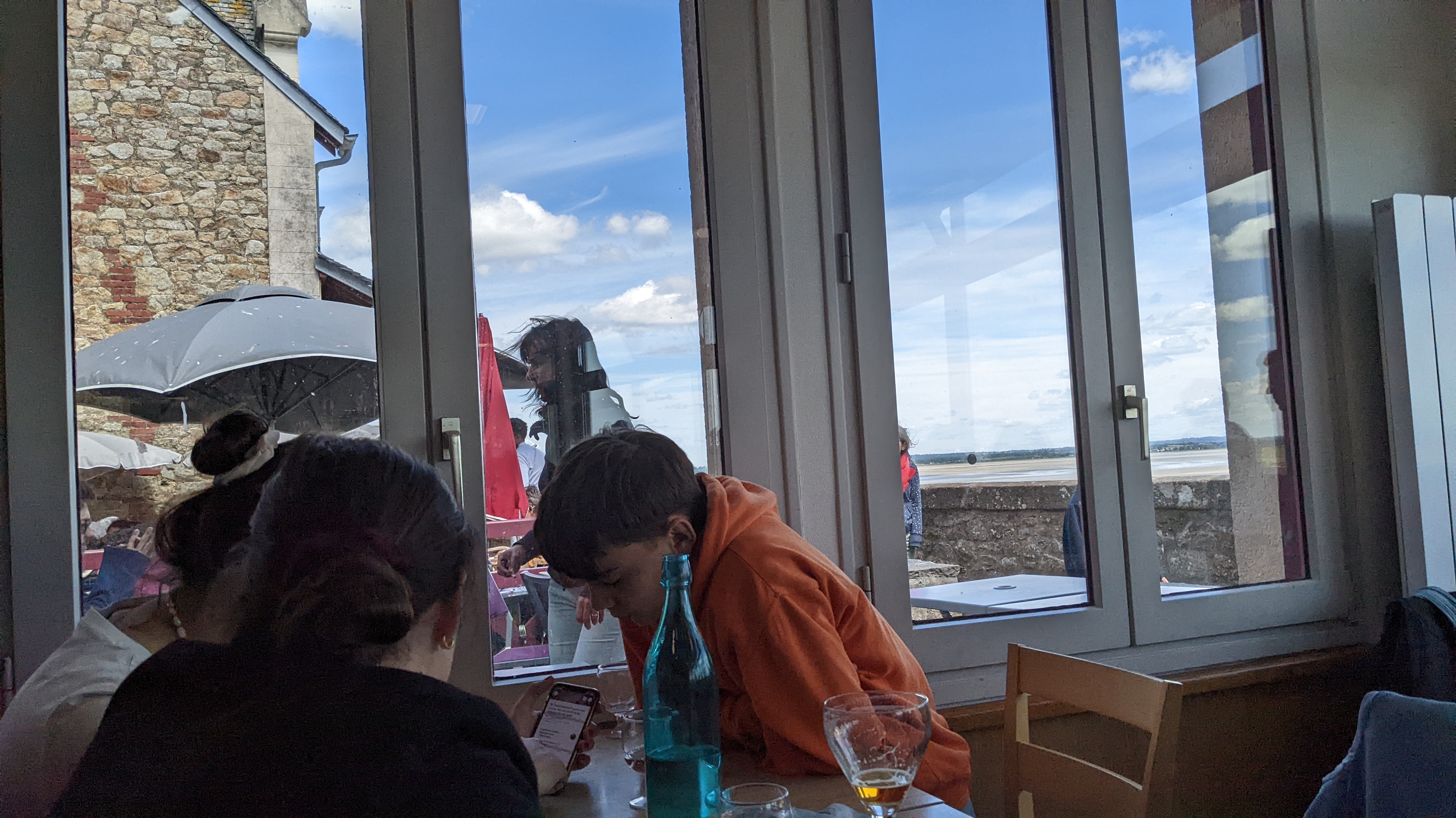 Bonne adresse pour se reposer après la montée du Mont saint Michel. Je n’y ai pas mangé mais j’ai vu des gens y manger et ça avait l’air pas mal. La vue est très belle de cette terrasse.