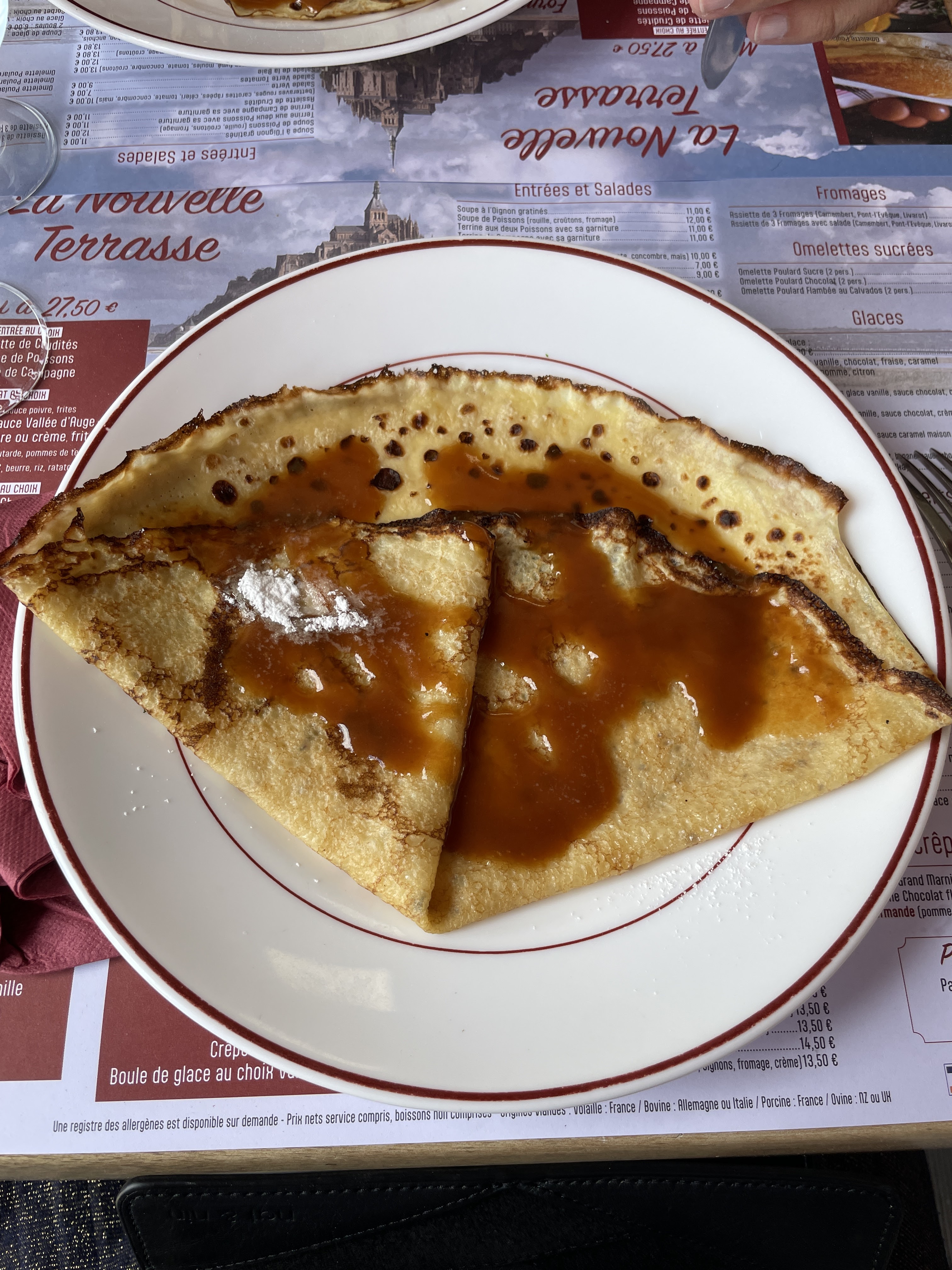 Il y a énormément de monde dans le coin et difficile de trouver un endroit avec vue 😁. (À côté, nous avons été complètement ignorés pendant 10 minutes après qu'on nous ait dit de nous asseoir) Après nous être assis à cet endroit et essayé de pratiquer notre français limité (les touristes devraient tous essayer), le personnel était incroyable. Leur anglais est assez courant. À ESSAYER : Soupe à l'oignon et crêpe au caramel - toutes deux faites maison. Les moules, la tarte normande et la crêpe au sucre étaient délicieuses. Tout le reste allait bien - Galette, salade (je ne sais pas de quoi les gens se plaignaient). Les prix étaient raisonnables - je m'attendais à bien pire pour l'emplacement.
