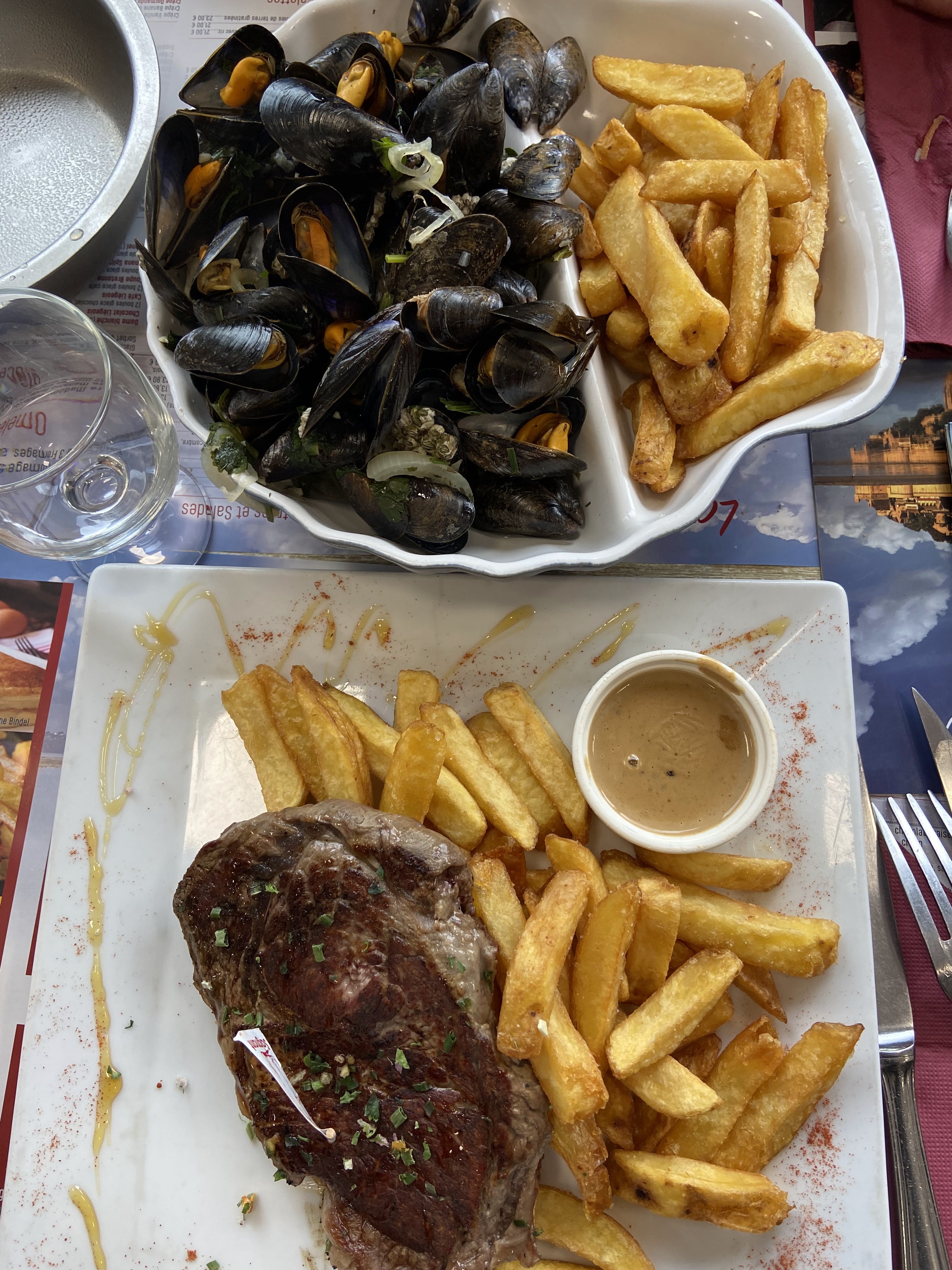 Nous avons pris des moules : plat dégoûtant, moules minuscules avec un goût indéfinissable, les frites par contre étaient bonnes La terrine en entrée bien grasse, le dessert : moelleux au chocolat correct par contre la crème anglaise sans goût et la chantilly goût douteux. Bref dommage que pour la visite d’un lieu aussi mythique la journée ne ce soit pas conclue par un bon repas.