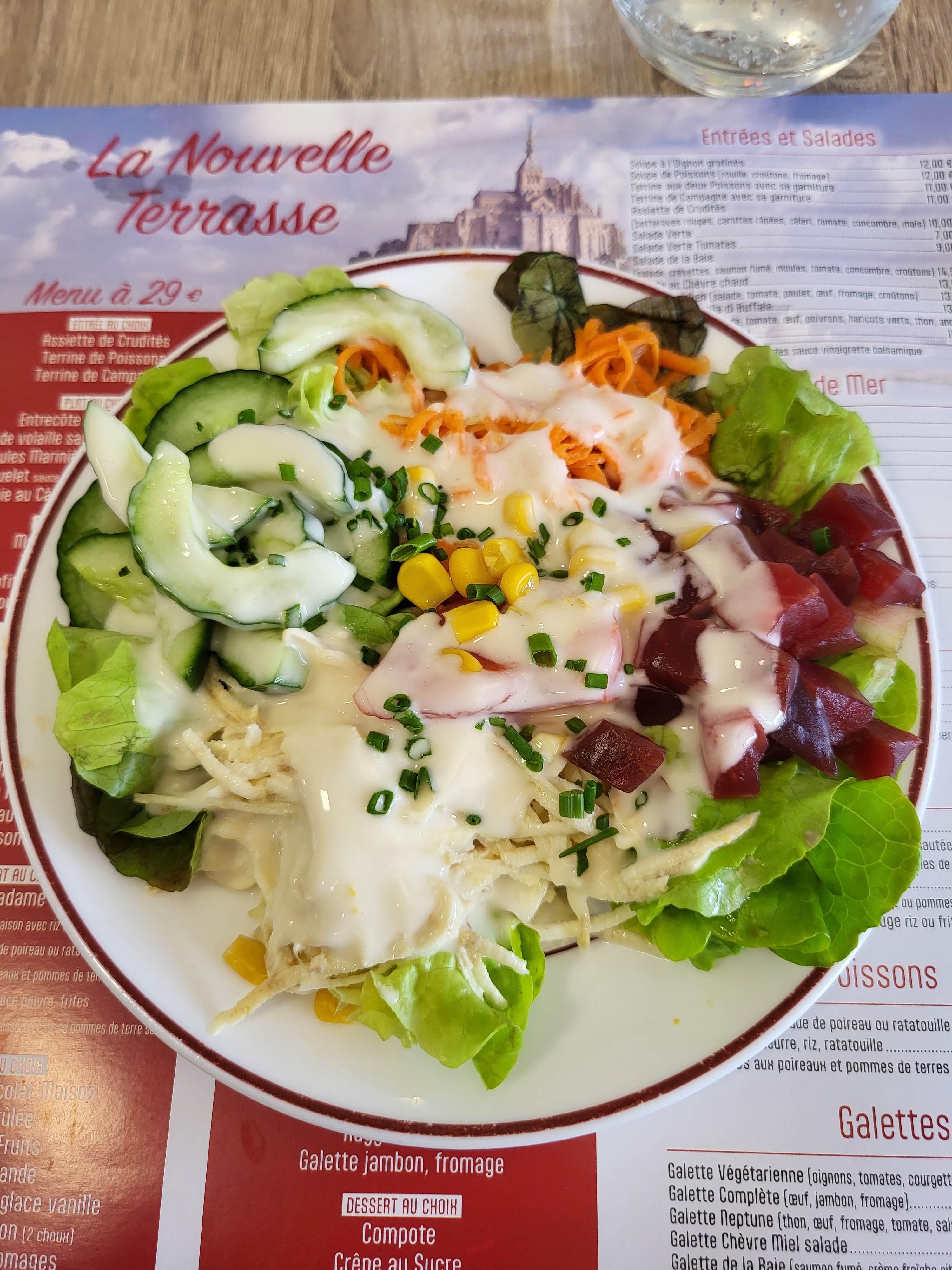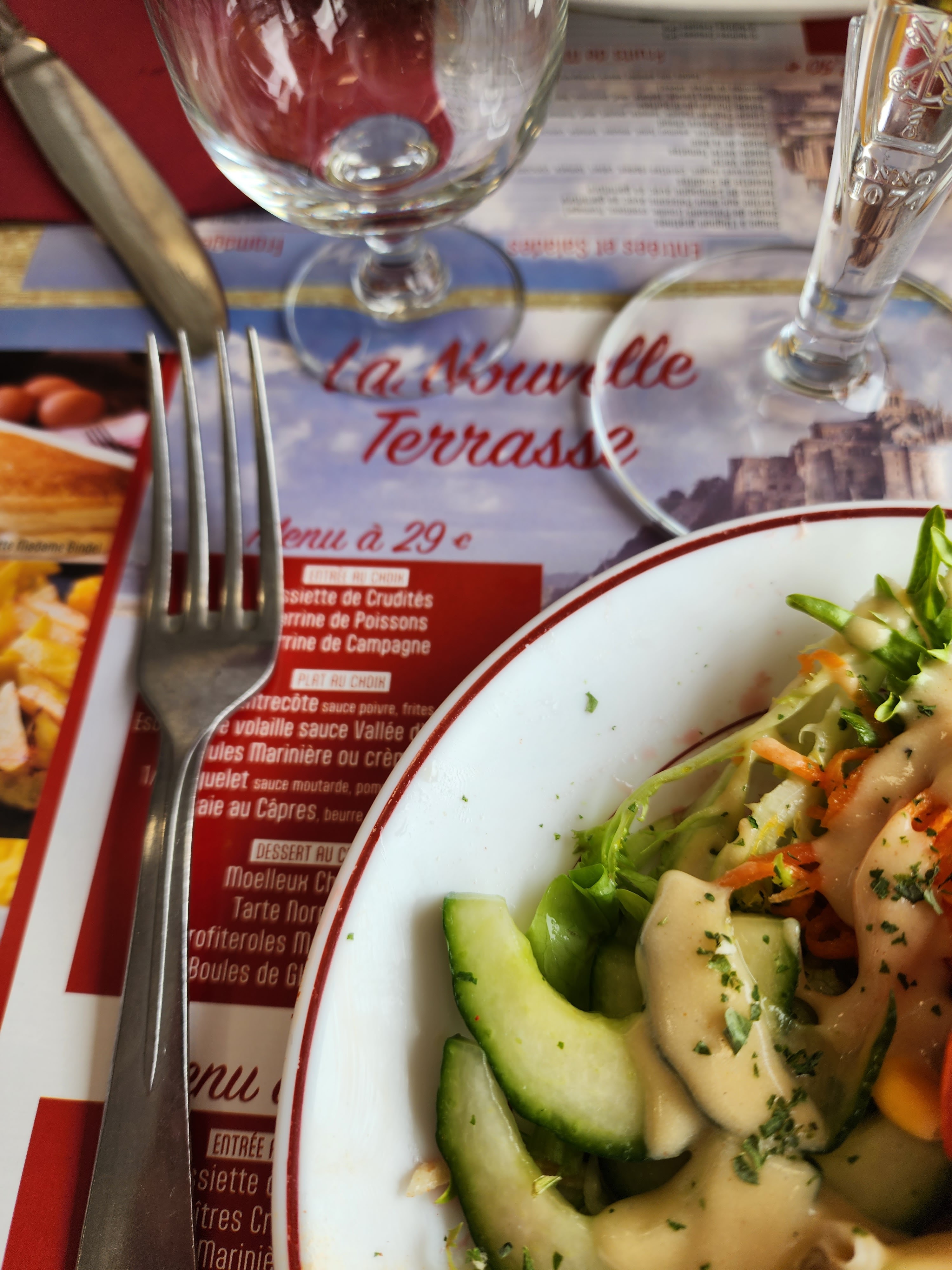 Mauvais nom de restaurant, il devrait s'appelait la terrasse exiguë. Les clients sont entassés, il ne faut pas prendre trop de place ! J'ai mangé la pire galette complete de ma vie : pas assez cuite, collante, emmental chewing-gumeux Que dire des prix ... sans doute impactés par la taxe Mont-Saint-Michel ... Et en plus on a voulu nous faire payer l'addition d'une autre table qui était 2 fois plus cher que la notre ! Passez votre tour, c'est mon meilleur conseil ...