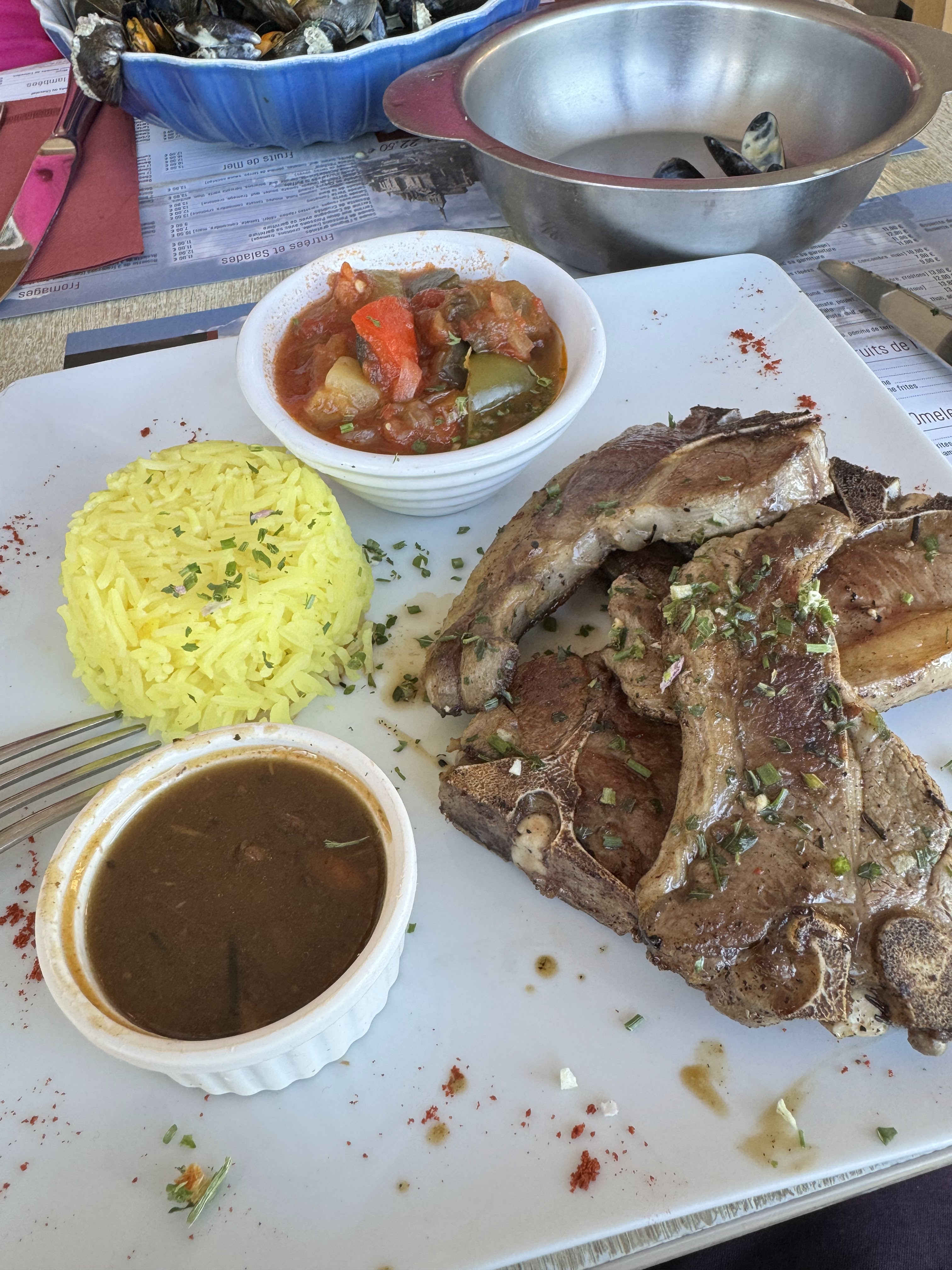 Cet endroit est un peu difficile à trouver. On traverse une petite ruelle puis on monte les escaliers. Sièges intérieurs et extérieurs avec une belle vue. La côtelette de lampe était plutôt bien cuite lorsqu’elle était demandée à point, mais elle est toujours très tendre et est accompagnée d’une délicieuse sauce. Un grand bol de muscles, mais certains d'entre eux étaient minuscules, préféreraient les gros. Le cidre était rafraîchissant pour étancher sa soif après tant d'étapes.