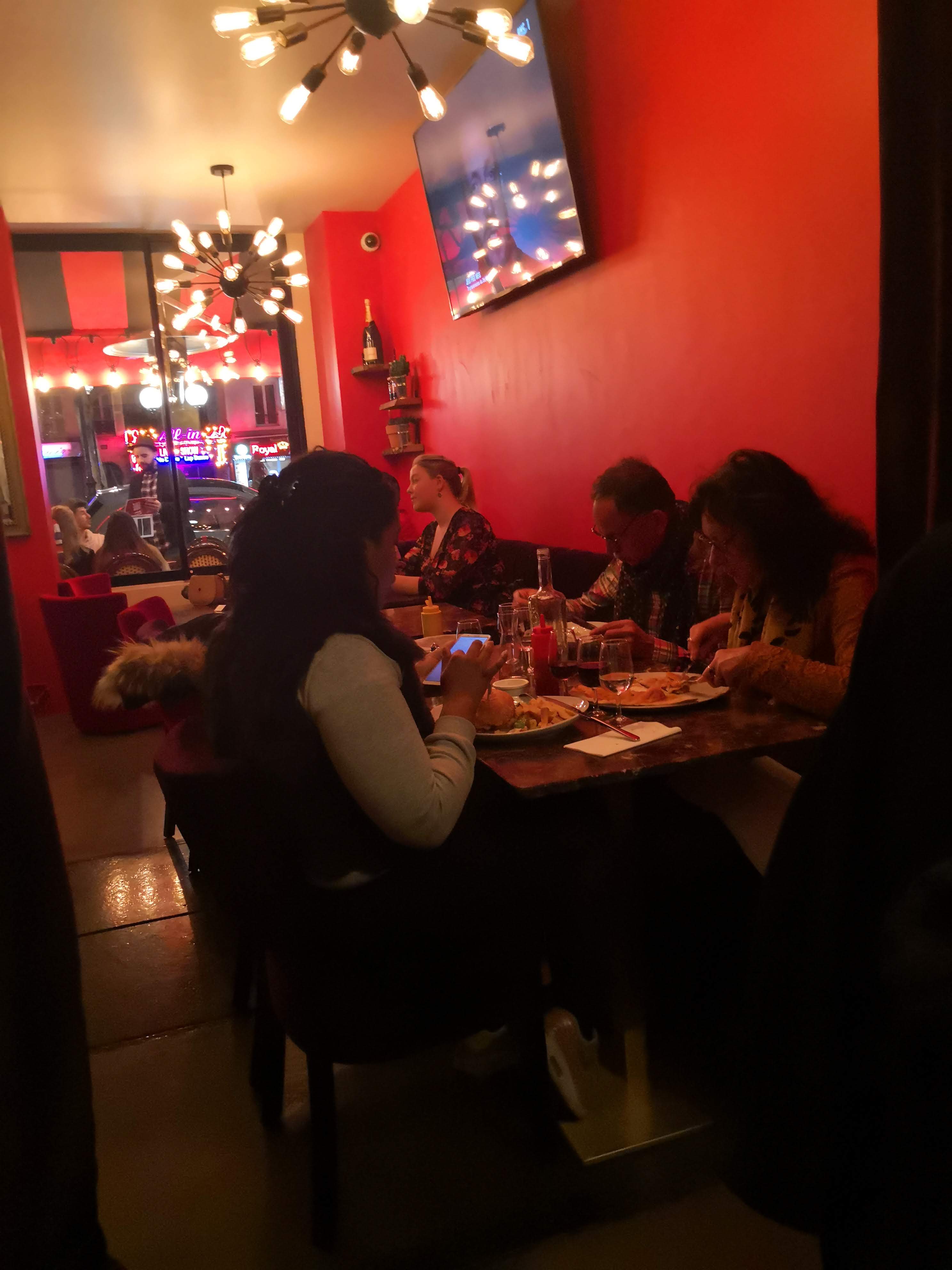 Le restaurant a une ambiance apaisante et le personnel était très sympathique et chaleureux. J'ai aimé la décoration de l'endroit entièrement rouge. Ils ont également des sièges à l'extérieur. Nous avons pris l'un des bons repas de Paris dans cet endroit. Nous avons commandé une pizza végétarienne et une omelette aux champignons. Ils avaient un goût délicieux. L'omelette était accompagnée de frites et de salade fraîche. Ils servent également des boissons incroyables. Le meilleur, c'est que le personnel comprenait l'anglais. Visitez certainement cet endroit si vous êtes près du Moulin Rouge à Paris. C'est à 2 minutes à pied de là. Sa distance est égale aux arrêts de métro Blanche et Pigalle.