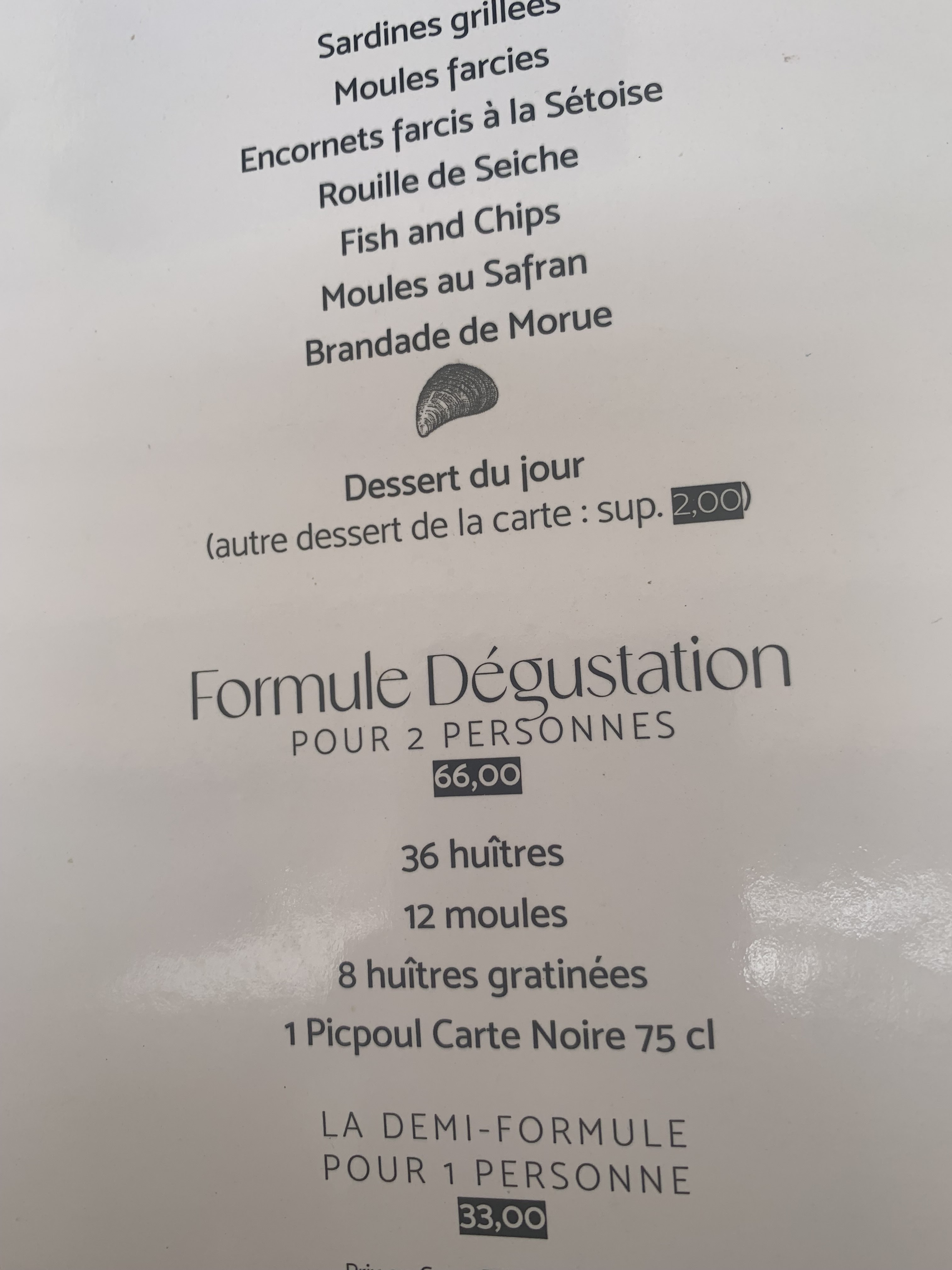 Nous avons pris un plateau pour 2 à 58euros. Bien copieux, frais il était parfait. En entrée une tielle Setoise et une demie bouteille de vin blanc local compris dans les 58 euros. C était excellent et le service parfait avec un serveur courtois et à l écoute. Vous pouvez même repartir avec une bouriche d huître, car ils sont producteur.