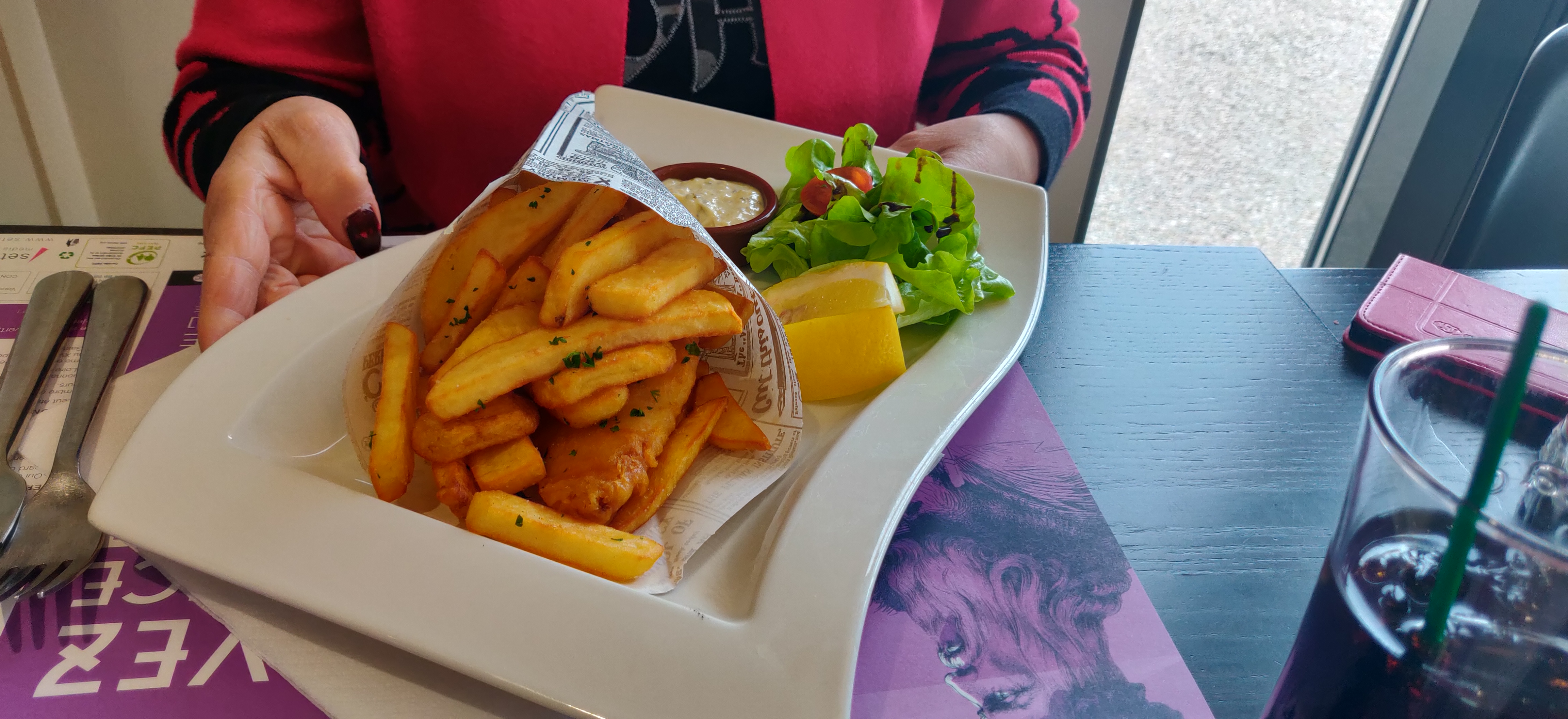 Plat du jour dos de colin dur sans goût, fish n chips gras et sans goût merci le citron pour un peu de saveur, frites grasses, dessert tarte aux pommes avec un coulis rouge sucré jeter dessus... Bref pour une personne qui n'y connait rien en cuisine OK dans le cas contraire je ne recommande pas... Désolé