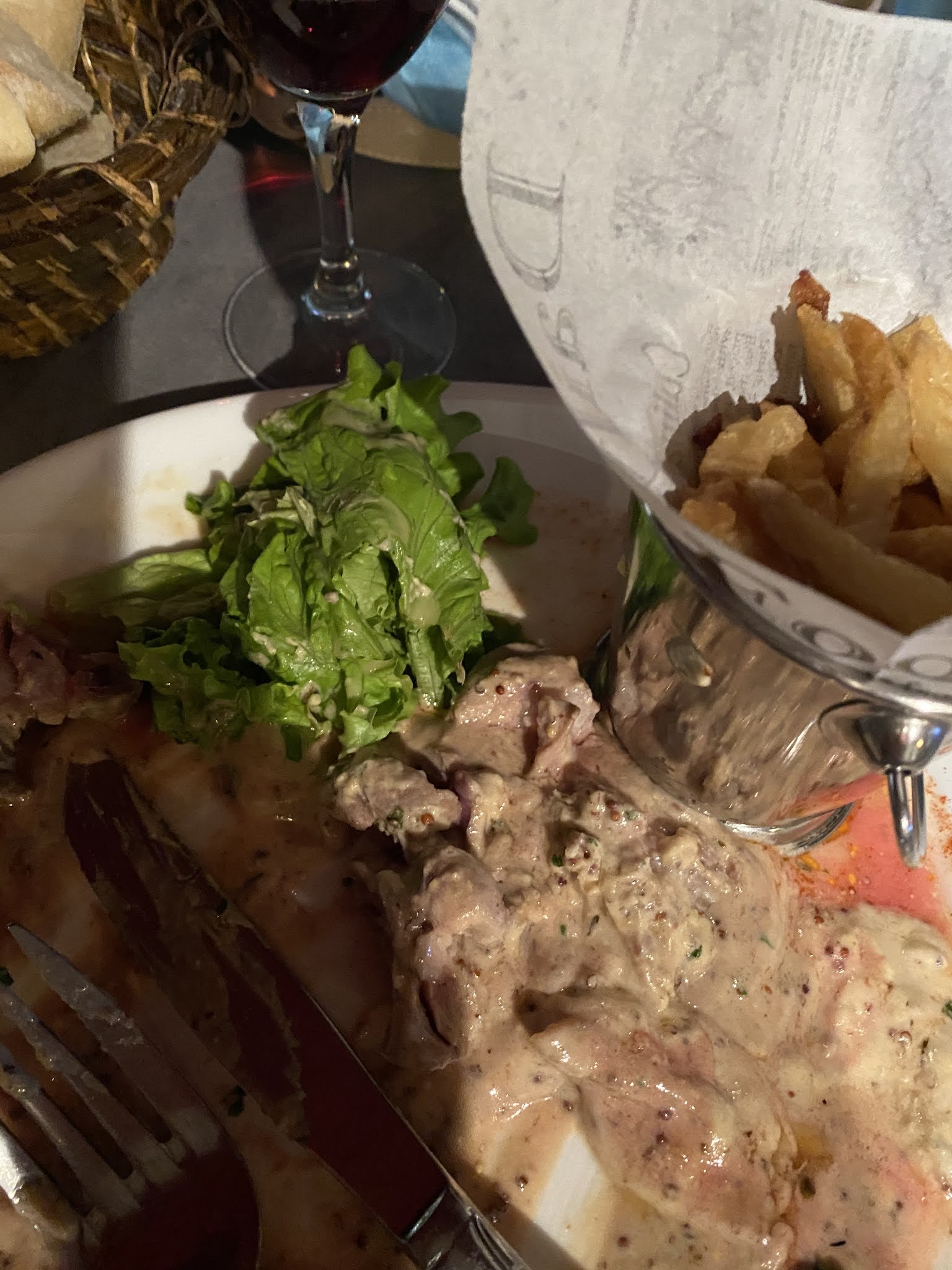 a fuir . j'ai détesté et suis partie sans prendre de dessert tellement c’était infect. j'ai pris de rognon, il était fait en 2 minutes chrono, j’étais à peine assise et pas encore bu mon porto ! ils etaient froids, 2 vieilles feuilles de salade avec des la sauce versée dessus donc pas mélangée et idem pour les rognons, sauce bizarre versée dessus , et frites bien bien grasse .