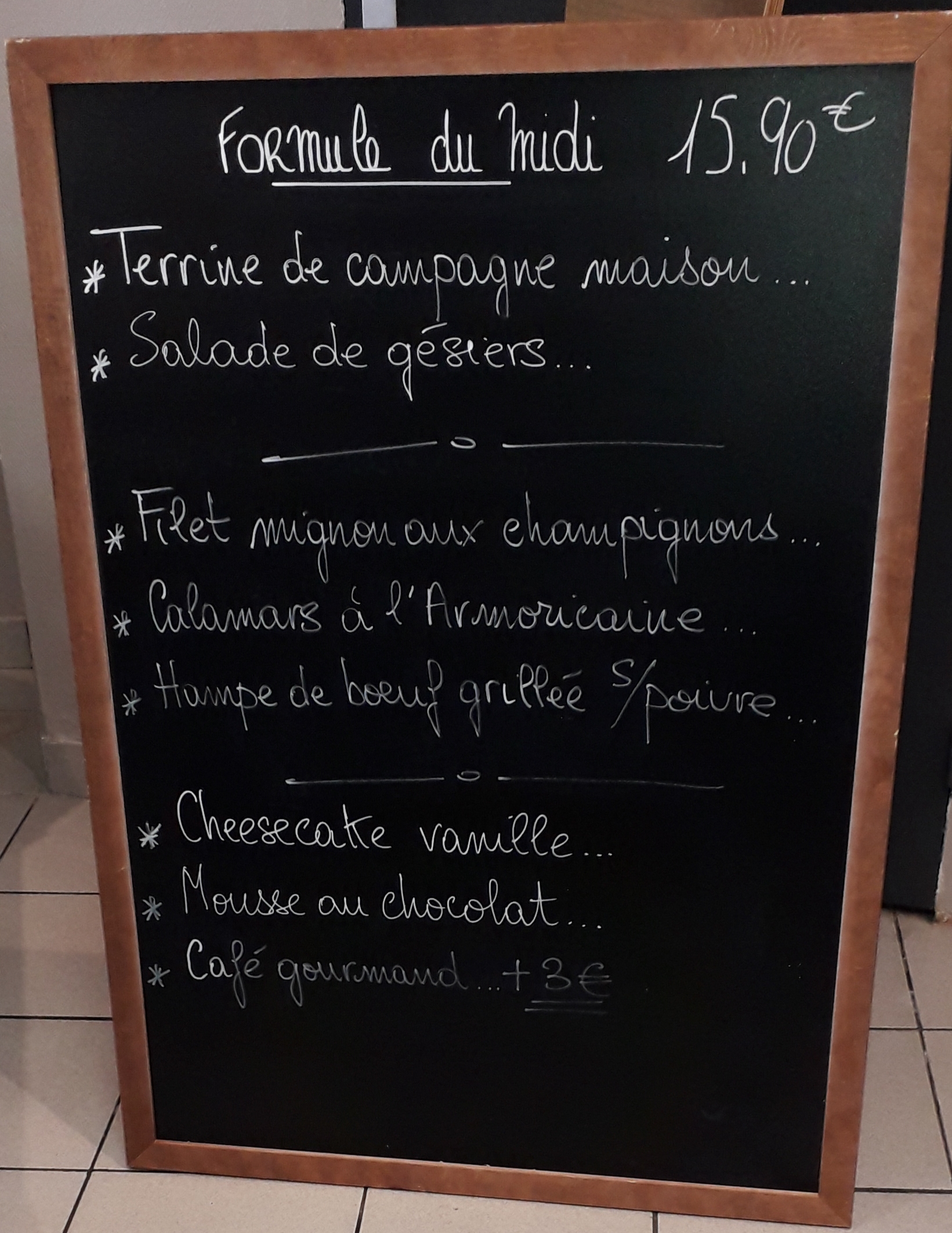 Il y a 2 mois rien a redire aujourd'hui le 5 juillet j y suis allée avec ma fille et ses 2 enfants au moment du dessert avec le menu enfant il n y avait plus de fromage blanc mais indiqué sur l ardoise donc on demande une petite mousse au chocolat la serveuse nous dit que c est la seule et dernière fois que la mousse au chocolat sera servie lorsque nous avons entendu ses propos très désagréable nous n avons pas pris de dessert au moment de partir ma fille a dit 3 fois a la serveuse au revoir qui a tout juste daigné répondre désormais on ira ailleurs ce jour là les patrons n étaient pas là Aujourd'hui 23 août j ai croisé le patron qui d un air désagréable me dit vous n avez pas honte de me parler avec l avis que vous avez mis Mon avis n est que reflet du jour où on a déjeuné il faut accepter la critique Monsieur lorsque vous regardez les avis moins bons je ne suis pas la seule