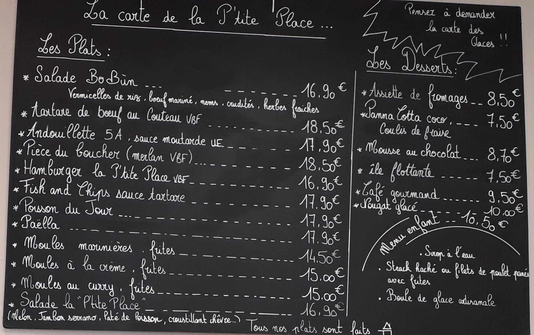 Nous y sommes allés à 2 reprises dans ce restaurant. Le personnel est au top, avec une débauche d’énergie, malgré les chaleurs, ils font les 💯 pas … mais toujours avec le sourire et l’entente dans l’équipe semble est être nickel … je recommande … au vue de la carte proposée, les produits sont frais et préparés maison, contrairement à des établissements qui ont des cartes à ne plus en finir. Pas de prise de réservation. Plein de bonnes choses pour la suite au restaurant « la p’tite place »