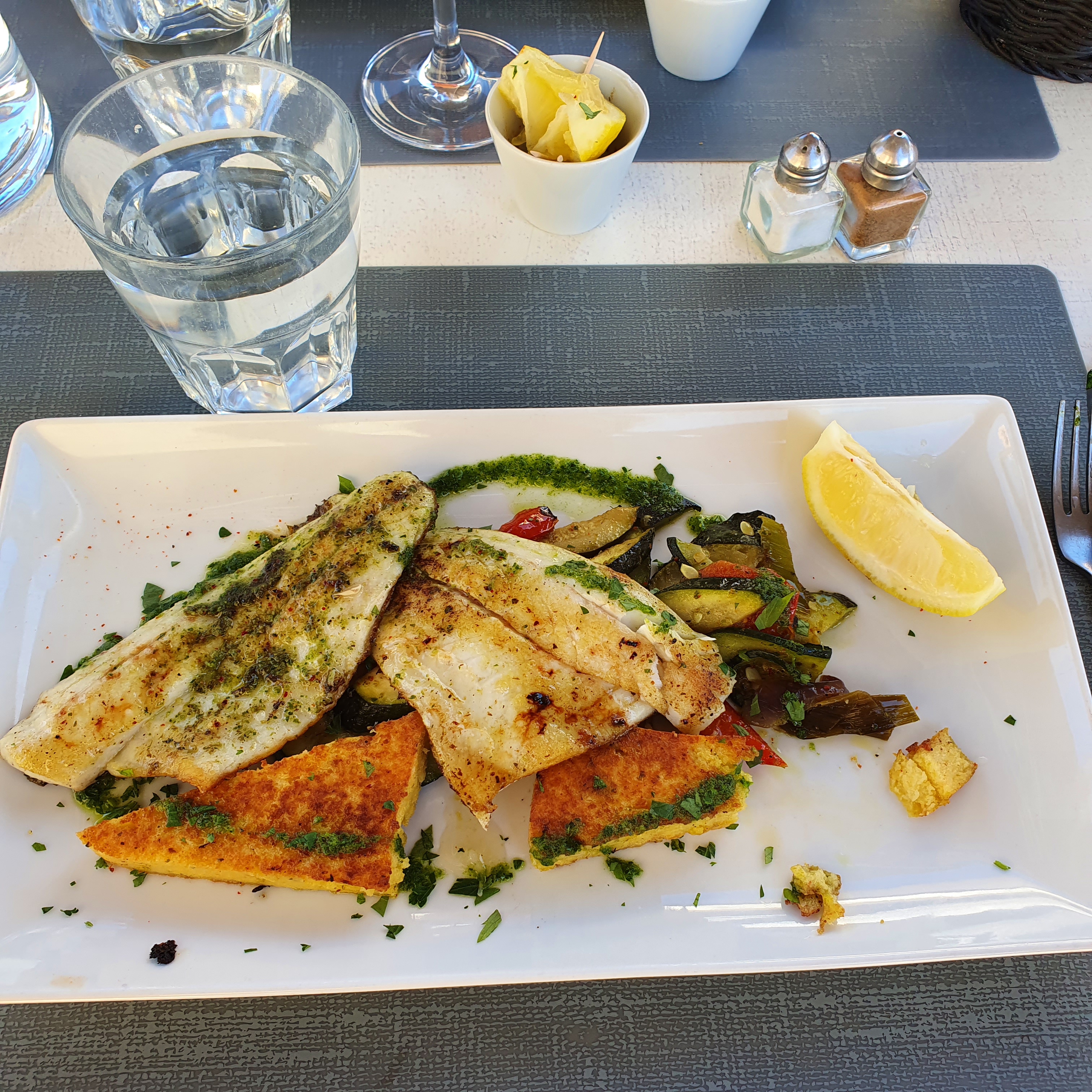 Bien décevant ! Je mets deux étoiles car le service était sympa et correct. Sinon. Ça mérite un Zéro pour l'assiette. Un poisson mal cuit ou recuit accompagné de pauvres légumes que même Flunch ne servirait pas ... Très désolant surtout a plus de 20€ l'assiette. C'est de l'abus ! A éviter dans ces conditions même si la terrasse est attirante. Seul point positif le vin blanc en carafe était bon.